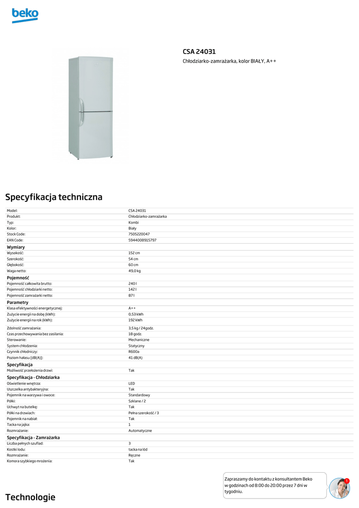 CSA 24031 Chłodziarko-zamrażarka, kolor BIAŁY, A++ Specyfikacja techniczna Model: CSA 24031 Produkt: Chłodziarko-zamrażarka Typ: Kombi Kolor: Biały Stock Code: 7505220047 EAN Code: 5944008915797 Wymiary Wysokość: 152 cm Szerokość: 54 cm Głębokość: 60 cm Waga netto: 49,0 kg Pojemność Pojemność całkowita brutto: 240 l Pojemność chłodziarki netto: 142 l Pojemność zamrażarki netto: 87 l Parametry Klasa efektywności energetycznej: A++ Zużycie energii na dobę (kWh): 0,53 kWh Zużycie energii na rok (kWh): 192 kWh Zdolność zamrażania: 3,5 kg / 24godz. Czas przechowywania bez zasilania: 18 godz. Sterowanie: Mechaniczne System chłodzenia: Statyczny Czynnik chłodniczy: R600a Poziom hałasu [dB(A)]: 41 dB(A) Specyfikacja Możliwość przełożenia drzwi: Tak Specyfikacja - Chłodziarka Oświetlenie wnętrza: LED Uszczelka antybakteryjna: Tak Pojemnik na warzywa i owoce: Standardowy Półki: Szklane / 2 Uchwyt na butelkę: Tak Półki na drzwiach: Pełna szerokość / 3 Pojemnik na nabiał: Tak Tacka na jajka: 1 Rozmrażanie: Automatyczne Specyfikacja - Zamrażarka Liczba pełnych szuflad: 3 Kostki lodu: tacka na lód Rozmrażanie: Ręczne Komora szybkiego mrożenia: Tak Technologie Zapraszamy do kontaktu z konsultantem Beko w godzinach od 8:00 do 20:00 przez 7 dni w tygodniu. 1 Szybkie Mrożenie Zapewnia szybkie zmrażanie nowo włożonego pożywienia, w sposób zdrowszy oraz nie wpływający na temperaturę wcześniej przechowywanego jedzenia. Przezroczyste Szuflady Zamrażalnika Przednia część szuflady zamrażalnika zrobiona jest z przeźroczystego materiału tak, że doskonale widać, jakie produkty znajdują się w środku szuflady bez konieczności wysuwania jej. Pojemnik na nabiał Pojemnik umieszczony na górze drzwi chłodziarki, dzięki przeźroczystym ściankom zapewnia idealne miejsce do przechowywania produktów mlecznych, chroniąc je przed wyschnięciem. Uchwyt na butelki Uchwyt na butelki zawieszony obok szklanych półek jest idealnym rozwiązaniem na wykorzystanie przestrzeni pomiędzy dwiema pólkami. Klasa energetyczna A++ Dzięki zastosowaniu najnowszej technologii produkty z klasą efektywności energetycznej A++ to gwarancja bardzo niskiego zużycia energii, a produkty w tej klasie nie tylko pomogą podreperować budżet rodzinny, ale również dbają o środowisko naturalne. Oświetlenie LED Oświetlenie LED jest bardziej energooszczędne i daje bardziej naturalne światło w porównaniu do zwykłego oświetlenia. To kolejny krok do przodu w celu bardziej ekologicznych działań. Uszczelka antybakteryjna - chłodzenie Uszczelki w drzwiach zwykle trudno utrzymać w czystości, co czyni z nich doskonałe środowisko dla rozwoju bakterii. Dzięki dodatkowi substancji antybakteryjnych, uszczelki nie tylko same pozostają wolne od drobnoustrojów, ale tworzą antybakteryjną barierę chroniącą wnętrze chłodziarki przed niepożądanymi mikroorganizmami.