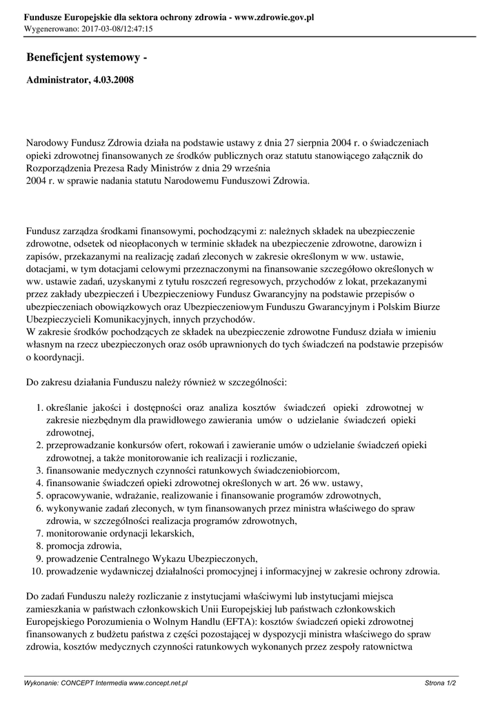 Fundusze Europejskie dla sektora ochrony zdrowia - www.zdrowie.gov.pl Wygenerowano: 2017-03-08/12:47:15 Beneficjent systemowy Administrator, 4.03.2008 Narodowy Fundusz Zdrowia działa na podstawie ustawy z dnia 27 sierpnia 2004 r. o świadczeniach opieki zdrowotnej finansowanych ze środków publicznych oraz statutu stanowiącego załącznik do Rozporządzenia Prezesa Rady Ministrów z dnia 29 września 2004 r. w sprawie nadania statutu Narodowemu Funduszowi Zdrowia. Fundusz zarządza środkami finansowymi, pochodzącymi z: należnych składek na ubezpieczenie zdrowotne, odsetek od nieopłaconych w terminie składek na ubezpieczenie zdrowotne, darowizn i zapisów, przekazanymi na realizację zadań zleconych w zakresie określonym w ww. ustawie, dotacjami, w tym dotacjami celowymi przeznaczonymi na finansowanie szczegółowo określonych w ww. ustawie zadań, uzyskanymi z tytułu roszczeń regresowych, przychodów z lokat, przekazanymi przez zakłady ubezpieczeń i Ubezpieczeniowy Fundusz Gwarancyjny na podstawie przepisów o ubezpieczeniach obowiązkowych oraz Ubezpieczeniowym Funduszu Gwarancyjnym i Polskim Biurze Ubezpieczycieli Komunikacyjnych, innych przychodów. W zakresie środków pochodzących ze składek na ubezpieczenie zdrowotne Fundusz działa w imieniu własnym na rzecz ubezpieczonych oraz osób uprawnionych do tych świadczeń na podstawie przepisów o koordynacji. Do zakresu działania Funduszu należy również w szczególności: 1. określanie jakości i dostępności oraz analiza kosztów świadczeń opieki zdrowotnej w zakresie niezbędnym dla prawidłowego zawierania umów o udzielanie świadczeń opieki zdrowotnej, 2. przeprowadzanie konkursów ofert, rokowań i zawieranie umów o udzielanie świadczeń opieki zdrowotnej, a także monitorowanie ich realizacji i rozliczanie, 3. finansowanie medycznych czynności ratunkowych świadczeniobiorcom, 4. finansowanie świadczeń opieki zdrowotnej określonych w art. 26 ww. ustawy, 5. opracowywanie, wdrażanie, realizowanie i finansowanie programów zdrowotnych, 6. wykonywanie zadań zleconych, w tym finansowanych przez ministra właściwego do spraw zdrowia, w szczególności realizacja programów zdrowotnych, 7. monitorowanie ordynacji lekarskich, 8. promocja zdrowia, 9. prowadzenie Centralnego Wykazu Ubezpieczonych, 10. prowadzenie wydawniczej działalności promocyjnej i informacyjnej w zakresie ochrony zdrowia. Do zadań Funduszu należy rozliczanie z instytucjami właściwymi lub instytucjami miejsca zamieszkania w państwach członkowskich Unii Europejskiej lub państwach członkowskich Europejskiego Porozumienia o Wolnym Handlu (EFTA): kosztów świadczeń opieki zdrowotnej finansowanych z budżetu państwa z części pozostającej w dyspozycji ministra właściwego do spraw zdrowia, kosztów medycznych czynności ratunkowych wykonanych przez zespoły ratownictwa Wykonanie: CONCEPT Intermedia www.concept.net.pl Strona 1/2 Fundusze Europejskie dla sektora ochrony zdrowia - www.zdrowie.gov.pl Wygenerowano: 2017-03-08/12:47:15 medycznego, o których mowa w ustawie z dnia 8 września 2006 r. o Państwowym Ratownictwie Medycznym, z wyłączeniem kosztów medycznych czynności ratunkowych wykonywanych przez lotnicze zespoły ratownictwa medycznego - w stosunku do osób uprawnionych do tych świadczeń na podstawie przepisów o koordynacji. Wykonanie: CONCEPT Intermedia www.concept.net.pl Strona 2/2
