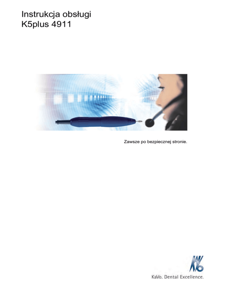 Instrukcja obsługi K5plus 4911 Zawsze po bezpiecznej stronie. Dystrybucja: KaVo Dental GmbH Bismarckring 39 D-88400 Biberach Tel. +49 7351 56-0 Faks +49 7351 56-1488 Producent: Kaltenbach & Voigt GmbH Bismarckring 39 D-88400 Biberach www.kavo.com Instrukcja obsługi K5plus 4911 Spis treści Spis treści 1 Wskazówki dla użytkownika ...................................................................................................................... 2 1.1 Serwis .............................................................................................................................................. 2 1.2 Instrukcje dla użytkownika ............................................................................................................... 2 1.2.1 Skróty ................................................................................................................................. 2 1.2.2 Symbole ............................................................................................................................. 2 1.2.3 Grupa docelowa ................................................................................................................ 3 1.3 Warunki gwarancji ........................................................................................................................... 3 1.4 Transport i przechowywanie ............................................................................................................ 3 1.4.1 Aktualnie obowiązujące rozporządzenie w sprawie opakowań .......................................... 3 1.4.2 Szkody transportowe .......................................................................................................... 4 1.4.3 Dane na opakowaniu: magazynowanie i transport ............................................................. 5 2 Bezpieczeństwo ........................................................................................................................................ 6 2.1 Opis wskazówek dotyczących bezpieczeństwa .............................................................................. 6 2.1.1 Symbol ostrzegawczy ......................................................................................................... 6 2.1.2 Struktura ............................................................................................................................. 6 2.1.3 Opis poziomów zagrożenia ................................................................................................ 6 2.2 Przeznaczenie – zastosowanie zgodne z przeznaczeniem ............................................................ 6 2.2.1 Informacje ogólne ............................................................................................................... 6 2.2.2 Dane specyficzne dla produktu .......................................................................................... 7 2.2.3 Utylizacja urządzeń elektronicznych i elektrycznych .......................................................... 7 2.3 Wskazówki dotyczące bezpieczeństwa ........................................................................................... 8 2.3.1 Informacje ogólne ............................................................................................................... 8 2.3.2 Dane specyficzne dla produktu ........................................................................................ 10 3 Opis produktu .......................................................................................................................................... 11 3.1 Prostnica K5 plus 4911 ................................................................................................................. 11 3.2 Zakres dostawy ............................................................................................................................. 11 3.3 Dane techniczne ........................................................................................................................... 12 4 Uruchomienie .......................................................................................................................................... 14 5 Obsługa ................................................................................................................................................... 15 5.1 Zakładanie/wymiana narzędzia ..................................................................................................... 15 5.2 Użytkowanie .................................................................................................................................. 15 6 Konserwacja i pielęgnacja ....................................................................................................................... 17 6.1 Czyszczenie .................................................................................................................................. 17 6.1.1 Cotygodniowe czyszczenie zacisku i części prostnicy ..................................................... 17 6.2 Konserwacja .................................................................................................................................. 19 6.2.1 Wymiana łożyska kulkowego ........................................................................................... 19 6.2.2 Wymiana przewodu .......................................................................................................... 22 7 Usuwanie usterek .................................................................................................................................... 23 8 Wyposażenie dodatkowe ........................................................................................................................ 25 9 Deklaracja zgodności .............................................................................................................................. 26 10 Części zamienne ....................................
