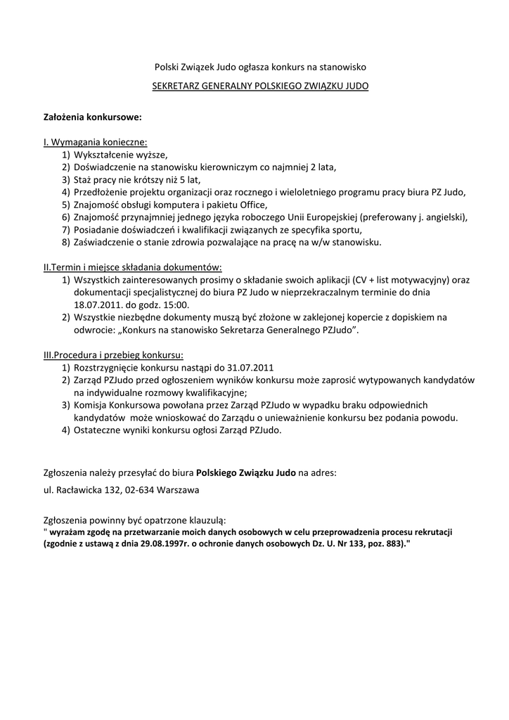 Polski Związek Judo ogłasza konkurs na stanowisko SEKRETARZ GENERALNY POLSKIEGO ZWIĄZKU JUDO Założenia konkursowe: I. Wymagania konieczne: 1) Wykształcenie wyższe, 2) Doświadczenie na stanowisku kierowniczym co najmniej 2 lata, 3) Staż pracy nie krótszy niż 5 lat, 4) Przedłożenie projektu organizacji oraz rocznego i wieloletniego programu pracy biura PZ Judo, 5) Znajomość obsługi komputera i pakietu Office, 6) Znajomość przynajmniej jednego języka roboczego Unii Europejskiej (preferowany j. angielski), 7) Posiadanie doświadczeń i kwalifikacji związanych ze specyfika sportu, 8) Zaświadczenie o stanie zdrowia pozwalające na pracę na w/w stanowisku. II.Termin i miejsce składania dokumentów: 1) Wszystkich zainteresowanych prosimy o składanie swoich aplikacji (CV + list motywacyjny) oraz dokumentacji specjalistycznej do biura PZ Judo w nieprzekraczalnym terminie do dnia 18.07.2011. do godz. 15:00. 2) Wszystkie niezbędne dokumenty muszą być złożone w zaklejonej kopercie z dopiskiem na odwrocie: „Konkurs na stanowisko Sekretarza Generalnego PZJudo”. III.Procedura i przebieg konkursu: 1) Rozstrzygnięcie konkursu nastąpi do 31.07.2011 2) Zarząd PZJudo przed ogłoszeniem wyników konkursu może zaprosić wytypowanych kandydatów na indywidualne rozmowy kwalifikacyjne; 3) Komisja Konkursowa powołana przez Zarząd PZJudo w wypadku braku odpowiednich kandydatów może wnioskować do Zarządu o unieważnienie konkursu bez podania powodu. 4) Ostateczne wyniki konkursu ogłosi Zarząd PZJudo. Zgłoszenia należy przesyłać do biura Polskiego Związku Judo na adres: ul. Racławicka 132, 02-634 Warszawa Zgłoszenia powinny być opatrzone klauzulą: " wyrażam zgodę na przetwarzanie moich danych osobowych w celu przeprowadzenia procesu rekrutacji (zgodnie z ustawą z dnia 29.08.1997r. o ochronie danych osobowych Dz. U. Nr 133, poz. 883)."