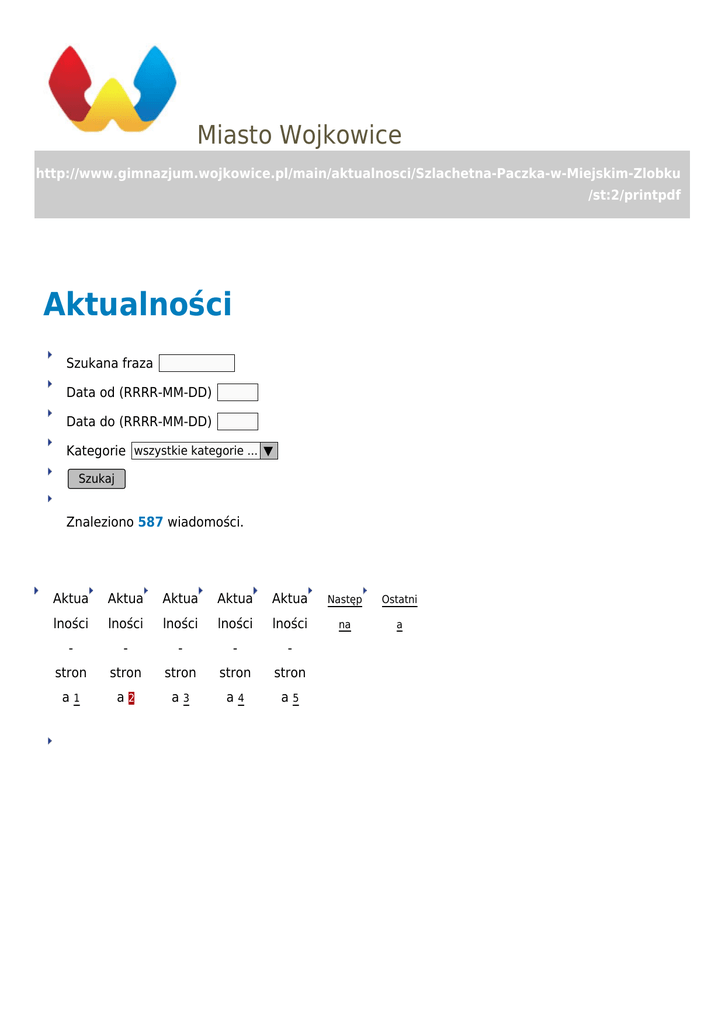 Miasto Wojkowice http://www.gimnazjum.wojkowice.pl/main/aktualnosci/Szlachetna-Paczka-w-Miejskim-Zlobku /st:2/printpdf Aktualności Szukana fraza Data od (RRRR-MM-DD) Data do (RRRR-MM-DD) Kategorie wszystkie kategorie ... ▼ Szukaj Znaleziono 587 wiadomości. Aktua Aktua Aktua Aktua Aktua Następ Ostatni lności lności lności lności lności na a - - - - - stron stron stron stron stron a1 a2 a3 a4 a5 2017-02-15 kategoria: Zagrożenie ptasią grypą Wojkowice Podczas posiedzenie Powiatowego Zespołu Zarządzania Kryzysowego w Będzinie dnia 11 lutego 2017 r. zapoznano z lokalizacją ognisk wysoce zjadliwej grypy ptaków (H5N8) w miejscowości Chruszczobród, gm. Łazy, powiat zawierciański. 2017-02-14 I Sesja Wojkowickiej Rady Seniorek i Seniorów kategoria: Wojkowice 13 lutego w sali ślubów Urzędu Miasta w Wojkowicach odbyła się I sesja Wojkowickiej Rady Seniorek i Seniorów pierwszej kadencji. 2017-02-14 kategoria: Konkurs Walentynkowy rozstrzygnięty! Wojkowice Zapraszamy wszystkich do udziału w Konkursie Walentynkowym! Wystarczy udzielić poprawnej odpowiedzi na zadane pytania, aby wziąć dzisiaj udział w losowaniu niesamowitych nagród. 2017-02-13 Po spotkaniu z Marzeną Kipiel-Sztuką kategoria: Wojkowice Gościem Miejskiego Ośrodka Kultury w niedzielne popołudnie była popularna serialowa aktorka – Marzena Kipiel-Sztuka. Artystka spotkała się z mieszkańcami Wojkowic w sali widowiskowej MOK-u i opowiadała o swoich doświadczeniach w pracy aktorskiej, anegdotach z planu filmowego oraz przeróżnych ciekawostkach, które mogły zainteresować zgromadzoną publiczność. 2017-02-13 kategoria: Otwarty konkurs ofert Wojkowice Biuro ds. Pozyskiwania Środków Zewnętrznych, Promocji Miasta i Obsługi Inwestora informuję iż od 13.02.2017 do 10.03.2017 trwa otwarty konkursu ofert na realizacje zadania „Wspieranie i upowszechnianie kultury fizycznej”. 2017-02-13 Konsultacje o możliwościach pozyskania środków unijnych 2014-2020 dla przedsiębiorców kategoria: Wojkowice Urząd Miasta w Wojkowicach oraz Lokalny Punkt Informacyjny Funduszy Europejskich w Sosnowcu zapraszają do skorzystania z Mobilnego Punktu Informacyjnego. 2017-02-09 kategoria: Kolejne środki zewnętrzne pozyskane! Wojkowice Udało się pozyskać kolejne środki zewnętrzne. Tym razem są to pieniądze, które zostaną przeznaczone na zapewnienie funkcjonowania miejsc opieki nad dziećmi w Miejskim Żłobku "Figielkowo". 2017-02-02 Wizyta delegacji z naszej partnerskiej Gminy Łapsze Niżne kategoria: Wojkowice W ubiegły weekend mieliśmy zaszczyt gościć w naszej Gminie delegację z Gminy Partnerskiej Łapsze Niżne – Wojkowice odwiedził Wójt Jakub Jamróz, Przewodniczący Rady Gminy Zdzisław Majerczak, Zastępca Przewodniczącego Rady Jan Noworolski, Radny Tomasz Markowicz, Radny Jan Stańczak, Radny Józef Prelich, Radny Antoni Szewczyk. 2017-02-02 kategoria: Spotkanie Noworoczne 2017 Wojkowice 27 stycznia br. w MOK w Wojkowicach odbyło się III Spotkanie Noworoczne, które zostało uświetnione przez wielu znamienitych gości z terenu województwa śląskiego, ale także przedstawicieli Naszej gminy partnerskiej Gmina Łapsze Niżne. Był to czas podsumowania 2016 r. i inwestycji towarzyszących, ale i prezentacji planowanych działań na rok 2017. 2017-02-01 Uwaga na śliskie drogi i chodniki !! kategoria: Wojkowice Instytut Meteorologii wydał alerty pierwszego stopnia dla Polski centralnej, południowej i wschodniej. Alerty obowiązują w województwach - podlaskim, mazowieckim, łódzkim, opolskim, śląskim, świętokrzyskim, lubelskim, małopolskim, podkarpackim. W dużej części kraju występują marznące opady, które skutkują gołoledzią. Na drogach może być bardzo ślisko. Aktua Aktua Aktua Aktua Aktua Następ Ostatni lności lności lności lności lności na a - - - - - stron stron stron stron stron a1 a2 a3 a4 a5
