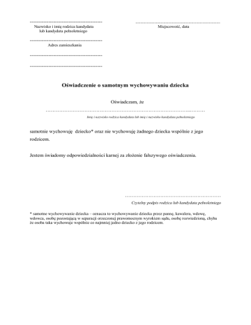 ------------------------------------------Nazwisko i imię rodzica kandydata lub kandydata pełnoletniego ................................................................... Miejscowość, data ------------------------------------------Adres zamieszkania ------------------------------------------------------------------------------------- Oświadczenie o samotnym wychowywaniu dziecka Oświadczam, że …………………………………………………………………………..……… Imię i nazwisko rodzica kandydata lub imię i nazwisko kandydata pełnoletniego samotnie wychowuję dziecko* oraz nie wychowuję żadnego dziecka wspólnie z jego rodzicem. Jestem świadomy odpowiedzialności karnej za złożenie fałszywego oświadczenia. ………………………………………………… Czytelny podpis rodzica lub kandydata pełnoletniego * samotne wychowywanie dziecka – oznacza to wychowywanie dziecka przez pannę, kawalera, wdowę, wdowca, osobę pozostającą w separacji orzeczonej prawomocnym wyrokiem sądu, osobę rozwiedzioną, chyba że osoba taka wychowuje wspólnie co najmniej jedno dziecko z jego rodzicem.