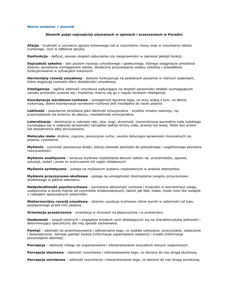 Warto wiedzieć / słownik Słownik pojęć najczęściej używanych w opiniach i orzeczeniach w Poradni. Afazja - trudność w używaniu języka mówionego lub w rozumieniu mowy oraz w rozumieniu tekstu czytanego, czyli w odbiorze języka. Dysfunkcja - deficyt, pewien stopień zaburzenia czy niesprawności w zakresie jakiejś funkcji. Dojrzałość szkolna - taki poziom rozwoju umysłowego i społecznego, którego osiągnięcie umożliwia dziecku sprostanie wymaganiom szkoły, skuteczne przyswajanie wiedzy szkolnej i prawidłowe funkcjonowanie w sytuacjach szkolnych. Harmonijny rozwój umysłowy - dziecko funkcjonuje na podobnym poziomie w różnych zadaniach, które angażują rozmaite sfery działalności umysłowej. Inteligencja - ogólna zdolność umysłowa wpływająca na stopień sprawności działań wymagających udziału procesów uczenia się i myślenia, mierzy się go z reguły ilorazem inteligencji. Koordynacja wzrokowo-ruchowa - umiejętność łączenia tego, co oczy widzą z tym, co dłonie wykonują; dobra koordynacja wzrokowo-ruchowa jest niezbędna do nauki pisania . Labilność - popularnie określana jako labilność emocjonalna - szybkie zmiany nastroju, np. przechodzenie od śmiechu do płaczu; niestabilność emocjonalna. Lateralizacja - dominacja w zakresie ręki, oka, nogi; stronność, czynnościowa asymetria ciała ludzkiego wyrażająca się w większej sprawności narządów jednej strony ciała, prawej lub lewej. Może być prawo lub lewostronna albo skrzyżowana. Motoryka mała- drobne, zręczne, precyzyjne ruchy; zwykle dotyczące sprawności manualnych np. pisania, rysowania. Myślenie - czynność poznawcza dzięki, której człowiek dochodzi do pośredniego i uogólnionego poznania rzeczywistości. Myślenie analityczne - oznacza myślowe rozdzielanie danych całości np. przedmiotów, zjawisk, sytuacji, zadań i przez to wykrywanie ich części składowych. Myślenie syntetyczne - polega na myślowym scalaniu rozdzielonych w analizie elementów. Myślenie przyczynowo-skutkowe - polega na umiejętności dostrzeżenia związku przyczynowoskutkowego w jakimś zdarzeniu. Nadpobudliwość psychoruchowa - wzmożona aktywność ruchowa i trudności w koncentracji uwagi, uzależniona w dużej mierze od czynników środowiskowych, takich jak tłok, hałas, może mieć też związek z rodzajem spożywanych pokarmów. Nieharmonijny rozwój umysłowy - dziecko uzyskuje krańcowo różne wyniki w zależności od typu postawionego przed nim zadania . Orientacja przestrzenna - orientacja w stronach na płaszczyźnie i w przestrzeni. Osobowość - zespół istotnych i względnie trwałych cech składających się na charakterystykę jednostki i determinujący specyficzny dla niej sposób zachowania. Pamięć - zdolność do przechowywania i odtwarzania tego, co zostało usłyszane, przeczytane, zobaczone i doświadczone. Istnieje pamięć świeża (informacje zapamiętane ostatnio) i trwała (informacje przyswojone dawniej) . Percepcja - zdolność mózgu do organizowania i interpretowania wszystkich danych wejściowych. Percepcja słuchowa - zdolność rozumienia i interpretowania tego, co dociera do nas drogą słuchową. Percepcja wzrokowa - zdolność rozumienia i interpretowania tego, co dociera do nas drogą wzrokową. Rozumowanie arytmetyczne - zrozumienie słownie sformułowanego problemu i wykonanie odpowiednich operacji liczbowych „ w głowie". Rozumienie norm społeczno-moralnych - wiedza o społecznie akceptowanych sposobach zachowania. Samoocena - element charakteru człowieka, stanowi system ustosunkowań do samego siebie. Spostrzegawczość - umiejętność zwracania uwagi na szczegóły, dostrzegania nowych elementów. Sprawność manualna i graficzna - sprawność rąk w zakresie m.in. pisania, wycinania nożyczkami, zapinania guzików, wiązania sznurówek, nawlekania korali lub igły itp. Uwaga - proces polegający na koncentracji czynności na określonym zadaniu, przedmiocie . Zdolność uogólniania i klasyfikowania - polega na ujmowaniu właściwości i cech wspólnych dla zjawisk, przedmiotów, stanów; łatwiejsze jest ujmowanie różnic niż podobieństw.