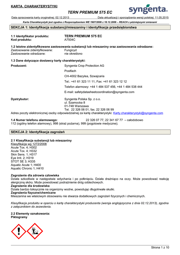 KARTA CHARAKTERYSTYKI TERN PREMIUM 575 EC Data opracowania karty oryginalnej: 02.12.2013 Data aktualizacji i sporządzenia wersji polskiej: 11.05.2015 Karta Charakterystyki jest zgodna z Rozporządzeniem WE 1907/2006 z 18.12.2006 – REACH z późniejszymi zmianami SEKCJA 1: Identyfikacja substancji/mieszaniny i identyfikacja przedsiębiorstwa 1.1 Identyfikator produktu: Kod produktu: TERN PREMIUM 575 EC A7504C 1.2 Istotne zidentyfikowane zastosowania substancji lub mieszaniny oraz zastosowania odradzane: Zastosowanie zidentyfikowane: Fungicyd Zastosowanie odradzane: nie określono 1.3 Dane dotyczące dostawcy karty charakterystyki: Producent: Syngenta Crop Protection AG Postfach CH-4002 Bazylea, Szwajcaria Tel.: +41 61 323 11 11, Fax: +41 61 323 12 12 Telefon alarmowy: +44 1 484 537 456, +44 1 484 538 444 E-mail: [email protected] Dystrybutor: Syngenta Polska Sp. z o.o. ul. Szamocka 8 01-748 Warszawa Tel. 22 326 06 01, fax. 22 326 06 99 Adres poczty elektronicznej osoby odpowiedzialnej za kartę charakterystyki: [email protected] 1.4 Numer telefonu alarmowego: 22 326 07 77, 22 341 67 77 – całodobowo 112 (ogólny telefon alarmowy), 998 (straż pożarna), 999 (pogotowie medyczne); SEKCJA 2: Identyfikacja zagrożeń 2.1 Klasyfikacja substancji lub mieszaniny Klasyfikacja wg 1272/2008 Acute Tox. 4; H302 Acute Tox. 4; H332 Skin Sens. 1; H317 Eye Irrit. 2; H319 STOT SE 3; H335 Aquatic Acute 1; H400 Aquatic Chronic 1; H410 Zagrożenie dla zdrowia człowieka Działa szkodliwie w następstwie wdychania i po połknięciu. Działa drażniąco na oczy. Może powodować reakcję alergiczną skóry. Może powodować podrażnienie dróg oddechowych. Zagrożenie dla środowiska Działa bardzo toksycznie na organizmy wodne, powodując długotrwałe skutki. Zagrożenia fizyczne/chemiczne Mieszanina we właściwym stosowaniu nie stwarza dodatkowych zagrożeń fizycznych i chemicznych. Klasyfikacja produktu w oparciu o kartę charakterystyki producenta (wersja anglojęzyczna z dnia 02.12.2013), zgodna z załącznikiem do zezwolenia. 2.2 Elementy oznakowania: Piktogramy Strona 1 z 10 KARTA CHARAKTERYSTYKI TERN PREMIUM 575 EC Data opracowania karty oryginalnej: 02.12.2013 Data aktualizacji i sporządzenia wersji polskiej: 11.05.2015 Karta Charakterystyki jest zgodna z Rozporządzeniem WE 1907/2006 z 18.12.2006 – REACH z późniejszymi zmianami Hasło ostrzegawcze: Uwaga Zwroty wskazujące rodzaj zagrożenia: H302 – Działa szkodliwie po połknięciu. H317 – Może powodować reakcję alergiczną skóry. H319 – Działa drażniąco na oczy. H332 – Działa szkodliwie w następstwie wdychania H335 – Może powodować podrażnienia dróg oddechowych H410 – Działa bardzo toksycznie na organizmy wodne, powodując długotrwałe skutki. Zwroty określające warunki bezpiecznego stosowania: P261 – Unikać wdychania pyłu/dymu/gazu/mgły/par/rozpylonej cieczy. P280 – Stosować rękawice ochronne/odzież ochronną/ ochronę oczu/ochronę twarzy. P302+P352 – W PRZYPADKU DOSTANIA SIĘ NA SKÓRĘ: Umyć dużą ilością wody z mydłem. P305+P351+P338 – W PRZYPADKU DOSTANIA SIĘ DO OCZU: Ostrożnie płukać wodą przez kilka minut. Wyjąć soczewki kontaktowe, jeżeli są i można je łatwo usunąć. Nadal płukać. P333+P313 – W przypadku wystąpienia podrażnienia skóry lub wysypki: Zasięgnąć porady/ zgłosić się pod opiekę lekarza. P337+P313 – W przypadku utrzymywania się działania drażniącego na oczy: Zasięgnąć porady/zgłosić się pod opiekę lekarza. Zebrać wyciek. EUH401 – W celu uniknięcia zagrożeń dla zdrowia ludzi i środowiska, należy postępować zgodnie z instrukcją użycia EUH066 – Powtarzające się narażenie może powodować wysuszanie lub pękanie skóry Zawartość substancji czynnych: propikonazol (związek z grupy triazoli) – 125 g/l (12,8%), fenpropidyna (związek z grupy morfolin) – 450 g/l (45,9%). 2.3 Inne zagrożenia: Nie spełnia kryteriów PBT lub vPvB. SEKCJA 3: Skład/informacja o składnikach 3.1 Substancje: Nie dotyczy. 3.2 Mieszaniny: Niebezpieczne składniki: Identyfikator produktu Fenpropidyna CAS: 67306-00-7 WE: Nr indeksowy : Nr REACH: substancja podlega przepisom okresu przejściowego Propikonazol CAS: 60207-90-1 WE: 262-104-4 Nr indeksowy : 613-205-00-0 Nr REACH: substancja podlega przepisom okresu przejściowego Pełna treść zwrotów H w sekcji 16 Zawartość % 46 13 Klasyfikacja CLP Kody zwrotów Klasa zagrożenia i wskazujących kody kategorii rodzaj zagrożenia Acute Tox. 4 H312 Acute Tox. 4 H302 Eye Dam.1 H318 Skin Irrit. 2 H315 Skin Sens. 1 H317 STOT SE 3 H335 Aquatic Acute 1 H400 Aquatic Chronic 1 H410 Acute Tox. 4 Skin Sens. 1 Aquatic Acute 1 Aquatic Chronic 1 H302 H317 H400 H410 Strona 2 z 10 KARTA CHARAKTERYSTYKI TERN PREMIUM 575 EC Data opracowania karty oryginalnej: 02.12.2013 Data aktualizacji i sporządzenia wersji polskiej: 11.05.2015 Karta Charakterystyki jest zgodna z Rozporządzeniem WE 1907/2006 z 18.12.2006 – REACH z późniejszymi zmianami SEKCJA 4: Środki pierwszej pomocy 4.1 Opis środków pierwszej pomocy Uwagi ogólne W przypadku kontaktu na numer alarmowym firmy Syngenta lub centrum ostrych zatruć należy mieć przy sobie pojemnik produktu, etykietę lub niniejszą kartę charakterystyki. Narażenie inhalacyjne: W razie zawrotów głowy lub nudności wyprowadzić poszkodowanego na świeże powietrze. W przypadku zatrzymania oddechu zastosować sztuczne oddychanie. Zapewnić poszkodowanemu ciepło i warunki do odpoczynku. Skontaktować się z lekarzem lub centrum ostrych zatruć. W przypadku kontaktu ze skórą: Zdjąć zanieczyszczoną odzież, umyć zabrudzoną skórę i spłukać dokładnie wodą, w przypadku pojawienia się podrażnienia, rumieni skontaktować się z lekarzem. Zanieczyszczone ubranie uprać przed ponownym użyciem. W przypadku kontaktu z oczami: Upewnić się, że poszkodowany nie nosi szkieł kontaktowych – jeśli tak – wyjąć je. Przepłukać oczy przez kilkanaście minut