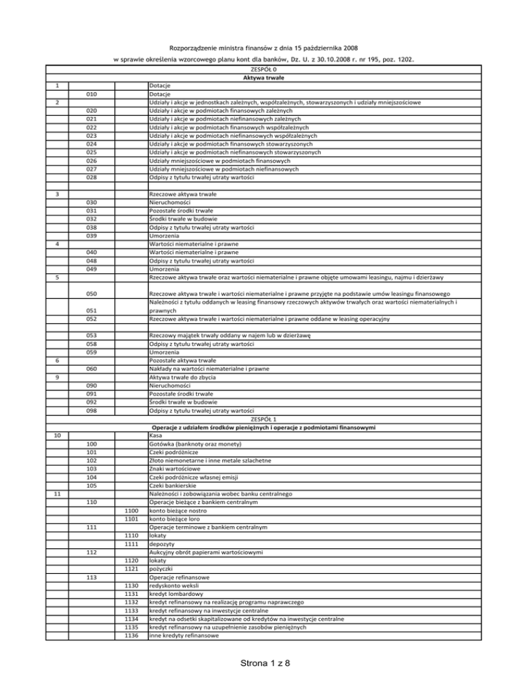 Rozporządzenie ministra finansów z dnia 15 października 2008 w sprawie określenia wzorcowego planu kont dla banków, Dz. U. z 30.10.2008 r. nr 195, poz. 1202. ZESPÓŁ 0 Aktywa trwałe 1 Dotacje Dotacje Udziały i akcje w jednostkach zależnych, współzależnych, stowarzyszonych i udziały mniejszościowe Udziały i akcje w podmiotach finansowych zależnych Udziały i akcje w podmiotach niefinansowych zależnych Udziały i akcje w podmiotach finansowych współzależnych Udziały i akcje w podmiotach niefinansowych współzależnych Udziały i akcje w podmiotach finansowych stowarzyszonych Udziały i akcje w podmiotach niefinansowych stowarzyszonych Udziały mniejszościowe w podmiotach finansowych Udziały mniejszościowe w podmiotach niefinansowych Odpisy z tytułu trwałej utraty wartości 010 2 020 021 022 023 024 025 026 027 028 3 Rzeczowe aktywa trwałe Nieruchomości Pozostałe środki trwałe Środki trwałe w budowie Odpisy z tytułu trwałej utraty wartości Umorzenia Wartości niematerialne i prawne Wartości niematerialne i prawne Odpisy z tytułu trwałej utraty wartości Umorzenia Rzeczowe aktywa trwałe oraz wartości niematerialne i prawne objęte umowami leasingu, najmu i dzierżawy 030 031 032 038 039 4 040 048 049 5 050 Rzeczowe aktywa trwałe i wartości niematerialne i prawne przyjęte na podstawie umów leasingu finansowego Należności z tytułu oddanych w leasing finansowy rzeczowych aktywów trwałych oraz wartości niematerialnych i prawnych Rzeczowe aktywa trwałe i wartości niematerialne i prawne oddane w leasing operacyjny 051 052 053 058 059 6 060 9 090 091 092 098 10 100 101 102 103 104 105 11 110 1100 1101 111 1110 1111 112 1120 1121 113 1130 1131 1132 1133 1134 1135 1136 Rzeczowy majątek trwały oddany w najem lub w dzierżawę Odpisy z tytułu trwałej utraty wartości Umorzenia Pozostałe aktywa trwałe Nakłady na wartości niematerialne i prawne Aktywa trwałe do zbycia Nieruchomości Pozostałe środki trwałe Środki trwałe w budowie Odpisy z tytułu trwałej utraty wartości ZESPÓŁ 1 Operacje z udziałem środków pieniężnych i operacje z podmiotami finansowymi Kasa Gotówka (banknoty oraz monety) Czeki podróżnicze Złoto niemonetarne i inne metale szlachetne Znaki wartościowe Czeki podróżnicze własnej emisji Czeki bankierskie Należności i zobowiązania wobec banku centralnego Operacje bieżące z bankiem centralnym konto bieżące nostro konto bieżące loro Operacje terminowe z bankiem centralnym lokaty depozyty Aukcyjny obrót papierami wartościowymi lokaty pożyczki Operacje refinansowe redyskonto weksli kredyt lombardowy kredyt refinansowy na realizację programu naprawczego kredyt refinansowy na inwestycje centralne kredyt na odsetki skapitalizowane od kredytów na inwestycje centralne kredyt refinansowy na uzupełnienie zasobów pieniężnych inne kredyty refinansowe Strona 1 z 8 1139 114 1140 1141 119 1190 1191 12 120 1200 1201 122 123 1230 124 1240 125 127 128 129 1290 1291 13 132 133 1330 134 1340 135 137 138 139 14 142 143 1430 144 1440 145 147 148 149 15 152 153 1530 154 1540 155 157 158 159 16 162 163 1630 164 1640 165 167 168 169 17 170 171 173 175 177 178 179 kredyty niespłacone w terminie Inne operacje z bankiem centralnym należności zobowiązania Odsetki od operacji z bankiem centralnym należności zobowiązania Należności normalne od podmiotów finansowych i rezerwy celowe Rachunki bieżące konto bieżące nostro konto bieżące loro Lokaty Kredyty i pożyczki różnica pomiędzy wartością nominalną a ceną nabycia Skupione wierzytelności różnica pomiędzy wartością nominalną a ceną nabycia Zrealizowane gwarancje Inne należności Rezerwy celowe Odsetki należności zobowiązania Należności pod obserwacją od podmiotów finansowych i rezerwy celowe Lokaty Kredyty i pożyczki różnica pomiędzy wartością nominalną a ceną nabycia Skupione wierzytelności różnica pomiędzy wartością nominalną a ceną nabycia Zrealizowane gwarancje Inne należności Rezerwy celowe Odsetki Należności poniżej standardu od podmiotów finansowych i rezerwy celowe Lokaty Kredyty i pożyczki różnica pomiędzy wartością nominalną a ceną nabycia Skupione wierzytelności różnica pomiędzy wartością nominalną a ceną nabycia Zrealizowane gwarancje Inne należności Rezerwy celowe Odsetki Należności wątpliwe od podmiotów finansowych i rezerwy celowe Lokaty Kredyty i pożyczki różnica pomiędzy wartością nominalną a ceną nabycia Skupione wierzytelności różnica pomiędzy wartością nominalną a ceną nabycia Zrealizowane gwarancje Inne należności Rezerwy celowe Odsetki Należności stracone od podmiotów finansowych i rezerwy celowe Lokaty Kredyty i pożyczki różnica pomiędzy wartością nominalną a ceną nabycia Skupione wierzytelności różnica pomiędzy wartością nominalną a ceną nabycia Zrealizowane gwarancje Inne należności Rezerwy celowe Odsetki Zobowiązania i pozostałe należności od podmiotów finansowych i rezerwy celowe Rachunki bieżące Depozyty terminowe i zablokowane Kredyty i pożyczki Należności i zobowiązania z tytułu zabezpieczeo pieniężnych Inne zobowiązania Rezerwy celowe Odsetki Strona 2 z 8 1790 1791 19 190 191 20 200 2000 204 2040 205 207 208 209 21 210 2100 214 2140 215 217 218 219 22 220 2200 224 2240 225 227 228 229 23 230 2300 234 2340 235 237 238 239 24 240 2400 244 2440 245 247 248 249 27 270 271 272 273 274 275 276 277 278 279 2790 2791 29 290 291 30 należności zobowiązania Inne operacje z podmiotami finansowymi Należności Zobowiązania ZESPÓŁ 2 Operacje z podmiotami niefinansowymi Należności normalne od podmiotów niefinansowych i rezerwy celowe Kredyty różnica pomiędzy wartością nominalną a ceną nabycia Skupione wierzytelności różnica pomiędzy wartością nominalną a ceną nabycia Zrealizowane gwarancje Inne należności Rezerwy celowe Odsetki Należności pod obserwacją od podmiotów niefinansowych i rezerwy ce