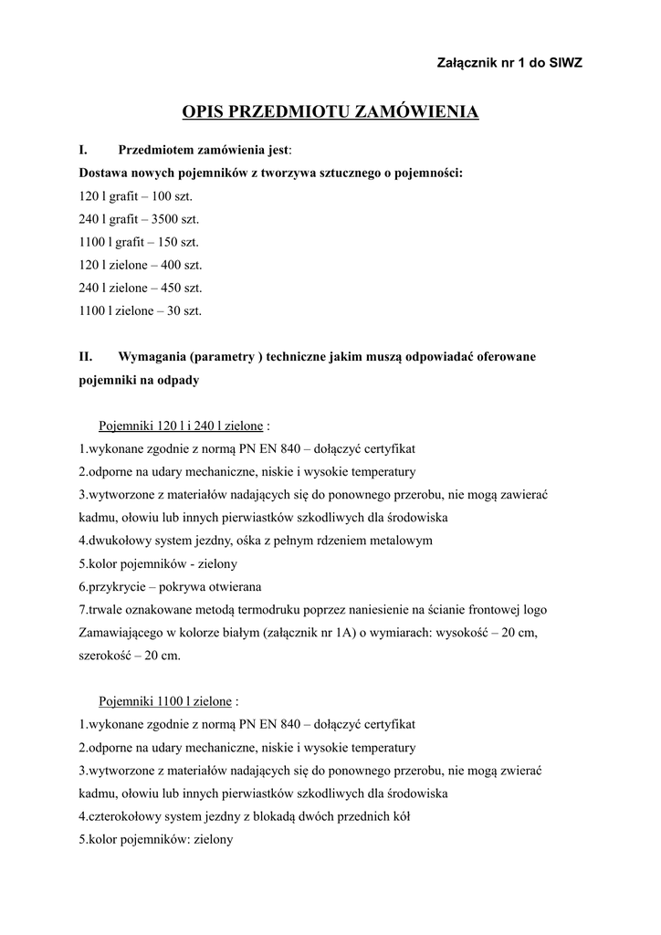 Załącznik nr 1 do SIWZ OPIS PRZEDMIOTU ZAMÓWIENIA I. Przedmiotem zamówienia jest: Dostawa nowych pojemników z tworzywa sztucznego o pojemności: 120 l grafit – 100 szt. 240 l grafit – 3500 szt. 1100 l grafit – 150 szt. 120 l zielone – 400 szt. 240 l zielone – 450 szt. 1100 l zielone – 30 szt. II. Wymagania (parametry ) techniczne jakim muszą odpowiadać oferowane pojemniki na odpady Pojemniki 120 l i 240 l zielone : 1.wykonane zgodnie z normą PN EN 840 – dołączyć certyfikat 2.odporne na udary mechaniczne, niskie i wysokie temperatury 3.wytworzone z materiałów nadających się do ponownego przerobu, nie mogą zawierać kadmu, ołowiu lub innych pierwiastków szkodliwych dla środowiska 4.dwukołowy system jezdny, ośka z pełnym rdzeniem metalowym 5.kolor pojemników - zielony 6.przykrycie – pokrywa otwierana 7.trwale oznakowane metodą termodruku poprzez naniesienie na ścianie frontowej logo Zamawiającego w kolorze białym (załącznik nr 1A) o wymiarach: wysokość – 20 cm, szerokość – 20 cm. Pojemniki 1100 l zielone : 1.wykonane zgodnie z normą PN EN 840 – dołączyć certyfikat 2.odporne na udary mechaniczne, niskie i wysokie temperatury 3.wytworzone z materiałów nadających się do ponownego przerobu, nie mogą zwierać kadmu, ołowiu lub innych pierwiastków szkodliwych dla środowiska 4.czterokołowy system jezdny z blokadą dwóch przednich kół 5.kolor pojemników: zielony 6.przystosowane do opróżniania przez typowe śmieciarki posiadające tylne wysięgniki podnoszące lub listwę grzebieniową 7.trwale oznakowane metodą termodruku poprzez naniesienie na ścianie frontowej logo Zamawiającego w kolorze białym (załącznik nr 1A) o wymiarach: wysokość – 20 cm, szerokość – 20 cm 8.pokrywa pojemników: półokrągła Pojemniki 120 l i 240 l grafitowe z żółtą pokrywą : 1.wykonane zgodnie z normą PN EN 840 – dołączyć certyfikat 2.odporne na udary mechaniczne, niskie i wysokie temperatury 3.wytworzone z materiałów nadających się do ponownego przerobu, nie mogą zawierać kadmu, ołowiu lub innych pierwiastków szkodliwych dla środowiska 4.dwukołowy system jezdny, ośka z pełnym rdzeniem metalowym 5.kolor pojemników - korpus grafitowy, pokrywa żółta 6.przykrycie – pokrywa otwierana 7.trwale oznakowane metodą termodruku poprzez naniesienie na ścianie frontowej logo Zamawiającego w kolorze białym (załącznik nr 1A) o wymiarach: wysokość – 20 cm, szerokość – 20 cm oraz napisu „ODPADY SUCHE BEZ SZKŁA” (wysokość liter 5 cm) Pojemniki 1100 l grafitowe z żółtą pokrywą : 1.wykonane zgodnie z normą PN EN 840 – dołączyć certyfikat 2.odporne na udary mechaniczne, niskie i wysokie temperatury 3.wytworzone z materiałów nadających się do ponownego przerobu, nie mogą zawierać kadmu, ołowiu lub innych pierwiastków szkodliwych dla środowiska 4.czterokołowy system jezdny z blokadą dwóch przednich kół 5.kolor pojemników: korpus grafitowy, pokrywa żółta 6.przystosowane do opróżniania przez typowe śmieciarki posiadające tylne wysięgniki podnoszące lub listwę grzebieniową 7.trwale oznakowane metodą termodruku poprzez naniesienie na ścianie frontowej logo Zamawiającego w kolorze białym (załącznik nr 1A) o wymiarach: wysokość – 20 cm, szerokość – 20 cm oraz napisu „ODPADY SUCHE BEZ SZKŁA” (wysokość liter 5 cm) 8.pokrywy pojemników płaskie, otwierane uchylnie z dwoma otworami wrzutowymi o średnicy 20 cm z rozetami gumowymi oraz otworem prostokątnym o wym. 50 cm x 15 cm zabezpieczonym przed opadami atmosferycznymi daszkiem Załącznik 1A do SIWZ trwale oznakowane metodą termodruku poprzez naniesienie na ścianie frontowej logo Zamawiającego w kolorze białym o wymiarach: wysokość – 20 cm, szerokość – 20 cm. Kształt: romb Wymiary : 20 cm x 20 cm.