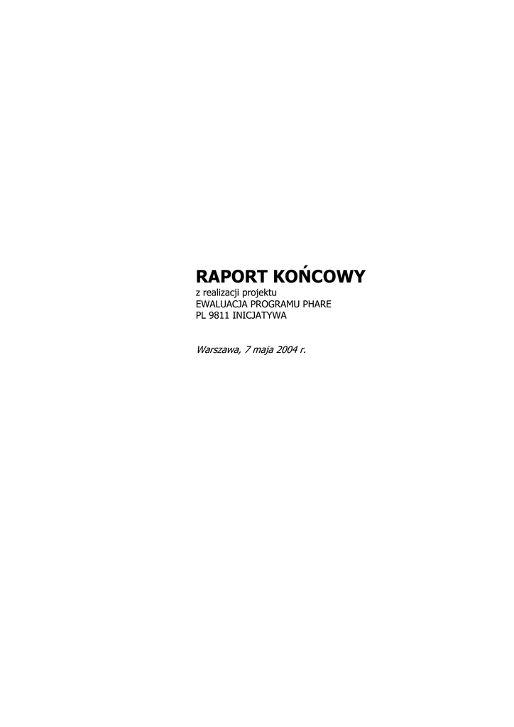 RAPORT KOŃCOWY z realizacji projektu EWALUACJA PROGRAMU PHARE PL 9811 INICJATYWA Warszawa, 7 maja 2004 r. SPIS TREŚCI: 1 STRESZCZENIE RAPORTU ......................................................................................... 4 2 OGÓLNE INFORMACJE O PROGRAMIE PL 9811 INICJATYWA .................................. 7 2.1 Cele Programu.......................................................................................................... 7 2.2 Wdrażanie................................................................................................................ 7 2.3 Budżet ..................................................................................................................... 8 2.4 Komponenty Programu.............................................................................................. 8 2.5 Planowane rezultaty................................................................................................ 10 2.6 Kontynuacja Programu INICJATYWA ........................................................................ 10 3 PROGRAM INICJATYWA W RAMACH RZĄDOWYCH PLANÓW RESTRUKTURYZACJI SEKTORÓW GÓRNICTWA I HUTNICTWA ................................................................ 13 3.1 Program INICJATYWA jako element rządowych planów restrukturyzacji górnictwa i hutnictwa............................................................................................................... 13 3.1.1 Górnictwo ..................................................................................................................... 13 3.1.2 Hutnictwo ..................................................................................................................... 15 3.1.3 Dostosowanie Programu INICJATYWA do rządowych planów restrukturyzacji sektorów – ocena ........................................................................................................................... 17 3.2 Program INICJATYWA w kontekście potrzeb restrukturyzowanych sektorów................. 18 3.2.1 Górnictwo ..................................................................................................................... 18 3.2.2 Hutnictwo ..................................................................................................................... 18 3.2.3 Dostosowanie Programu INICJATYWA do potrzeb sektorów – ocena ................................ 19 3.3 Program INICJATYWA w kontekście potrzeb objętych restrukturyzacją regionów (Śląsk i Małopolska)............................................................................................................ 20 3.4 Program INICJATYWA a realizacja rządowych planów restrukturyzacji sektorów górnictwa i hutnictwa ............................................................................................................. 21 4 OCENA POSZCZEGÓLNYCH INSTRUMENTÓW PROGRAMU INICJATYWA ............... 22 4.1 Wykorzystanie środków alokowanych na Program i poszczególne instrumenty.............. 22 4.2 Łagodzenie społecznych i regionalnych kosztów restrukturyzacji sektorów ................... 23 4.3 Realizacja celów poszczególnych instrumentów i wkład Programu w ograniczanie bezrobocia wynikającego z restrukturyzacji ............................................................... 26 4.3.1 Tworzenie miejsc pracy (pożyczki preferencyjne, dopłaty do oprocentowania kredytów, refundacja składek na ubezpieczenia społeczne) ............................................................. 26 4.3.2 Szkolenia przekwalifikowujące........................................................................................ 31 4.3.3 Usługi doradcze ............................................................................................................ 34 4.3.4 Współfinansowanie działań osłonowych (zasiłki socjalne i kontrakty szkoleniowe) ............. 36 4.3.5 Budowa instytucji (twinning).......................................................................................... 39 4.3.6 Zadowolenie z wykorzystanego instrumentu ................................................................... 39 4.3.7 Zainteresowanie ponownym skorzystaniem z instrumentów Programu.............................. 42 4.4 Trwałość rezultatów poszczególnych instrumentów .................................................... 44 4.4.1 Tworzenie miejsc pracy (pożyczki preferencyjne, dopłaty do oprocentowania kredytów, refundacja składek na ubezpieczenia społeczne) ............................................................. 44 4.4.2 Szkolenia przekwalifikowujące........................................................................................ 46 4.4.3 Współfinansowanie działań osłonowych (zasiłki socjalne i kontrakty szkoleniowe) ............. 46 5 OCENA SYSTEMU WDRAŻANIA PROGRAMU INICJATYWA ..................................... 48 2 6 WNIOSKI................................................................................................................. 56 7 REKOMENDACJE DLA PROGRAMU INICJATYWA III............................................... 60 7.1 Rekomendacje wynikające z oceny poszczególnych instrumentów ............................... 60 7.2 Rekomendacje wynikające z oceny systemu wdrażania Programu INICJATYWA............ 61 ANEKSY Aneks 1 - Opis metodologii stosowanej przy ewaluacji Programu Aneks 2 - Lista osób, z którymi przeprowadzono wywiady indywidualne Aneks 3 - Lista dokumentów i publikacji wykorzystanych przy realizacji ewaluacji Programu INICJATYWA PL 9811 Aneks 4 - Aneks statystyczny Aneks 5 - Transkrypcja zogniskowanych wywiadów grupowych Aneks 6 - Baza danych z badań wśród beneficjentów poszczególnych instrumentów Programu INICJATYWA Aneks 7 - Kwestionariusze do wywiadów telefonicznych z beneficjentami Programu Aneks 8 - Streszczenia wywiadów indywidualnych z osobami zaangażowanymi w realizację Programu INICJATYWA w PARP oraz instytucjach regionalnych Aneks 9 - Dyspozycj
