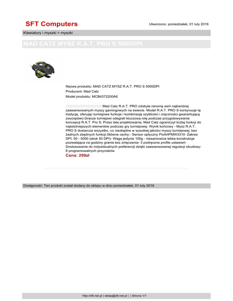 SFT Computers Utworzono: poniedziałek, 01 luty 2016 Klawiatury i myszki > myszki MAD CATZ MYSZ R.A.T. PRO S 5000DPI Nazwa produktu: MAD CATZ MYSZ R.A.T. PRO S 5000DPI Producent: Mad Catz Model produktu: MCB4372200A6 Mad Catz R.A.T. PRO zdobyła renomę serii najbardziej zaawansowanych myszy gamingowych na świecie. Model R.A.T. PRO S kontynuuje tę tradycję, oferując turniejowe funkcje i kombinację szybkości i zręczności gwarantującą zwycięstwo.Gracze turniejowi odegrali kluczową rolę podczas przygotowywania koncepcji R.A.T. Pro S. Przez lata projektowania, Mad Catz ograniczył liczbę funkcji do najistotniejszych elementów podczas gry turniejowej. Wynik końcowy - Mysz R.A.T. PRO S dostarcza wszystko, co niezbędne w wysokiej jakości myszy turniejowej, bez żadnych zbędnych funkcji.Główne cechy:- Sensor optyczny PixArtPMW3310- Zakres DPI: 50 - 5000 (skok 50 DPI)- Waga jedynie 100g - niesamowice lekka konstrukcja pozwalająca na godziny grania bez zmęczenia- 3 podręczne profile ustawieńDostosowanie do indywidualnych preferencji dzięki zaawansowanej regulacji obudowy8 programowalnych przycisków Cena: 299zł Dostępność: Ten produkt został dodany do sklepu w dniu poniedziałek, 01 luty 2016 http://sft.net.pl | [email protected] | | Strona 1/1