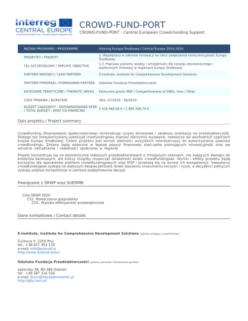 CROWD-FUND-PORT CROWD-FUND-PORT - Central European Crowd-funding Support NAZWA PROGRAMU / PROGRAMME Interreg Europa Środkowa / Central Europe 2014-2020 PRIORYTET / PRIORITY 1. Współpraca w zakresie innowacji na rzecz zwiększenia konkurencyjności Europy Środkowej CEL SZCZEGÓŁOWY / SPECIFIC OBJECTIVE 1.2. Poprawa poziomu wiedzy i umiejętności dla rozwoju ekonomicznego i społecznych innowacji w regionach Europy Środkowej PARTNER WIODĄCY / LEAD PARTNER E-institute, Institute for Comprehensive Development Solutions PARTNER POMORSKI / POMERANIAN PARTNER Gdańska Fundacja Przedsiębiorczości KATEGORIE TEMATYCZNE / THEMATIC AREAS Konkurencyjność MŚP / Competitiveness of SMEs, Inne / Other CZAS TRWANIA / DURATION 36m, 07/2016 - 06/2019 BUDŻET CAŁKOWITY - DOFINANSOWANIE EFRR 2 416 460,00 € / 1 995 309,75 € / TOTAL BUDGET - ERDF CO-FINANCING Opis projektu / Project summary Crowdfunding (finansowanie społecznościowe) minimalizuje ryzyko biznesowe i zwiększa orientację na przedsiębiorczość. Dlatego też niewykorzystany potencjał crowfundingowy stanowi olbrzymie wyzwanie, zwłaszcza we wschodnich częściach krajów Europy Środkowej. Celem projektu jest wzrost zdolności wszystkich interesariuszy do wykorzystania zjawiska crowdfundingu. Zmiany będą widoczne w lepszej pozycji finansowej start-upów promujących innowacyjność oraz we wzroście zatrudnienia i stabilności społecznej w regionie. Projekt koncentruje się na ekonomicznie słabszych przedsiębiorstwach o mniejszych szansach, nie mających dostępu do kredytów bankowych, ale którzy mogliby rozpocząć działalność dzięki crowdfundingowi. Wyniki i efekty projektu będą korzystne dla operatorów platform crowdfundingowych oraz MŚP i przełożą się na wzrost ich kompetencji. Inwestorzy crowdfundingowi zyskają na większym bezpieczeństwie dzięki lepszemu zrozumieniu korzyści i ryzyk, a decydenci polityczni zyskają większe kompetencje w zakresie podejmowania decyzji. Powiązanie z SRWP oraz SUERMB Cele SRWP 2020 CS1. Nowoczesna gospodarka CO1. Wysoka efektywność przedsiębiorstw Dane kontaktowe / Contact details E-institute, Institute for Comprehensive Development Solutions Čučkova 5, 2250 Ptuj tel.: +38 627 493 210 e-mail: [email protected] http://www.ezavod.si/en/ Gdańska Fundacja Przedsiębiorczości (partner pomorski / Pomeranian partner) Lęborska 3B, 80-386 Gdańsk tel.: +48 587 316 556 e-mail: [email protected] http://gfp.com.pl/ (partner wiodący / Lead Partner)
