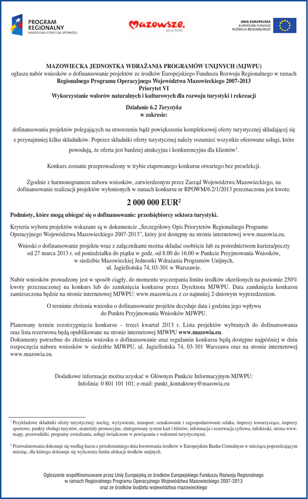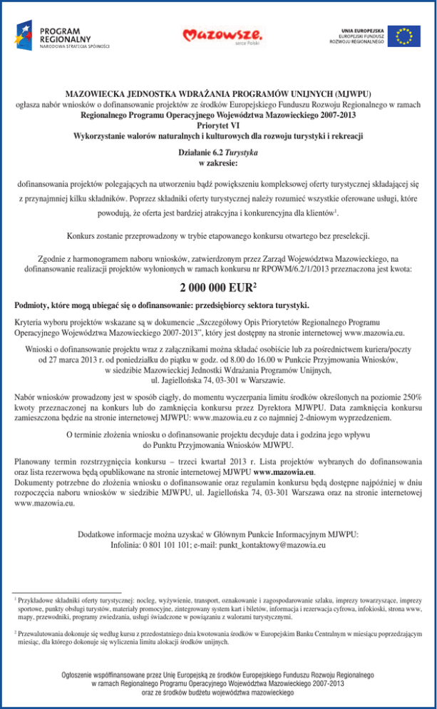 MAZOWIECKA JEDNOSTKA WDRAŻANIA PROGRAMÓW UNIJNYCH (MJWPU) ogłasza nabór wniosków o dofinansowanie projektów ze środków Europejskiego Funduszu Rozwoju Regionalnego w ramach Regionalnego Programu Operacyjnego Województwa Mazowieckiego 2007-2013 Priorytet VI Wykorzystanie walorów naturalnych i kulturowych dla rozwoju turystyki i rekreacji Działanie 6.2 Turystyka w zakresie: dofinansowania projektów polegających na utworzeniu bądź powiększeniu kompleksowej oferty turystycznej składającej się z przynajmniej kilku składników. Poprzez składniki oferty turystycznej należy rozumieć wszystkie oferowane usługi, które powodują, że oferta jest bardziej atrakcyjna i konkurencyjna dla klientów1. Konkurs zostanie przeprowadzony w trybie etapowanego konkursu otwartego bez preselekcji. Zgodnie z harmonogramem naboru wniosków, zatwierdzonym przez Zarząd Województwa Mazowieckiego, na dofinansowanie realizacji projektów wyłonionych w ramach konkursu nr RPOWM/6.2/1/2013 przeznaczona jest kwota: 2 000 000 EUR2 Podmioty, które mogą ubiegać się o dofinansowanie: przedsiębiorcy sektora turystyki. Kryteria wyboru projektów wskazane są w dokumencie „Szczegółowy Opis Priorytetów Regionalnego Programu Operacyjnego Województwa Mazowieckiego 2007-2013”, który jest dostępny na stronie internetowej www.mazowia.eu. Wnioski o dofinansowanie projektu wraz z załącznikami można składać osobiście lub za pośrednictwem kuriera/poczty od 27 marca 2013 r. od poniedziałku do piątku w godz. od 8.00 do 16.00 w Punkcie Przyjmowania Wniosków, w siedzibie Mazowieckiej Jednostki Wdrażania Programów Unijnych, ul. Jagiellońska 74, 03-301 w Warszawie. Nabór wniosków prowadzony jest w sposób ciągły, do momentu wyczerpania limitu środków określonych na poziomie 250% kwoty przeznaczonej na konkurs lub do zamknięcia konkursu przez Dyrektora MJWPU. Data zamknięcia konkursu zamieszczona będzie na stronie internetowej MJWPU: www.mazowia.eu z co najmniej 2-dniowym wyprzedzeniem. O terminie złożenia wniosku o dofinansowanie projektu decyduje data i godzina jego wpływu do Punktu Przyjmowania Wniosków MJWPU. Planowany termin rozstrzygnięcia konkursu – trzeci kwartał 2013 r. Lista projektów wybranych do dofinansowania oraz lista rezerwowa będą opublikowane na stronie internetowej MJWPU www.mazowia.eu. Dokumenty potrzebne do złożenia wniosku o dofinansowanie oraz regulamin konkursu będą dostępne najpóźniej w dniu rozpoczęcia naboru wniosków w siedzibie MJWPU, ul. Jagiellońska 74, 03-301 Warszawa oraz na stronie internetowej www.mazowia.eu. Dodatkowe informacje można uzyskać w Głównym Punkcie Informacyjnym MJWPU: Infolinia: 0 801 101 101; e-mail: [email protected] 1 Przykładowe składniki oferty turystycznej: nocleg, wyżywienie, transport, oznakowanie i zagospodarowanie szlaku, imprezy towarzyszące, imprezy sportowe, punkty obsługi turystów, materiały promocyjne, zintegrowany system kart i biletów, informacja i rezerwacja cyfrowa, infokioski, strona www, mapy, przewodniki, programy zwiedzania, usługi świadczone w powiązaniu z walorami turystycznymi. 2 Przewalutowania dokonuje się według kursu z przedostatniego dnia kwotowania środków w Europejskim Banku Centralnym w miesiącu poprzedzającym miesiąc, dla którego dokonuje się wyliczenia limitu alokacji środków unijnych. Ogłoszenie współfinansowane przez Unię Europejską ze środków Europejskiego Funduszu Rozwoju Regionalnego w ramach Regionalnego Programu Operacyjnego Województwa Mazowieckiego 2007-2013 oraz ze środków budżetu województwa mazowieckiego MAZOWIECKA JEDNOSTKA WDRAŻANIA PROGRAMÓW UNIJNYCH (MJWPU) ogłasza nabór wniosków o dofinansowanie projektów ze środków Europejskiego Funduszu Rozwoju Regionalnego w ramach Regionalnego Programu Operacyjnego Województwa Mazowieckiego 2007-2013 Priorytet VI Wykorzystanie walorów naturalnych i kulturowych dla rozwoju turystyki i rekreacji Działanie 6.2 Turystyka w zakresie: dofinansowania projektów polegających na utworzeniu, bądź powiększeniu kompleksowej oferty turystycznej składającej się z przynajmniej kilku składników. Poprzez składniki oferty turystycznej należy rozumieć wszystkie oferowane usługi, które powodują, że oferta jest bardziej atrakcyjna i konkurencyjna dla klientów1. Konkurs zostanie przeprowadzony w trybie etapowanego konkursu otwartego bez preselekcji. Zgodnie z harmonogramem naboru wniosków, zatwierdzonym przez Zarząd Województwa Mazowieckiego, na dofinansowanie realizacji projektów wyłonionych w ramach konkursu nr RPOWM/6.2/2/2013, przeznaczona jest kwota: 3 000 000 EUR2 Podmioty, które mogą ubiegać się o dofinansowanie: jednostki samorządu terytorialnego, ich związki i stowarzyszenia; jednostki organizacyjne jst posiadające osobowość prawną; parki narodowe i krajobrazowe; PGL Lasy Państwowe i jego jednostki organizacyjne; instytucje kultury; organizacje pozarządowe; kościoły i związki wyznaniowe oraz osoby prawne kościołów i związków wyznaniowych; jednostki sektora finansów publicznych posiadające osobowość prawną; podmioty działające w oparciu o przepisy ustawy o partnerstwie publiczno-prywatnym. Kryteria wyboru projektów wskazane są w dokumencie „Szczegółowy Opis Priorytetów Regionalnego Programu Operacyjnego Województwa Mazowieckiego 2007-2013”, który jest dostępny na stronie internetowej www.mazowia.eu. Wnioski o dofinansowanie projektu wraz z załącznikami można składać osobiście lub za pośrednictwem kuriera/poczty od 27 marca 2013 r. od poniedziałku do piątku w godz. od 8.00 do 16.00 w Punkcie Przyjmowania Wniosków, w siedzibie Mazowieckiej Jednostki Wdrażania Programów Unijnych ul. Jagiellońska 74, 03-301 w Warszawie. Nabór wniosków prowadzony jest w sposób ciągły, do momentu wyczerpania limitu środków określonych na poziomie 250% kwoty przeznaczonej na konkurs lub do zamknięcia konkursu przez Dyrektora MJWPU. D