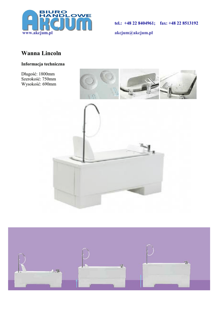tel.: +48 22 8404961; www.akcjum.pl Wanna Lincoln Informacja techniczna Długość: 1800mm Szerokość: 750mm Wysokość: 690mm [email protected] fax: +48 22 8513192 tel.: +48 22 8404961; www.akcjum.pl [email protected] fax: +48 22 8513192 tel.: +48 22 8404961; www.akcjum.pl fax: +48 22 8513192 [email protected] Wanna Lincoln jest wyjątkowo wszechstronnym rozwiązaniem do kąpieli, wyposażona jest w platformę transportową, która pełni również funkcję blatu do przewijania. Funkcja regulacji wysokości pozwala asystentowi dostosować wygodną wysokość roboczą bez ryzyka nadwyrężania kręgosłupa. Idealna zarówno dla dzieci jak i dorosłych. Platforma podnośnikowa zapewnia bezpieczne przemieszczanie użytkowników , ergonomiczne oparcie i podnóżek platformy zapewniają optymalną pozycję kąpielową Najważniejsze funkcje - wszechstronne wykorzystanie jako wanna i przewijak - regulowana wysokość wanny zapewnia komfortową pracę asystenta - zapewnia idealne rozwiązanie gdy potrzebna jest stabilność kręgosłupa - odpinany i regulowany podnóżek zapewnia dostosowanie wg potrzeby - głębokość wanny poprawia komfort użytkownikowi - swobodny dostęp do kąpiącego - akumulator podnośnika w standardzie - konfiguracja lewej lub prawej strony - gładkie powierzchnie ułatwiające czyszczenie i dezynfekcje - bezpieczny udźwig 165 - certyfikat WRAS Wykonanie opcjonalne - akcesoria dodatkowe ułatwiające transport - chromoterapia czyli czyli leczenie kolorami - masaż powietrzny