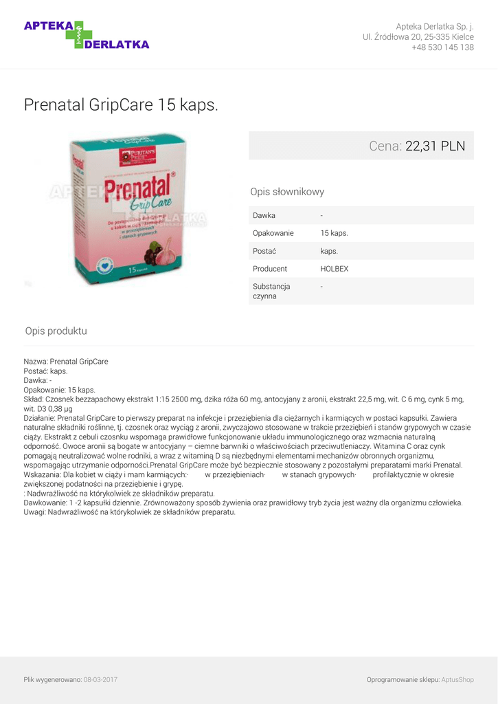 Apteka Derlatka Sp. j. Ul. Źródłowa 20, 25-335 Kielce +48 530 145 138 Prenatal GripCare 15 kaps. Cena: 22,31 PLN Opis słownikowy Dawka - Opakowanie 15 kaps. Postać kaps. Producent HOLBEX Substancja czynna - Opis produktu Nazwa: Prenatal GripCare Postać: kaps. Dawka: Opakowanie: 15 kaps. Skład: Czosnek bezzapachowy ekstrakt 1:15 2500 mg, dzika róża 60 mg, antocyjany z aronii, ekstrakt 22,5 mg, wit. C 6 mg, cynk 5 mg, wit. D3 0,38 μg Działanie: Prenatal GripCare to pierwszy preparat na infekcje i przeziębienia dla ciężarnych i karmiących w postaci kapsułki. Zawiera naturalne składniki roślinne, tj. czosnek oraz wyciąg z aronii, zwyczajowo stosowane w trakcie przeziębień i stanów grypowych w czasie ciąży. Ekstrakt z cebuli czosnku wspomaga prawidłowe funkcjonowanie układu immunologicznego oraz wzmacnia naturalną odporność. Owoce aronii są bogate w antocyjany – ciemne barwniki o właściwościach przeciwutleniaczy. Witamina C oraz cynk pomagają neutralizować wolne rodniki, a wraz z witaminą D są niezbędnymi elementami mechanizów obronnych organizmu, wspomagając utrzymanie odporności.Prenatal GripCare może być bezpiecznie stosowany z pozostałymi preparatami marki Prenatal. Wskazania: Dla kobiet w ciąży i mam karmiących:· w przeziębieniach· w stanach grypowych· profilaktycznie w okresie zwiększonej podatności na przeziębienie i grypę. : Nadwrażliwość na którykolwiek ze składników preparatu. Dawkowanie: 1 -2 kapsułki dziennie. Zrównoważony sposób żywienia oraz prawidłowy tryb życia jest ważny dla organizmu człowieka. Uwagi: Nadwrażliwość na którykolwiek ze składników preparatu. Plik wygenerowano: 08-03-2017 Powered by TCPDF (www.tcpdf.org) Oprogramowanie sklepu: AptusShop