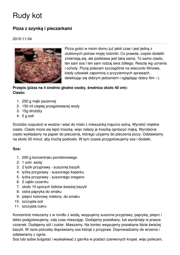 Rudy kot Pizza z szynką i pieczarkami 2010-11-04 Pizza gości w moim domu już jakiś czas i jest jedną z ulubionych potraw mojej rodzinki. Co prawda, często dodatki zmieniają się, ale podstawa jest taka sama. To samo ciasto, ten sam sos i ten sam rodzaj sera żółtego. Resztę wg uznania i ochoty. Pizzę polecam szczególnie na wieczorki filmowe, kiedy człowiek zapomina o przyziemnych sprawach, delektując się dobrym jedzeniem i oglądając dobry film :-). Przepis (pizza na 4 średnio głodne osoby, średnica około 40 cm): Ciasto: 1. 2. 3. 4. 250 g mąki pszennej 150 ml ciepłej przegotowanej wody 15g drożdży 5 g soli Drożdże rozpuścić w wodzie i wlać do miski z mieszanką mączno solną. Wyrobić miękkie ciasto. Ciasto może się lepić troszkę, więc należy je troszkę oprószyć mąką. Wyrobione ciasto wykładamy na papier do pieczenia, którego użyjemy do pieczenia pizzy. Odstawiamy na około 30 minut, aby trochę podrosło. W tym czasie przygotowujemy sos i dodatki. Sos: 1. 2. 3. 4. 5. 6. 7. 8. 9. 10. 11. 200 g koncentratu pomidorowego 1 szkl. wody 2 łyżki przyprawy - suszonej bazylii łyżka przyprawy - suszonego koperku łyżka przyprawy - suszonego oregano 2 ząbki czosnku około 10 sporych listków świeżej bazylii ostra papryka do smaku pieprz kolorowy mielony, do smaku szczypta soli szczypta cukru Koncentrat mieszamy z w rondlu z wodą, wsypujemy suszone przyprawy, paprykę, pieprz i lekko podgotowujemy, cały czas mieszając. Dodajemy posiekany, lub wyciśnięty w prasce czosnek. Dodajemy sól i cukier. Mieszamy. Na koniec wsypujemy posiekane liście świeżej bazylii. W razie potrzeby doprawiamy sos którąś z przypraw. Doprowadzamy do wrzenia i odstawiamy z ognia. Sos lubi sobie bulgotać i wyskakiwać z garnka w postaci czerwonych kropel, więc polecam, aby był cały czas mieszany, aż do wyłączenia ognia. Dodatki do pizzy: 1. 200 g startego sera Cheddar 2. 5 dużych pieczarek (pokrojonych w plasterki) 3. kilka plasterków szynki konserwowej, wieprzowej pokrojonej w paski lub prostokąciki wielkości 3, 4 cm (ja używam szynki z Morlin). Gdy ciasto już nam podrosło, rozwałkowujemy je aż osiągnie kształt i wielkość blachy do pieczenia. Ciasto nakłuwamy kilka razy widelcem. Na ciasto wylewamy sos i rozsmarowujemy na całej powierzchni ciasta. Na sos rozsypujemy równomiernie ser, następnie wykładamy równomiernie szynkę i na koniec rozkładamy pieczarki. Pizzę pieczemy około 15 – 20 minut, w nagrzanym wcześniej piekarniku, w temp. Około 180 – 200 stop. C. Smacznego :-)