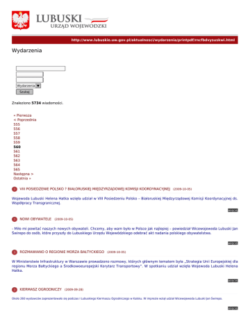 http://www.lubuskie.uw.gov.pl/aktualnosci/wydarzenia/printpdf/rncfbdvysuskwi.html Wydarzenia Wydarzenia ▼ Szukaj Znaleziono 5734 wiadomości. « Pierwsza < Poprzednia 555 556 557 558 559 560 561 562 563 564 565 Następna > Ostatnia » VIII POSIEDZENIE POLSKO ? BIAŁORUSKIEJ MIĘDZYRZĄDOWEJ KOMISJI KOORDYNACYJNEJ (2009-10-05) Wojewoda Lubuski Helena Hatka wzięła udział w VIII Posiedzeniu Polsko – Białoruskiej Międzyrządowej Komisji Koordynacyjnej ds. Współpracy Transgranicznej. więcej NOWI OBYWATELE (2009-10-05) - Miło mi powitać naszych nowych obywateli. Chcemy, aby wam było w Polsce jak najlepiej – powiedział Wicewojewoda Lubuski Jan Świrepo do osób, które przyszły do Lubuskiego Urzędu Wojewódzkiego odebrać akt nadania polskiego obywatelstwa. więcej ROZMAWIANO O REGIONIE MORZA BAŁTYCKIEGO (2009-10-05) W Ministerstwie Infrastruktury w Warszawie prowadzono rozmowy, których głównym tematem była „Strategia Unii Europejskiej dla regionu Morza Bałtyckiego a Środkowoeuropejski Korytarz Transportowy”. W spotkaniu udział wzięła Wojewoda Lubuski Helena Hatka. więcej KIERMASZ OGRODNICZY (2009-09-28) Około 260 wystawców zaprezentowało się podczas I Lubuskiego Kiermaszu Ogrodniczego w Kalsku. W imprezie wziął udział Wicewojewoda Lubuski Jan Świrepo. więcej GALA BUDOWNICTWA (2009-09-28) W gmachu Filharmonii Zielonogórskiej odbyła się „Gala Budownictwa 2009”. Udział w niej wziął Wicewojewoda Lubuski Jan Świrepo. więcej INAUGURACJA ROKU W WYŻSZEJ SZKOLE BIZNESU (2009-09-28) Wyższa Szkoła Biznesu w Gorzowie Wlkp. zainaugurowała nowy rok akademicki 2009/2010. Na uroczystości Wojewodę Lubuskiego Helenę Hatkę reprezentował Jarosław Barańczak Dyrektor Generalny Lubuskiego Urzędu Wojewódzkiego. więcej SPOTKANIE WOJEWODÓW (2009-09-25) Wojewoda Lubuski Helena Hatka wzięła udział spotkaniu Wojewodów i Marszałków Województw RP w Łodzi. Obecny na nim był także Grzegorz Schetyna Minister Spraw Wewnętrznych i Administracji. więcej WSPARCIE DLA WYSOKICH TECHNOLOGII (2009-09-25) Wicewojewoda Jan Świrepo wziął udział w konferencji otwierającej projekt „Budowa lubuskiego systemu innowacji”. Celem konferencji było przedstawienie możliwości przekształcania i tworzenia nowych przedsiębiorstw działających w oparciu o zaawansowane technologicznie rozwiązania w ramach środków pomocowych Unii Europejskiej. więcej OBRADY POLSKO "NIEMIECKIEJ KOMISJI MIĘDZYRZĄDOWEJ" (2009-09-23) Wojewoda Lubuski Helena Hatka na zaproszenie Piotra Stachańczyka Podsekretarza Stanu w MSWiA weźmie udział w jubileuszowym XX posiedzeniu Polsko – Niemieckiej Komisji Międzyrządowej ds. Współpracy Regionalnej i Przygranicznej. więcej WICEPREMIER GRZEGORZ SCHETYNA W GORZOWIE WLKP. (2009-09-23) Komenda Wojewódzka Policji w Gorzowie Wlkp. została oficjalnie otwarta po modernizacji i przebudowie. Udział w tej ważnej dla bezpieczeństwa publicznego uroczystości wzięli Grzegorz Schetyna Minister Spraw Wewnętrznych i Administracji, Helena Hatka Wojewoda Lubuski oraz gen. insp. Andrzej Matejuk Komendant Główny Policji. więcej « Pierwsza < Poprzednia 555 556 557 558 559 560 561 562 563 564 565 Następna > Ostatnia »