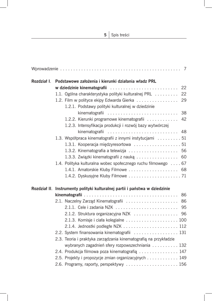 Spis treści Wprowadzenie . . . . . . . . . . . . . . . . . . . . . . . . . . . . . . . . . . . . . . . . . . . . . . 7 Rozdział I. Podstawowe założenia i kierunki działania władz PRL w dziedzinie kinematografii . . . . . . . . . . . . . . . . . . . . . . . . . . 22 1.1. Ogólna charakterystyka polityki kulturalnej PRL . . . . . . . . . 22 1.2. Film w polityce ekipy Edwarda Gierka . . . . . . . . . . . . . . . . 29 1.2.1. Podstawy polityki kulturalnej w dziedzinie kinematografii . . . . . . . . . . . . . . . . . . . . . . . . . . . 38 1.2.2. Kierunki programowe kinematografii . . . . . . . . . . . . 42 1.2.3. Intensyfikacja produkcji i rozwój bazy wytwórczej kinematografii . . . . . . . . . . . . . . . . . . . . . . . . . . . 48 1.3. Współpraca kinematografii z innymi instytucjami . . . . . . . . . 51 1.3.1. Kooperacja międzyresortowa . . . . . . . . . . . . . . . . . . 51 1.3.2. Kinematografia a telewizja . . . . . . . . . . . . . . . . . . . 56 1.3.3. Związki kinematografii z nauką . . . . . . . . . . . . . . . . 60 1.4. Polityka kulturalna wobec społecznego ruchu filmowego . . . . 67 1.4.1. Amatorskie Kluby Filmowe . . . . . . . . . . . . . . . . . . . 68 1.4.2. Dyskusyjne Kluby Filmowe . . . . . . . . . . . . . . . . . . . . 71 Rozdział II. Instrumenty polityki kulturalnej partii i państwa w dziedzinie kinematografii . . . . . . . . . . . . . . . . . . . . . . . . . . . . . . . . . . . . 86 2.1. Naczelny Zarząd Kinematografii . . . . . . . . . . . . . . . . . . . . 86 2.1.1. Cele i zadania NZK . . . . . . . . . . . . . . . . . . . . . . . . 95 2.1.2. Struktura organizacyjna NZK . . . . . . . . . . . . . . . . . 96 2.1.3. Komisje i ciała kolegialne . . . . . . . . . . . . . . . . . . . . 100 2.1.4. Jednostki podległe NZK . . . . . . . . . . . . . . . . . . . . . 112 2.2. System finansowania kinematografii . . . . . . . . . . . . . . . . . 131 2.3. Teoria i praktyka zarządzania kinematografią na przykładzie wybranych zagadnień sfery rozpowszechniania . . . . . . . . . . 132 2.4. Produkcja filmowa poza kinematografią . . . . . . . . . . . . . . . 147 2.5. Projekty i propozycje zmian organizacyjnych . . . . . . . . . . . . 149 2.6. Programy, raporty, perspektywy . . . . . . . . . . . . . . . . . . . . 156 Rozdział III. System ideowo-politycznego oddziaływania na kinematografię . . 163 3.1. Działalność POP . . . . . . . . . . . . . . . . . . . . . . . . . . . . . . . 164 3.2. Realizacja decyzji programowych kinematografii . . . . . . . . . 171 3.3. Cenzura . . . . . . . . . . . . . . . . . . . . . . . . . . . . . . . . . . . . . 185 3.4. Nagrody . . . . . . . . . . . . . . . . . . . . . . . . . . . . . . . . . . . . 192 3.5. Działalność informacyjno-propagandowa i krytyka filmowa . . 197 3.6. Współpraca z młodym pokoleniem twórców filmowych . . . . 213 3.7. Spotkania władz partyjnych ze środowiskiem filmowym . . . . 222 3.8. Konkursy i festiwale filmowe . . . . . . . . . . . . . . . . . . . . . . 237 3.9. Inne formy działalności ideowo-politycznej . . . . . . . . . . . . . 253 Rozdział IV. Współpraca kulturalna PRL z zagranicą w dziedzinie kinematografii . . . . . . . . . . . . . . . . . . . . . . . . . . . . . . . . . . . . 256 4.1. Strategia międzynarodowej współpracy filmowej . . . . . . . . . 256 4.1.1. Miejsce i rola współpracy kulturalnej z zagranicą w polityce władz PRL . . . . . . . . . . . . . . . . . . . . . . 256 4.1.2. Cele, kierunki i formy międzynarodowej współpracy filmowej . . . . . . . . . . . . . . . . . . . . . . . . . . . . . . . . 258 4.1.3. Aspekty instytucjonalne współpracy . . . . . . . . . . . . 273 4.2. Kooperacja z krajami socjalistycznymi . . . . . . . . . . . . . . . . 279 4.2.1. Zarys współpracy . . . . . . . . . . . . . . . . . . . . . . . . . 279 4.2.2. Polsko-radziecka współpraca filmowa . . . . . . . . . . 283 4.2.3. Współpraca z innymi krajami socjalistycznymi . . . . 302 4.3. Współpraca z krajami kapitalistycznymi . . . . . . . . . . . . . . . 314 4.3.1. Zarys współpracy . . . . . . . . . . . . . . . . . . . . . . . . . 314 4.3.2. Polsko-francuska współpraca filmowa . . . . . . . . . . . 317 4.3.3. Współpraca z innymi krajami kapitalistycznymi . . . . . 323 W miejsce zakończenia . . . . . . . . . . . . . . . . . . . . . . . . . . . . . . . . . . . . . . . 331 Bibliografia . . . . . . . . . . . . . . . . . . . . . . . . . . . . . . . . . . . . . . . . . . . . . . 345 Załączniki . . . . . . . . . . . . . . . . . . . . . . . . . . . . . . . . . . . . . . . . . . . . . . . 353 Indeks nazwisk . . . . . . . . . . . . . . . . . . . . . . . . . . . . . . . . . . . . . . . . . . . 358 Polish People’s Republic’s cultural policy towards cinematography in the 1970s – Summary . . . . . . . . . . . . . . . . . . . . . . . . . . . . . . . . . 368