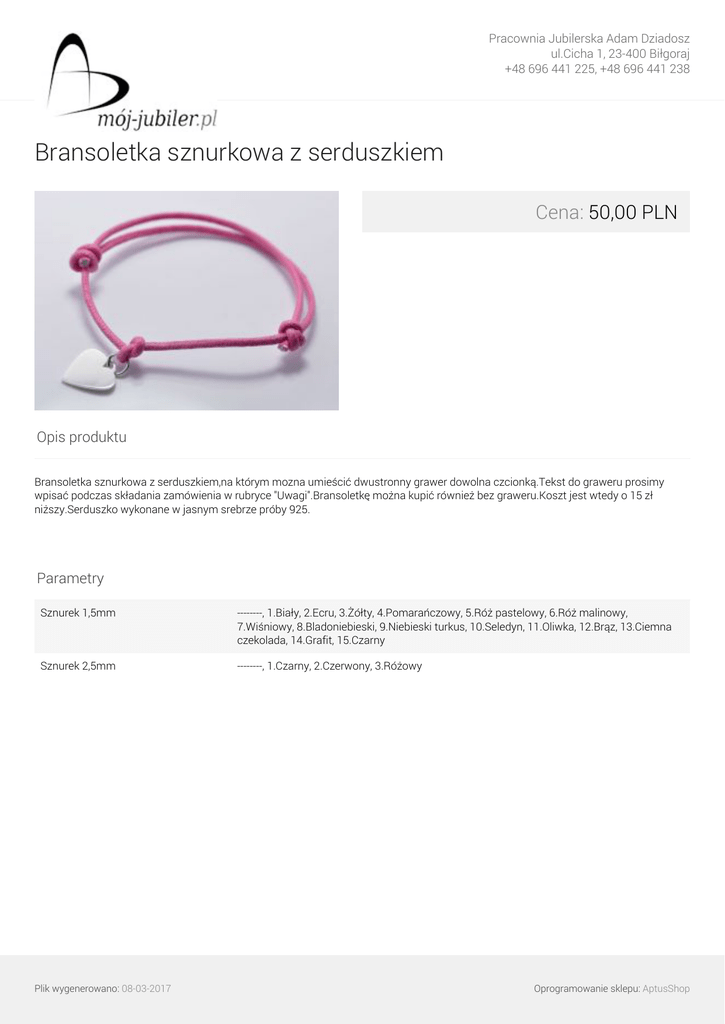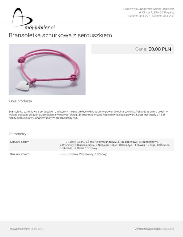 Pracownia Jubilerska Adam Dziadosz ul.Cicha 1, 23-400 Biłgoraj +48 696 441 225, +48 696 441 238 Bransoletka sznurkowa z serduszkiem Cena: 50,00 PLN Opis produktu Bransoletka sznurkowa z serduszkiem,na którym mozna umieścić dwustronny grawer dowolna czcionką.Tekst do graweru prosimy wpisać podczas składania zamówienia w rubryce "Uwagi".Bransoletkę można kupić również bez graweru.Koszt jest wtedy o 15 zł niższy.Serduszko wykonane w jasnym srebrze próby 925. Parametry Sznurek 1,5mm --------, 1.Biały, 2.Ecru, 3.Żółty, 4.Pomarańczowy, 5.Róż pastelowy, 6.Róż malinowy, 7.Wiśniowy, 8.Bladoniebieski, 9.Niebieski turkus, 10.Seledyn, 11.Oliwka, 12.Brąz, 13.Ciemna czekolada, 14.Grafit, 15.Czarny Sznurek 2,5mm --------, 1.Czarny, 2.Czerwony, 3.Różowy Plik wygenerowano: 08-03-2017 Powered by TCPDF (www.tcpdf.org) Oprogramowanie sklepu: AptusShop