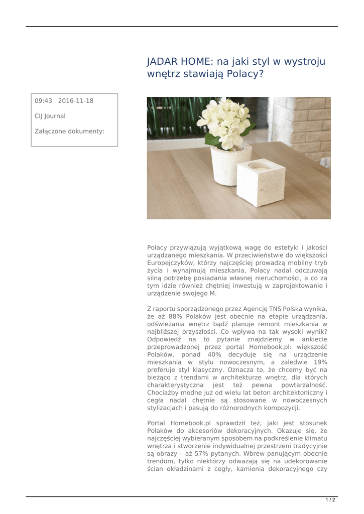 JADAR HOME: na jaki styl w wystroju wnętrz stawiają Polacy? 09:43 2016-11-18 CIJ Journal Załączone dokumenty: Polacy przywiązują wyjątkową wagę do estetyki i jakości urządzanego mieszkania. W przeciwieństwie do większości Europejczyków, którzy najczęściej prowadzą mobilny tryb życia i wynajmują mieszkania, Polacy nadal odczuwają silną potrzebę posiadania własnej nieruchomości, a co za tym idzie również chętniej inwestują w zaprojektowanie i urządzenie swojego M. Z raportu sporządzonego przez Agencję TNS Polska wynika, że aż 88% Polaków jest obecnie na etapie urządzania, odświeżania wnętrz bądź planuje remont mieszkania w najbliższej przyszłości. Co wpływa na tak wysoki wynik? Odpowiedź na to pytanie znajdziemy w ankiecie przeprowadzonej przez portal Homebook.pl: większość Polaków, ponad 40% decyduje się na urządzenie mieszkania w stylu nowoczesnym, a zaledwie 19% preferuje styl klasyczny. Oznacza to, że chcemy być na bieżąco z trendami w architekturze wnętrz, dla których charakterystyczna jest też pewna powtarzalność. Chociażby modne już od wielu lat beton architektoniczny i cegła nadal chętnie są stosowane w nowoczesnych stylizacjach i pasują do różnorodnych kompozycji. Portal Homebook.pl sprawdził też, jaki jest stosunek Polaków do akcesoriów dekoracyjnych. Okazuje się, że najczęściej wybieranym sposobem na podkreślenie klimatu wnętrza i stworzenie indywidualnej przestrzeni tradycyjnie są obrazy – aż 57% pytanych. Wbrew panującym obecnie trendom, tylko niektórzy odważają się na udekorowanie ścian okładzinami z cegły, kamienia dekoracyjnego czy 1/2 drewna. Pozytywnym zaskoczeniem jest, że coraz więcej respondentów przyznaje się do korzystania z elementów betonowych, zarówno jako dodatek do wystroju, jak i jego dominantę. 2/2
