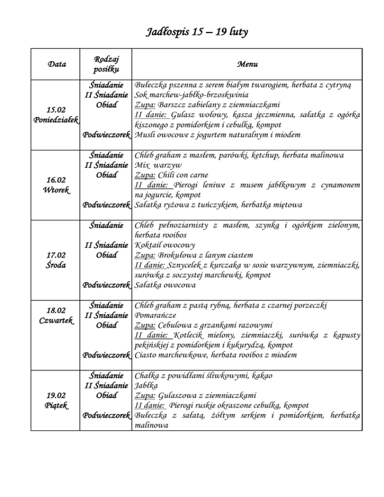 Jadłospis 15 – 19 luty Data Rodzaj posiłku Menu Śniadanie Bułeczka pszenna z serem białym twarogiem, herbata z cytryną II Śniadanie Sok marchew-jabłko-brzoskwinia Obiad Zupa: Barszcz zabielany z ziemniaczkami 15.02 II danie: Gulasz wołowy, kasza jęczmienna, sałatka z ogórka Poniedziałek kiszonego z pomidorkiem i cebulką, kompot Podwieczorek Musli owocowe z jogurtem naturalnym i miodem 16.02 Wtorek Śniadanie Chleb graham z masłem, parówki, ketchup, herbata malinowa II Śniadanie Mix warzyw Obiad Zupa: Chili con carne II danie: Pierogi leniwe z musem jabłkowym z cynamonem na jogurcie, kompot Podwieczorek Sałatka ryżowa z tuńczykiem, herbatka miętowa Śniadanie 17.02 Środa 18.02 Czwartek 19.02 Piątek Chleb pełnoziarnisty z masłem, szynką i ogórkiem zielonym, herbata rooibos II Śniadanie Koktail owocowy Obiad Zupa: Brokułowa z lanym ciastem II danie: Sznycelek z kurczaka w sosie warzywnym, ziemniaczki, surówka z soczystej marchewki, kompot Podwieczorek Sałatka owocowa Śniadanie Chleb graham z pastą rybną, herbata z czarnej porzeczki II Śniadanie Pomarańcze Obiad Zupa: Cebulowa z grzankami razowymi II danie: Kotlecik mielony, ziemniaczki, surówka z kapusty pekińskiej z pomidorkiem i kukurydzą, kompot Podwieczorek Ciasto marchewkowe, herbata rooibos z miodem Śniadanie Chałka z powidłami śliwkowymi, kakao II Śniadanie Jabłka Obiad Zupa: Gulaszowa z ziemniaczkami II danie: Pierogi ruskie okraszone cebulką, kompot Podwieczorek Bułeczka z sałatą, żółtym serkiem i pomidorkiem, herbatka malinowa