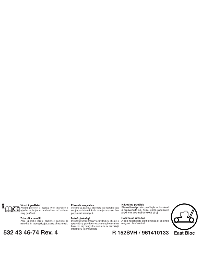 Návod k používání Prosím pøeètìte si peèlivì tyto instrukce a ujistìte se, že jím rozumíte døíve, než zaènete stroj používat. Prirucnik s naputcima Molimo da pažljivo procitate ove naputke i da stroj uporabite tek kada se uvjerite da ste ih u potpunosti razumjeli. Návod na použitie Starostlivo si prosím prečítajte tento návod a presvedčite sa, či mu úplne rozumiete pred tým, ako naštartujete stroj. Prirocnik z navodili Pred uporabo stroja preberite pazljivo ta navodila in se prepricajte, da ste jih razumeli. Instrukcja obs³ugi Proszê uwa¿nie przeczytaæ instrukcjê obs³ugi i upewniæ siê przed pierwszym uruchomieniem kosiarki, czy wszystkie zaw-arte w instrukcji informacje s¹ zrozumia³e Használati utasítás A gép használata előtt olvassa el és értse meg az utasításokat. 532 43 46-74 Rev. 4 R 152SVH / 961410133 East Bloc CZ SADRŽAJ SPIS TREŚCI STRANA PRZEPISY BEZPIECZEÑSTWA .................. 3-8 OPIS ZESPO£ÓW............................................. 9 INFORMACJE OGÓLNE................................10 MONTAŻ .......................................................11 USTAWIENIA .......................................... 11-14 URUCHAMIANIE I ZATRZYMYWANIE 14-16 UŻYTKOWANIE............................................17 OBS£UGA ................................................ 18-21 INFORMACJE OGÓLNE................................22 SIGURNOSNI PROPISI .............................. 3-8 TEHNIČNI PODACI ........................................ 9 PREGLED .................................................... 10 SKLAPANJE .................................................11 PODEŠAVANJE .......................................11-14 POKRETANJE I ZAUSTAVLJANJE ......... 14-16 UPORABA .................................................... 17 ODRŽAVANJE ......................................... 18-21 OPĆE INFORMACIJE .................................. 22 HR OBSAH STR. SK STRANA OBSAH STRANA BEZPEČNOSTNÍ POKYNY......................... 3-8 BEZPEČNOSTNÉ POKYNY ....................... 3-8 TECHNICKÉ ÚDAJE ...................................... 9 TECHNICKÉ ÚDAJE ...................................... 9 PŘEHLED..................................................... 10 PREHĽAD .................................................... 10 SESTAVENÍ ...................................................11 MONTÁŽ .......................................................11 NASTAVENÍ ..............................................11-14 NASTAVENIA ...........................................11-14 SPUŠTĚNÍ A VYPNUTÍ ........................... 14-16 ŠTART A STOP ....................................... 14-16 POUŽITÍ ....................................................... 17 POUŽITIE ..................................................... 17 ÚDRŽBA .................................................. 18-21 ÚDRŽBA .................................................. 18-21 OBECNÉ INFORMACE ................................ 22 VŠEOBECNÉ INFORMÁCIE........................ 22 SI VSEBINA HU STRAN TARTALOM CÌMOLDAL VARNOSTNI PREDPISI .............................. 3-8 BIZTONSÁGI ELŐÍRÁSOK ......................... 3-8 TEHNIČNI PODATKI ...................................... 9 TECHNIKAI ADATOK ..................................... 9 PREGLED .................................................... 10 ÁTTEKINTÈS ............................................... 10 SESTAVLJANJE ............................................11 ÖSSZESZERELÈS........................................11 NASTAVITVE ............................................11-14 BEÁLLÍTÁS ..............................................11-14 ZAGON IN IZKLOP ................................. 14-16 BEINDÍTÁS ÈS KIKAPCSOLÁS.............. 14-16 UPORABA .................................................... 17 HASZNÁLAT................................................. 17 VZDRŽEVANJE ....................................... 18-21 KARBANTARTÁS .................................... 18-21 SPLOŠNE INFORMACIJE ........................... 22 ÁLTALÁNOS INFORMÁCIÓK ...................... 22 2 Bezpečnostní pokyny pro ruční rotační sekačka na trávu CZ DLEŽITÉ: Tato traktorová sekačka dokáže vážně poranit končetiny a odmršt’ovat předměty. Nedodržení následujících bezpečnostních pokynů může mít za následek vážná nebo smrtelná poranění. I. Školení – Průprava • Pečlivě si přečtěte instrukce. Seznamte se s ovládacími prvky a správným použitím stroje. • Nikdy nedovolte dětem, nebo osobám, které nebyly seznámeny s těmito instrukcemi, aby použily sekačku. Sekačku nesmí obsluhovat osoby mladší 18 let. • Nikdy nesekejte, pokud se v blízkosti pohybují lidé, zejména dětí a domácí zvířata. • Mějte vždy na paměti, že obsluha stroje nebo uživatel, je odpovědný za nehody nebo za rizika, způsobené jiným osobám nebo na jejich majetku. • Před spuštěním motoru vypněte všechny nože a jejich pohon. • Nastartujte nebo zapněte motor podle pokynů a s dostatečnou vzdáleností nožů od nohou. • Při spuštění motoru nezvedejte sekačku, s výjimkou modelů, které je třeba při zapínání zvedat. V tomto případě, nezvedejte výše, než je nutné a zvedejte pouze tu část, která je od uživatele vzdálenější. • Nezapínejte motor pokud stojíte na straně odpadního otvoru. • Nestrkejte ruce a nohy do blízkosti nebo pod rotační nože. Vždy udržujte odpadní otvor volný. • Nikdy nezvedejte a nepřenášejte sekačku při zapnutém motoru. • Vypněte motor a vytáhněte napájecí kabel: - před odstraňováním materiálu ucpávajícího nůž nebo vyhazovací žlab; - před kontrolou, čištěním nebo údržbou traktoru; - po nárazu na cizí předmět. Zkontrolujte, zda není stroj poškozen a prověřïte stav sekačky před opětovným nastartováním a provozováním stroje; - začne-li