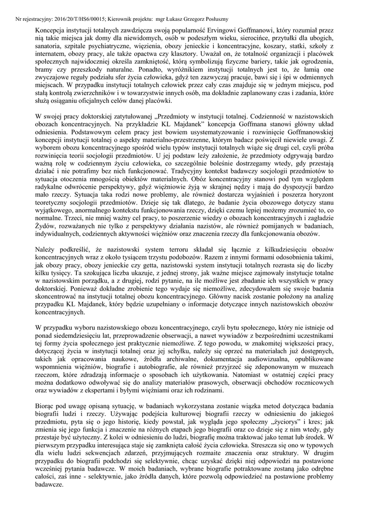 Nr rejestracyjny: 2016/20/T/HS6/00015; Kierownik projektu: mgr Łukasz Grzegorz Posłuszny Koncepcja instytucji totalnych zawdzięcza swoją popularność Ervingowi Goffmanowi, który rozumiał przez nią takie miejsca jak domy dla niewidomych, osób w podeszłym wieku, sierocińce, przytułki dla ubogich, sanatoria, szpitale psychiatryczne, więzienia, obozy jenieckie i koncentracyjne, koszary, statki, szkoły z internatem, obozy pracy, ale także opactwa czy klasztory. Uważał on, że totalność organizacji i placówek społecznych najwidoczniej określa zamkniętość, którą symbolizują fizyczne bariery, takie jak ogrodzenia, bramy czy przeszkody naturalne. Ponadto, wyróżnikiem instytucji totalnych jest to, że łamią one zwyczajowe reguły podziału sfer życia człowieka, gdyż ten zazwyczaj pracuje, bawi się i śpi w odmiennych miejscach. W przypadku instytucji totalnych człowiek przez cały czas znajduje się w jednym miejscu, pod stałą kontrolą zwierzchników i w towarzystwie innych osób, ma dokładnie zaplanowany czas i zadania, które służą osiąganiu oficjalnych celów danej placówki. W swojej pracy doktorskiej zatytułowanej „Przedmioty w instytucji totalnej. Codzienność w nazistowskich obozach koncentracyjnych. Na przykładzie KL Majdanek” koncepcja Goffmana stanowi główny układ odniesienia. Podstawowym celem pracy jest bowiem usystematyzowanie i rozwinięcie Goffmanowskiej koncepcji instytucji totalnej o aspekty materialno-przestrzenne, którym badacz poświęcił niewiele uwagi. Z wyborem obozu koncentracyjnego spośród wielu typów instytucji totalnych wiąże się drugi cel, czyli próba rozwinięcia teorii socjologii przedmiotów. U jej podstaw leży założenie, że przedmioty odgrywają bardzo ważną rolę w codziennym życiu człowieka, co szczególnie boleśnie dostrzegamy wtedy, gdy przestają działać i nie potrafimy bez nich funkcjonować. Tradycyjny kontekst badawczy socjologii przedmiotów to sytuacja otoczenia mnogością obiektów materialnych. Obóz koncentracyjny stanowi pod tym względem radykalne odwrócenie perspektywy, gdyż więźniowie żyją w skrajnej nędzy i mają do dyspozycji bardzo mało rzeczy. Sytuacja taka rodzi nowe problemy, ale również dostarcza wyjaśnień i poszerza horyzont teoretyczny socjologii przedmiotów. Dzieje się tak dlatego, że badanie życia obozowego dotyczy stanu wyjątkowego, anormalnego kontekstu funkcjonowania rzeczy, dzięki czemu lepiej możemy zrozumieć to, co normalne. Trzeci, nie mniej ważny cel pracy, to poszerzenie wiedzy o obozach koncentracyjnych i zagładzie Żydów, rozważanych nie tylko z perspektywy działania nazistów, ale również pomijanych w badaniach, indywidualnych, codziennych aktywności więźniów oraz znaczenia rzeczy dla funkcjonowania obozów. Należy podkreślić, że nazistowski system terroru składał się łącznie z kilkudziesięciu obozów koncentracyjnych wraz z około tysiącem trzystu podobozów. Razem z innymi formami odosobnienia takimi, jak obozy pracy, obozy jenieckie czy getta, nazistowski system instytucji totalnych rozrasta się do liczby kilku tysięcy. Ta szokująca liczba ukazuje, z jednej strony, jak ważne miejsce zajmowały instytucje totalne w nazistowskim porządku, a z drugiej, rodzi pytanie, na ile możliwe jest zbadanie ich wszystkich w pracy doktorskiej. Ponieważ dokładne zrobienie tego wydaje się niemożliwe, zdecydowałem się swoje badania skoncentrować na instytucji totalnej obozu koncentracyjnego. Główny nacisk zostanie położony na analizę przypadku KL Majdanek, który będzie uzupełniany o informacje dotyczące innych nazistowskich obozów koncentracyjnych. W przypadku wyboru nazistowskiego obozu koncentracyjnego, czyli bytu społecznego, który nie istnieje od ponad siedemdziesięciu lat, przeprowadzenie obserwacji, a nawet wywiadów z bezpośrednimi uczestnikami tej formy życia społecznego jest praktycznie niemożliwe. Z tego powodu, w znakomitej większości pracy, dotyczącej życia w instytucji totalnej oraz jej schyłku, należy się oprzeć na materiałach już dostępnych, takich jak opracowania naukowe, źródła archiwalne, dokumentacja audiowizualna, opublikowane wspomnienia więźniów, biografie i autobiografie, ale również przyjrzeć się zdeponowanym w muzeach rzeczom, które zdradzają informacje o sposobach ich użytkowania. Natomiast w ostatniej części pracy można dodatkowo odwoływać się do analizy materiałów prasowych, obserwacji obchodów rocznicowych oraz wywiadów z ekspertami i byłymi więźniami oraz ich rodzinami. Biorąc pod uwagę opisaną sytuację, w badaniach wykorzystana zostanie wiązka metod dotycząca badania biografii ludzi i rzeczy. Używając podejścia kulturowej biografii rzeczy w odniesieniu do jakiegoś przedmiotu, pyta się o jego historię, kiedy powstał, jak wygląda jego społeczny „życiorys” i kres; jak zmienia się jego funkcja i znaczenie na różnych etapach jego biografii oraz co dzieje się z nim wtedy, gdy przestaje być użyteczny. Z kolei w odniesieniu do ludzi, biografię można traktować jako temat lub środek. W pierwszym przypadku interesująca staje się zamknięta całość życia człowieka. Streszcza się ono w typowych dla wielu ludzi sekwencjach zdarzeń, przyjmujących rozmaite znaczenia oraz struktury. W drugim przypadku do biografii podchodzi się selektywnie, chcąc uzyskać dzięki niej odpowiedzi na postawione wcześniej pytania badawcze. W moich badaniach, wybrane biografie potraktowane zostaną jako odrębne całości, zaś inne - selektywnie, jako źródła danych, które pozwolą odpowiedzieć na postawione problemy badawcze.