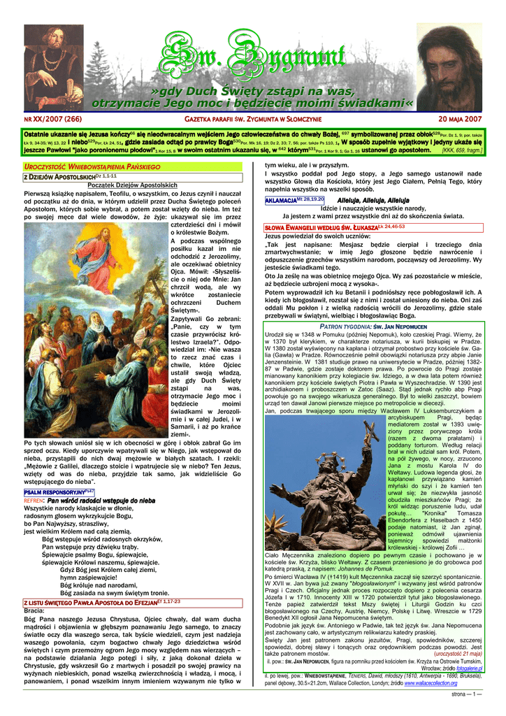 Sw. Zygmunt »gdy Duch Święty zstąpi na was, otrzymacie Jego moc i będziecie moimi świadkami« NR XX/2007 (266 266) GAZETKA PARAFII ŚW W. ZYGMUNTA W SŁOMCZYNIE 20 MAJA 2007 Ostatnie ukazanie się Jezusa kończy66 się nieodwracalnym wejściem Jego człowieczeństwa do chwały Bożej, 697 symbolizowanej przez obłok528Por. Dz 1, 9; por. także Łk 9, 34-35; Wj 13, 22 i niebo529Por, Łk 24, 51, gdzie zasiada odtąd po prawicy Boga530Por. Mk 16, 19; Dz 2, 33; 7, 56; por. także Ps 110, 1, W sposób zupełnie wyjątkowy i jedyny ukaże się jeszcze Pawłowi "jako poronionemu płodowi"1 Kor 15, 8 w swoim ostatnim ukazaniu się, w 642 którym531Por. 1 Kor 9, 1; Ga 1, 16 ustanowi go apostołem. [KKK, 659, fragm.] UROCZYSTOŚĆ WNIEBOWSTĄPIENIA PAŃSKIEGO Z DZIEJÓW APOSTOLSKICHDz 1,1-11 Początek Dziejów Apostolskich Pierwszą książkę napisałem, Teofilu, o wszystkim, co Jezus czynił i nauczał od początku aż do dnia, w którym udzielił przez Ducha Świętego poleceń Apostołom, których sobie wybrał, a potem został wzięty do nieba. Im też po swojej męce dał wiele dowodów, że żyje: ukazywał się im przez czterdzieści dni i mówił o królestwie Bożym. A podczas wspólnego posiłku kazał im nie odchodzić z Jerozolimy, ale oczekiwać obietnicy Ojca. Mówił: »Słyszeliście o niej ode Mnie: Jan chrzcił wodą, ale wy wkrótce zostaniecie ochrzczeni Duchem Świętym«. Zapytywali Go zebrani: „Panie, czy w tym czasie przywrócisz królestwo Izraela?”. Odpowiedział im: »Nie wasza to rzecz znać czas i chwile, które Ojciec ustalił swoją władzą, ale gdy Duch Święty zstąpi na was, otrzymacie Jego moc i będziecie moimi świadkami w Jerozolimie i w całej Judei, i w Samarii, i aż po krańce ziemi«. Po tych słowach uniósł się w ich obecności w górę i obłok zabrał Go im sprzed oczu. Kiedy uporczywie wpatrywali się w Niego, jak wstępował do nieba, przystąpili do nich dwaj mężowie w białych szatach. I rzekli: „Mężowie z Galilei, dlaczego stoicie i wpatrujecie się w niebo? Ten Jezus, wzięty od was do nieba, przyjdzie tak samo, jak widzieliście Go wstępującego do nieba”. PSALM RESPONSORYJNYPs47 REFREN: Pan wśród radości wstępuje do nieba Wszystkie narody klaskajcie w dłonie, radosnym głosem wykrzykujcie Bogu, bo Pan Najwyższy, straszliwy, jest wielkim Królem nad całą ziemią. Bóg wstępuje wśród radosnych okrzyków, Pan wstępuje przy dźwięku trąby. Śpiewajcie psalmy Bogu, śpiewajcie, śpiewajcie Królowi naszemu, śpiewajcie. Gdyż Bóg jest Królem całej ziemi, hymn zaśpiewajcie! Bóg króluje nad narodami, Bóg zasiada na swym świętym tronie. Z LISTU ŚWIĘTEGO PAWŁA APOSTOŁA DO EFEZJANEf 1,17-23 Bracia: Bóg Pana naszego Jezusa Chrystusa, Ojciec chwały, dał wam ducha mądrości i objawienia w głębszym poznawaniu Jego samego, to znaczy światłe oczy dla waszego serca, tak byście wiedzieli, czym jest nadzieja waszego powołania, czym bogactwo chwały Jego dziedzictwa wśród świętych i czym przemożny ogrom Jego mocy względem nas wierzących – na podstawie działania Jego potęgi i siły, z jaką dokonał dzieła w Chrystusie, gdy wskrzesił Go z martwych i posadził po swojej prawicy na wyżynach niebieskich, ponad wszelką zwierzchnością i władzą, i mocą, i panowaniem, i ponad wszelkim innym imieniem wzywanym nie tylko w tym wieku, ale i w przyszłym. I wszystko poddał pod Jego stopy, a Jego samego ustanowił nade wszystko Głową dla Kościoła, który jest Jego Ciałem, Pełnią Tego, który napełnia wszystko na wszelki sposób. AKLAMACJAMt 28,19.20 Alleluja, Alleluja, Alleluja Idźcie i nauczajcie wszystkie narody, Ja jestem z wami przez wszystkie dni aż do skończenia świata. SŁOWA EWANGELII WEDŁUG ŚW. ŁUKASZAŁk 24,46-53 Jezus powiedział do swoich uczniów: „Tak jest napisane: Mesjasz będzie cierpiał i trzeciego dnia zmartwychwstanie; w imię Jego głoszone będzie nawrócenie i odpuszczenie grzechów wszystkim narodom, począwszy od Jerozolimy. Wy jesteście świadkami tego. Oto Ja ześlę na was obietnicę mojego Ojca. Wy zaś pozostańcie w mieście, aż będziecie uzbrojeni mocą z wysoka«. Potem wyprowadził ich ku Betanii i podniósłszy ręce pobłogosławił ich. A kiedy ich błogosławił, rozstał się z nimi i został uniesiony do nieba. Oni zaś oddali Mu pokłon i z wielką radością wrócili do Jerozolimy, gdzie stale przebywali w świątyni, wielbiąc i błogosławiąc Boga. PATRON TYGODNIA: ŚW. JAN NEPOMUCEN Urodził się w 1348 w Pomuku (później Nepomuk), koło czeskiej Pragi. Wiemy, że w 1370 był klerykiem, w charakterze notariusza, w kurii biskupiej w Pradze. W 1380 został wyświęcony na kapłana i otrzymał probostwo przy kościele św. Galia (Gawła) w Pradze. Równocześnie pełnił obowiązki notariusza przy abpie Janie Jenzensteinie. W 1381 studiuje prawo na uniwersytecie w Pradze, póżniej 138287 w Padwie, gdzie zostaje doktorem prawa. Po powrocie do Pragi zostaje mianowany kanonikiem przy kolegiacie św. Idziego, a w dwa lata potem również kanonikiem przy kościele świętych Piotra i Pawła w Wyszechradzie. W 1390 jest archidiakonem i proboszczem w Zatoc (Saaz). Stąd jednak rychło abp Pragi powołuje go na swojego wikariusza generalnego. Był to wielki zaszczyt, bowiem urząd ten dawał Janowi pierwsze miejsce po metropolicie w diecezji. Jan, podczas trwającego sporu między Wacławem IV Luksemburczykiem a arcybiskupem Pragi, będąc mediatorem został w 1393 uwięziony przez porywczego króla (razem z dwoma prałatami) i poddany torturom. Według relacji brał w nich udział sam król. Potem, na pół żywego, w nocy, zrzucono Jana z mostu Karola IV do Wełtawy. Ludowa legenda głosi, że kapłanowi przywiązano kamień młyński do szyi i że kamień ten urwał się; że niezwykła jasność obudziła mieszkańców Pragi; że król widząc poruszenie ludu, udał pokutę… "Kronika" Tomasza Ebendorfera z Haselbach z 1450 podaje nat