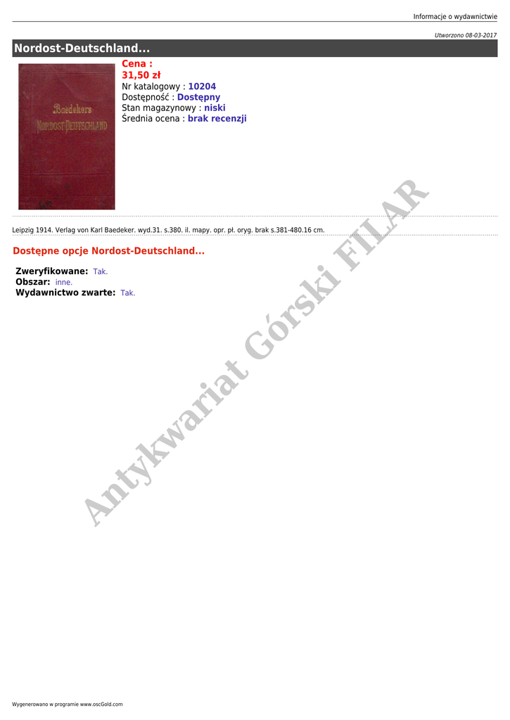 Informacje o wydawnictwie Utworzono 08-03-2017 Nordost-Deutschland... Cena : 31,50 zł Leipzig 1914. Verlag von Karl Baedeker. wyd.31. s.380. il. mapy. opr. pł. oryg. brak s.381-480.16 cm. FI Dostępne opcje Nordost-Deutschland... An ty k w ar ia t G ór sk i Zweryfikowane: Tak. Obszar: inne. Wydawnictwo zwarte: Tak. Wygenerowano w programie www.oscGold.com LA R Nr katalogowy : 10204 Dostępność : Dostępny Stan magazynowy : niski Średnia ocena : brak recenzji
