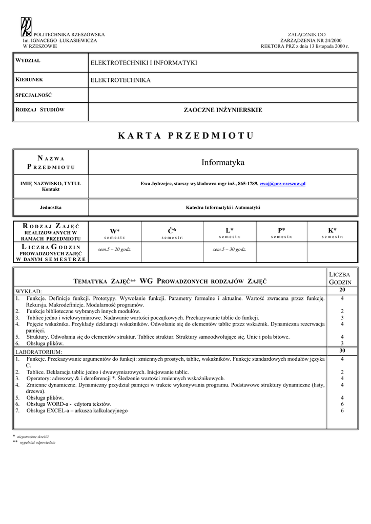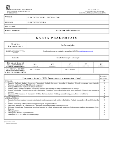 POLITECHNIKA RZESZOWSKA Im. IGNACEGO ŁUKASIEWICZA W RZESZOWIE ZAŁĄCZNIK DO ZARZĄDZENIA NR 24/2000 REKTORA PRZ z dnia 13 listopada 2000 r. WYDZIAŁ ELEKTROTECHNIKI I INFORMATYKI KIERUNEK ELEKTROTECHNIKA SPECJALNOŚĆ RODZAJ STUDIÓW ZAOCZNE INŻYNIERSKIE KARTA PRZEDMIOTU N AZWA P RZEDMIOTU Informatyka IMIĘ NAZWISKO, TYTUŁ Kontakt Ewa Jędrzejec, starszy wykładowca mgr inż., 865-1789, [email protected] Jednostka Katedra Informatyki i Automatyki R ODZAJ Z AJĘĆ REALIZOWANYCH W RAMACH PRZEDMIOTU L ICZBA G ODZIN PROWADZONYCH ZAJĘĆ W DANYM S E M E S T R Z E W* Ć* s e m e s t r: s e m e s t r: sem.5 – 20 godz. L* P* K* s e m e s t r: s e m e s t r: s e m e s t r: sem.5 – 30 godz. TEMATYKA ZAJĘĆ** WG PROWADZONYCH RODZAJÓW ZAJĘĆ WYKŁAD: 1. Funkcje. Definicje funkcji. Prototypy. Wywołanie funkcji. Parametry formalne i aktualne. Wartość zwracana przez funkcję. Rekursja. Makrodefinicje. Modularność programów. 2. Funkcje biblioteczne wybranych innych modułów. 3. Tablice jedno i wielowymiarowe. Nadawanie wartości początkowych. Przekazywanie tablic do funkcji. 4. Pojęcie wskaźnika. Przykłady deklaracji wskaźników. Odwołanie się do elementów tablic przez wskaźnik. Dynamiczna rezerwacja pamięci. 5. Struktury. Odwołania się do elementów struktur. Tablice struktur. Struktury samoodwołujące się. Unie i pola bitowe. 6. Obsługa plików. LABORATORIUM: 1. Funkcje. Przekazywanie argumentów do funkcji: zmiennych prostych, tablic, wskaźników. Funkcje standardowych modułów języka C. 2. Tablice. Deklaracja tablic jedno i dwuwymiarowych. Inicjowanie tablic. 3. Operatory: adresowy & i dereferencji *. Śledzenie wartości zmiennych wskaźnikowych. 4. Zmienne dynamiczne. Dynamiczny przydział pamięci w trakcie wykonywania programu. Podstawowe struktury dynamiczne (listy, drzewa). 5. Obsługa plików. 6. Obsługa WORD-a - edytora tekstów. 7. Obsługa EXCEL-a – arkusza kalkulacyjnego * niepotrzebne skreślić ** wypełniać odpowiednio LICZBA GODZIN 20 4 2 3 4 4 3 30 4 2 4 4 4 6 6 c. d. KARTY PRZEDMIOTU: Informatyka L. p. 1. 2. 3. 4. 5. 6. WYKAZ ZALECANEJ LITERATURY Thomas H. Cormen, Charles E. Leiserson, Ronald L. Rivest, Wprowadzenie do algorytmów, WNT, Warszawa 1997. Brian W. Kernighan, Dennis M. Ritchie, Język ANSI C, WNT, Warszawa 1998. Andrzej Zalewski, Programowanie w językach C i C++ z wykorzystaniem pakietu Borland C++, Nakom, Poznań 1998. Stephen Prata, Język C szkoła programowania, Wydawnictwo Robomatic, Wrocław 1999. .A. Drozdek, D. Simon, Struktury danych w języku C, WNT Warszawa 1996. Alfred V. Aho, Jeffrey D. Ullman, Wykłady z informatyki z przykładami w języku C, Helion Gliwice 2003 FORMA I WARUNKI ZALICZENIA PRZEDMIOTU (RODZAJU ZAJĘĆ) WYKŁAD: Egzamin: Praktyczne sprawdzenie na komputerze opanowanych treści programowych. LABORATORIUM: Średnia z krótkich kartkówek sprawdzających przygotowanie studenta do zajęć. Wykonanie zaleconych programów. PODPISY: .......................................................................................................................................................... nauczyciela akademickiego odpowiedzialnego za przedmiot data ........................................................................................................................................................ kierownika zakładu/katedry akceptującego kartę data
