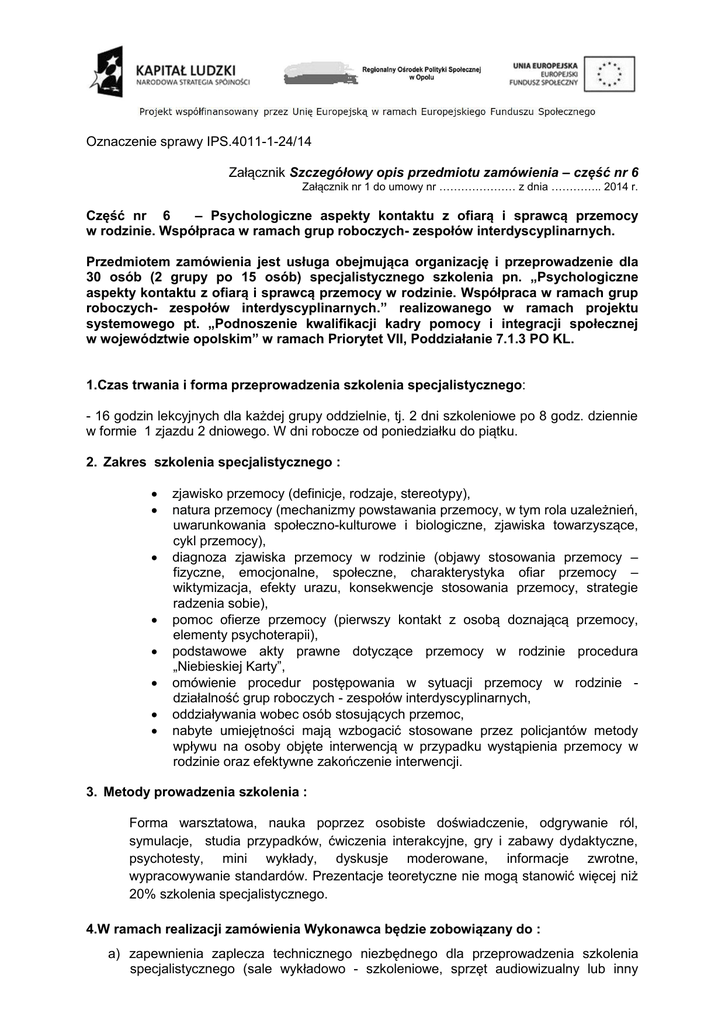 Oznaczenie sprawy IPS.4011-1-24/14 Załącznik Szczegółowy opis przedmiotu zamówienia – część nr 6 Załącznik nr 1 do umowy nr ………………… z dnia ………….. 2014 r. Część nr 6 – Psychologiczne aspekty kontaktu z ofiarą i sprawcą przemocy w rodzinie. Współpraca w ramach grup roboczych- zespołów interdyscyplinarnych. Przedmiotem zamówienia jest usługa obejmująca organizację i przeprowadzenie dla 30 osób (2 grupy po 15 osób) specjalistycznego szkolenia pn. „Psychologiczne aspekty kontaktu z ofiarą i sprawcą przemocy w rodzinie. Współpraca w ramach grup roboczych- zespołów interdyscyplinarnych.” realizowanego w ramach projektu systemowego pt. „Podnoszenie kwalifikacji kadry pomocy i integracji społecznej w województwie opolskim” w ramach Priorytet VII, Poddziałanie 7.1.3 PO KL. 1.Czas trwania i forma przeprowadzenia szkolenia specjalistycznego: - 16 godzin lekcyjnych dla każdej grupy oddzielnie, tj. 2 dni szkoleniowe po 8 godz. dziennie w formie 1 zjazdu 2 dniowego. W dni robocze od poniedziałku do piątku. 2. Zakres szkolenia specjalistycznego : zjawisko przemocy (definicje, rodzaje, stereotypy), natura przemocy (mechanizmy powstawania przemocy, w tym rola uzależnień, uwarunkowania społeczno-kulturowe i biologiczne, zjawiska towarzyszące, cykl przemocy), diagnoza zjawiska przemocy w rodzinie (objawy stosowania przemocy – fizyczne, emocjonalne, społeczne, charakterystyka ofiar przemocy – wiktymizacja, efekty urazu, konsekwencje stosowania przemocy, strategie radzenia sobie), pomoc ofierze przemocy (pierwszy kontakt z osobą doznającą przemocy, elementy psychoterapii), podstawowe akty prawne dotyczące przemocy w rodzinie procedura „Niebieskiej Karty”, omówienie procedur postępowania w sytuacji przemocy w rodzinie działalność grup roboczych - zespołów interdyscyplinarnych, oddziaływania wobec osób stosujących przemoc, nabyte umiejętności mają wzbogacić stosowane przez policjantów metody wpływu na osoby objęte interwencją w przypadku wystąpienia przemocy w rodzinie oraz efektywne zakończenie interwencji. 3. Metody prowadzenia szkolenia : Forma warsztatowa, nauka poprzez osobiste doświadczenie, odgrywanie ról, symulacje, studia przypadków, ćwiczenia interakcyjne, gry i zabawy dydaktyczne, psychotesty, mini wykłady, dyskusje moderowane, informacje zwrotne, wypracowywanie standardów. Prezentacje teoretyczne nie mogą stanowić więcej niż 20% szkolenia specjalistycznego. 4.W ramach realizacji zamówienia Wykonawca będzie zobowiązany do : a) zapewnienia zaplecza technicznego niezbędnego dla przeprowadzenia szkolenia specjalistycznego (sale wykładowo - szkoleniowe, sprzęt audiowizualny lub inny niezbędny dla przeprowadzenia szkoleniowych określa pkt. 8, szkolenia). Standardy sal wykładowo - b) zapewnienia materiałów szkoleniowych (adekwatnych do tematyki szkolenia specjalistycznego, zawierających wyczerpujące treści przedmiotowo związane z tematyką szkolenia) oraz przedstawienie materiałów szkoleniowych Zamawiającemu do zatwierdzenia na co najmniej 5 dni roboczych przed planowanym terminem szkolenia, c) przygotowania szczegółowego programu merytorycznego szkolenia specjalistycznego uwzględniającego zakres szkolenia wskazanego w przedmiocie zamówienia i przedłożenia go do akceptacji Zamawiającemu nie później niż w ciągu 7 dni roboczych od dnia podpisania umowy, d) przedłożenia do akceptacji Zamawiającemu harmonogramu szkolenia specjalistycznego ze wskazaniem miejsca oraz terminów organizowanego szkolenia nie później niż w ciągu 7 dni roboczych od dnia podpisania umowy, e) obsługi administracyjnej szkolenia, f) zapewnienia zakwaterowania na czas trwania z zachowaniem standardu opisanego w pkt. 6. szkolenia specjalistycznego g) zapewnienia pełnego wyżywienia uczestników na czas trwania 1 zjazdu w ramach szkolenia specjalistycznego, tj. każdemu uczestnikowi zapewnia się jedno śniadanie (drugi dzień), 2 obiady, jedną kolację (pierwszy dzień), 4 przerwy kawowe – 2 przerwy kawowe w ciągu jednego dnia szkolenia, Specyfikację i standardy wyżywienia określa pkt. 7. 5.Do obowiązków Wykonawcy należeć będzie także: a) promocja usługi na zasadach określonych w Umowie, zgodnie z § 12 umowy, b) przygotowanie oraz wydanie uczestnikom zaświadczenia o ukończeniu szkolenia specjalistycznego, zgodnie ze wzorem Zamawiającego oraz sporządzenie rejestru wydanych zaświadczeń. Zaświadczenia muszą być podpisywane przez Dyrektora ROPS oraz wykładowców, po czym ksero poświadczone za zgodność Wykonawca będzie zobowiązany przedłożyć Zamawiającemu wraz z innymi dokumentami wskazanymi w przedmiocie zamówienia. Pozostałe dokumenty będą przekazywane Zamawiającemu w oryginale, tj. listy obecności, ankiety (końcowa), lista odbioru materiałów szkoleniowych oraz materiałów do szkoleń, c) sporządzenie odbioru materiałów szkoleniowych oraz materiałów do szkoleń przekazanych przez Zamawiającego, tj. notes oraz długopis potwierdzonego podpisami uczestników szkolenia (odbiór może być częścią listy obecności – dodatkowe kolumny), d) prowadzanie list obecności, e) niezwłoczne informowanie Zamawiającego o występujących trudnościach w realizacji usługi, a w szczególności o każdym przypadku rezygnacji z uczestnictwa w szkoleniu specjalistycznym przez osoby zakwalifikowane do odbycia szkolenia, f) złożenie Zamawiającemu sprawozdania końcowego po wykonaniu usługi (wg wzoru Zamawiającego), g) dokonanie oceny (przekazanie, zebranie i podsumowanie ankiet) efektywności szkolenia na podstawie kwestionariusza ankiety końcowej szkolenia specjalistycznego (według wzoru Zamawiającego). Ww. ocena zostanie przekazana Zamawiającemu po zakończeniu usługi. 6.Standardy zakwaterowania: a) maksymalnie 3 osoby w pokoju, b) pomieszczenia przeznaczone do zakwaterowania muszą spełniać wymagania sanitarne, przeciwpożarowe oraz inne 