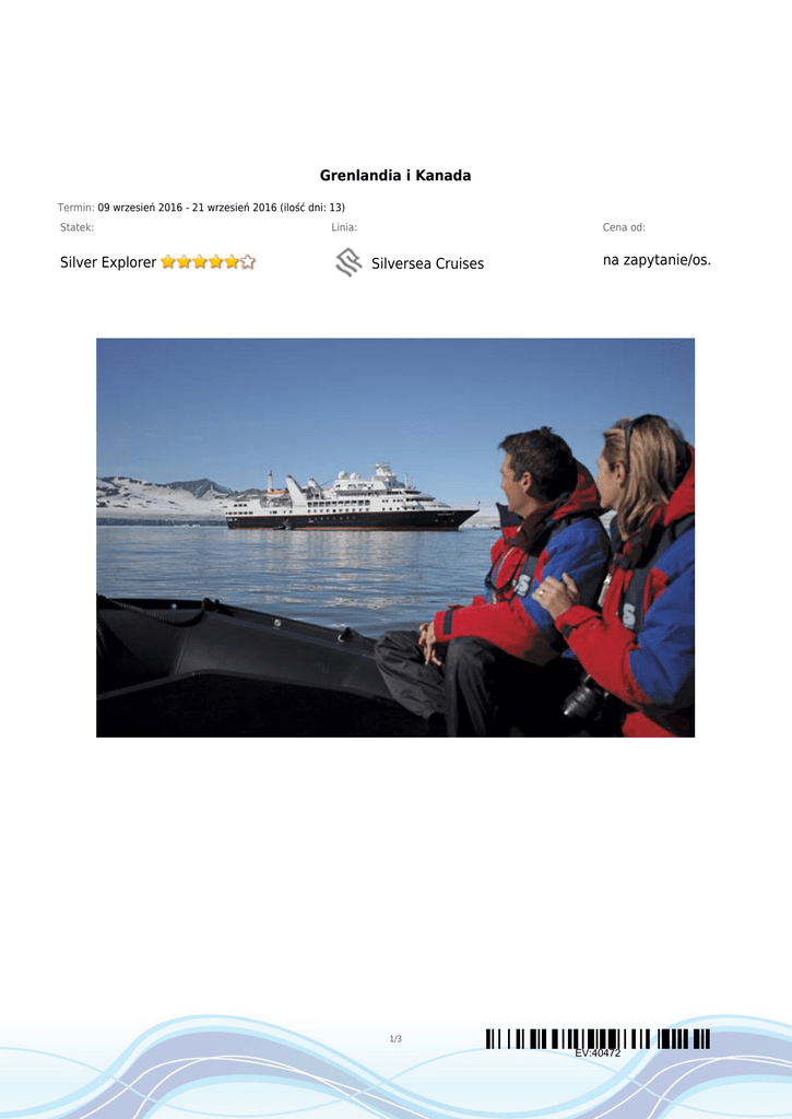 Grenlandia i Kanada Termin: 09 wrzesień 2016 - 21 wrzesień 2016 (ilość dni: 13) Statek: Silver Explorer Linia: Cena od: Silversea Cruises na zapytanie/os. 1/3 EV:40472 TRASA REJSU dzień 1 dzień 2 dzień 2 dzień 3 Data Port Wpłynięcie Wypłynięcie piątek 09.09.2016 Kangerlussuaq --:-- 17:00 sobota 10.09.2016 Kangaamiut 06:30 12:00 sobota 10.09.2016 Evighedsfjorden 15:00 19:30 08:30 16:30 niedziela 11.09.2016 Grenlandia Grenlandia Grenlandia Nuuk Grenlandia dzień 4 poniedziałek 12.09.2016 Dzień na morzu --:-- --:-- dzień 5 wtorek 13.09.2016 Iqaluit , Nunavut 13:30 19:00 środa 14.09.2016 Lower Savage Islands 08:30 14:00 środa 14.09.2016 Resolution Island, Nunavut 16:30 19:30 czwartek 15.09.2016 Akpatok , Nunavut 06:00 14:00 piątek 16.09.2016 Kangiqsurjuaq 07:00 16:00 dzień 9 sobota 17.09.2016 Dzień na morzu --:-- --:-- dzień 10 niedziela 18.09.2016 Dzień na morzu --:-- --:-- dzień 11 poniedziałek 19.09.2016 Red Bay 07:30 11:00 dzień 6 dzień 6 dzień 7 dzień 8 Kanada Kanada Kanada Kanada Kanada Kanada 2/3 EV:40472 Legenda dzień 11 Data Port Wpłynięcie Wypłynięcie poniedziałek 19.09.2016 Anse aux Meadows, Nowa Funlandia i Labrador 15:00 19:00 06:30 14:00 08:00 --:-- Legenda Kanada dzień 12 dzień 13 wtorek 20.09.2016 Twillengate środa 21.09.2016 St. John's, Nowa Funlandia i Labrador Kanada Kanada CENNIK Cena katalogowa Suite (apartament) od €6 150.00 Kabina jednoosobowa na zapytanie 3 osoba dorosła w kabinie na zapytanie dziecko do 12 lat jako 3 osoba w kabinie na zapytanie Opłaty portowe Cena promocyjna w cenie Uwaga! Ceny za osobę w kabinie dwuosobowej. Cena zawiera: zakwaterowanie w kabinie wybranej kategorii; wyżywienie - 3 główne posiłki, przekąski między posiłkami, bufet lub przekąski o północy; 24 - godzinny serwis kabinowy; serwis kamerdynera; napoje - open bar: kawa, herbata, woda, wybrane wina, alkohole i napoje bezalkoholowe, mini bar w kabinie uzupełniany na zamówienie; serwis bagażowy podczas wejścia i zejścia ze statku; korzystanie ze wszystkich urządzeń sportowo - rekreacyjnych znajdujących się na pokładzie statku (basen, jacuzzi, sala fitness, itp.); udział we wszystkich imprezach organizowanych na statku (przedstawienia w teatrze, koncerty, programy animacyjne itp.) oraz sportach wodnych: snorkeling, narty wodne, windsurfing, banan, kajaki; napiwki dla obsługi statku. W wybranych miastach transport port - centrum. Cena nie zawiera: kosztów dojazdu do portu; ewentualnych noclegów w hotelu przed/po rejsie i transferów; wycieczek fakultatywnych w trakcie rejsu; napojów, wina i alkoholi premium nie objętych ofertą open baru ; korzystania z punktów usługowych (fryzjer, pralnia, fotograf, salon piękności i odnowy biologicznej, internet) i wydatków osobistych; ubezpieczenia KL, NNW i bagaż; kosztu wymaganych wiz. 3/3 EV:40472