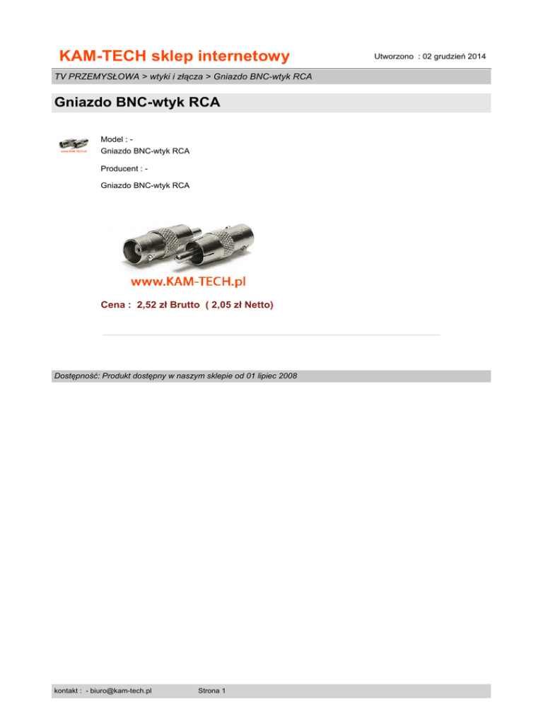 KAM-TECH sklep internetowy TV PRZEMYSŁOWA > wtyki i złącza > Gniazdo BNC-wtyk RCA Gniazdo BNC-wtyk RCA Model : Gniazdo BNC-wtyk RCA Producent : Gniazdo BNC-wtyk RCA Cena : 2,52 zł Brutto ( 2,05 zł Netto) Dostępność: Produkt dostępny w naszym sklepie od 01 lipiec 2008 kontakt : - [email protected] Strona 1 Utworzono : 02 grudzień 2014