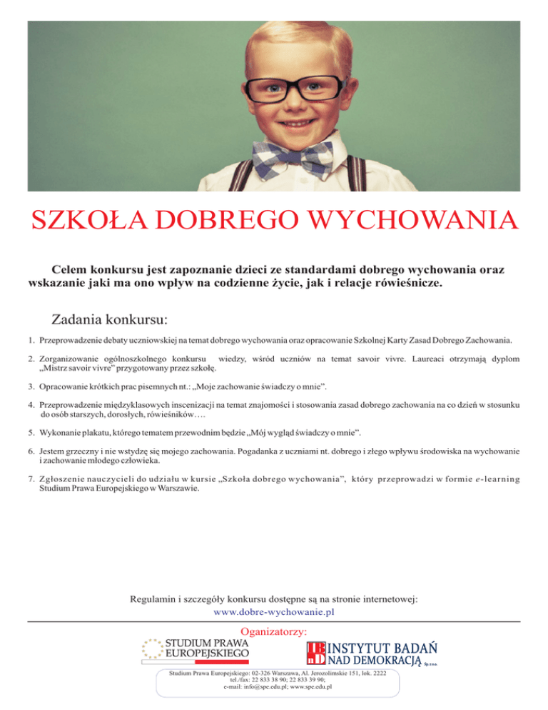 SZKO£A DOBREGO WYCHOWANIA Celem konkursu jest zapoznanie dzieci ze standardami dobrego wychowania oraz wskazanie jaki ma ono wp³yw na codzienne ¿ycie, jak i relacje rówieœnicze. Zadania konkursu: 1. Przeprowadzenie debaty uczniowskiej na temat dobrego wychowania oraz opracowanie Szkolnej Karty Zasad Dobrego Zachowania. 2. Zorganizowanie ogólnoszkolnego konkursu wiedzy, wœród uczniów na temat savoir vivre. Laureaci otrzymaj¹ dyplom „Mistrz savoir vivre” przygotowany przez szko³ê. 3. Opracowanie krótkich prac pisemnych nt.: „Moje zachowanie œwiadczy o mnie”. 4. Przeprowadzenie miêdzyklasowych inscenizacji na temat znajomoœci i stosowania zasad dobrego zachowania na co dzieñ w stosunku do osób starszych, doros³ych, rówieœników…. 5. Wykonanie plakatu, którego tematem przewodnim bêdzie „Mój wygl¹d œwiadczy o mnie”. 6. Jestem grzeczny i nie wstydzê siê mojego zachowania. Pogadanka z uczniami nt. dobrego i z³ego wp³ywu œrodowiska na wychowanie i zachowanie m³odego cz³owieka. 7. Zg³oszenie nauczycieli do udzia³u w kursie „Szko³a dobrego wychowania ”, który przeprowadzi w formie e-learning Studium Prawa Europejskiego w Warszawie. Regulamin i szczegó³y konkursu dostêpne s¹ na stronie internetowej: www.dobre-wychowanie.pl Oganizatorzy: IB INSTYTUT BADAÑ n D NAD DEMOKRACJ¥ Studium Prawa Europejskiego: 02-326 Warszawa, Al. Jerozolimskie 151, lok. 2222 tel./fax: 22 833 38 90; 22 833 39 90; e-mail: [email protected]; www.spe.edu.pl Sp. z o.o.