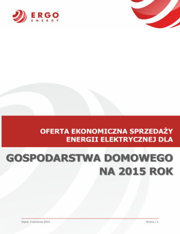 OFERTA EKONOMICZNA SPRZEDAŻY ENERGII ELEKTRYCZNEJ DLA GOSPODARSTWA DOMOWEGO NA 2015 ROK Sopot, 2 września 2014 Strona | 1 1. DANE O OFERENCIE. 1.1. Nazwa: ERGO ENERGY Sp. z o.o. 1.2. Adres: M. Reja 13/15, 81-874 Sopot 1.3. Telefon: +48 58 732 85 00 1.4. Faks: +48 58 732 85 01 1.5. E-mail: [email protected] 1.6. www: www.ergoenergy.pl 1.7. NIP: 5851460460 1.8. REGON: 221202178 1.9 Oznaczenie sądu rejestrowego oraz nr KRS: Sąd Rejonowy Gdańsk - Północ w Gdańsku, VIII Wydział Gospodarczy Krajowego Rejestru Sądowego, Numer KRS: 0000384391 1.10. 2. PROFIL DZIAŁALNOŚCI. Kapitał zakładowy/wpłacony: 1.066.000,00 zł. ERGO ENERGY Sp. z o.o. zajmuje się sprzedażą energii elektrycznej odbiorcom indywidualnym oraz biznesowym na terenie Polski. 3. TERMIN WAŻNOŚCI OFERTY. Termin ważności oferty upływa dnia 30.06.2015 roku godz. 15:00. 4. PRZEDMIOT OFERTY. Sprzedaż energii elektrycznej dla obiektów należących do Odbiorcy. 5. ZAKRES SPRZEDAŻY. Sprzedaż energii elektrycznej w ilości zgodniej z zapotrzebowaniem Odbiorcy. 6. OKRES REALIZACJI OFERTY. Umowa zostanie zawarta na czas określony z sześciomiesięcznym okresem wypowiedzenia. 7. ZASADY ROZLICZEŃ NA RYNKU W zakresie prowadzenia rozliczeń odchyleń proponujemy Państwu wariant BILANSUJĄCYM. w którym ryzyko (koszty) związane z rozliczaniem odchyleń rzeczywistego poboru energii od godzinowo - dobowych planów zapotrzebowania, ponoszone jest w całości przez ERGO ENERGY Sp. z o.o. 8. WARUNKI PŁATNOŚCI I TERMINY ROZLICZEŃ. Sopot, 2 września 2014 Proponujemy Państwu prowadzenie rozliczeń w cyklu miesięcznym z 14-dniowym terminem płatności liczonym od daty wystawienia faktury. Strona | 2 Rozliczenie ilości energii elektrycznej nastąpi na podstawie danych pomiarowych odczytanych i przekazanych Sprzedawcy przez Operatora Systemu Dystrybucyjnego. 9. WARUNKI REALIZACJI OFERTY. Sprzedaż energii oraz usług będzie realizowana zgodnie z zasadami określonymi w niniejszej ofercie i załączniku do niniejszej oferty. Przed akceptacją oferty Odbiorca może zwrócić się do ERGO ENERGY Sp. z o.o. o przedstawienie projektu Umowy sprzedaży energii elektrycznej. 10. WARUNKI DODATKOWE. Niniejszy dokument stanowi ofertę w rozumieniu art. 66 Kodeksu Cywilnego. Przyjęcie oferty sprzedaży następuje poprzez podpisanie niniejszej oferty przez osoby uprawnione do reprezentowania firmy oraz przekazanie podpisanej oferty do: ERGO ENERGY Sp. z o.o. (adres mail: [email protected]; adres korespondencyjny ul. Al. Zwycięstwa 96/98 81451 Gdynia). Podpisanie niniejszej Oferty jest równoznaczne z zawarciem Umowy. Zawarcie powyższej umowy zostanie potwierdzone dokumentem umowy, który Adresat Oferty (Odbiorca) zobowiązuje się podpisać w terminie 14 dni od przyjęcia niniejszej Oferty i odesłać na wskazany powyżej adres. Treść niniejszej oferty stanowi tajemnicę handlową Oferenta. Nie może być bez zgody wyrażonej na piśmie przez Oferenta ujawniona osobom trzecim w jakiejkolwiek formie, za wyjątkiem doradców prawnych i podatkowych, pracowników i przedstawicieli Adresata Oferty dla potrzeb oceny warunków współpracy. Obowiązek zachowania tajemnicy nie dotyczy przypadków przewidzianych w bezwzględnie obowiązujących przepisach prawa. Sopot, 2 września 2014 Strona | 3 ZAŁĄCZNIK NR 1. 1. W ramach obowiązywania umowy sprzedaży rozliczenia za energię elektryczną będą się odbywały na podstawie ceny za energię elektryczną w wysokości: Okres dostawy od 01.01.2015 do 31.12.2015 roku G11 Cena sprzedaży energii zł/MWh 245,00 2. Opłaty handlowe: a) za prowadzoną przez sprzedawcę obsługę handlową związaną z wystawianiem faktur i ich dostarczeniem stosowana będzie opłata w wysokości: 0 zł 3. Powyższa propozycja cenowa uwzględnia koszty Państwa odchylenia od planowanej pozycji zgodnie z zasadami opisanymi w punkcie 7 oferty. 4. Gwarantujemy niezmienność przedstawionych cen w okresie umownym z zastrzeżeniem przypadków: a) zmiany ustawy o podatku akcyzowym, b) zmian regulacji dotyczących podatku VAT, c) zmniejszenie uprawnień do emisji dwutlenku węgla do atmosfery wynikającymi z regulacji ustawowych lub dyrektyw UE, d) wprowadzeniem przez Prezesa Urzędu Regulacji Energetyki obowiązku zatwierdzania przez ERGO ENERGY Sp. z o.o. taryf lub nałożenia przez Prezesa Urzędu Regulacji Energetyki dodatkowych obowiązków związanych z zakupem praw majątkowych. 5. Ceny energii elektrycznej ustalone w niniejszej ofercie zawiera podatek akcyzowy, koszty bilansowania handlowego oraz koszty związane z zakupem praw majątkowych w ilościach zgodnych ze stanem prawnym na dzień złożenia oferty. 6. W przypadku zmiany powszechnie obowiązujących przepisów prawa, w szczególności skutkujących zmianą kwoty podatku akcyzowego oraz zakresu obowiązków zawiązanych z zakupem praw majątkowych, bądź wprowadzenia obowiązku zakupu praw majątkowych innych niż obowiązujące na dzień złożenia oferty, ceny energii elektrycznej, o których mowa w niniejszej ofercie mogą ulec zmianie z uwzględnieniem kosztów wynikających z obowiązków nałożonych właściwymi przepisami od dnia obowiązywania nowych lub zmienionych przepisów. 7. Nie będą Państwo ponosili kosztów związanych z obsługą transakcji w tym odczytów i rozliczeń. 8. Do oferowanej ceny zostanie naliczony podatek VAT zgodnie z obowiązującymi przepisami. Sopot, 2 września 2014 Strona | 4 9. W oparciu o art. 72 KC zastrzegamy, że treść niniejszej oferty stanowi tajemnicę handlową i nie może być ujawniana i udostępniana osobom trzecim. 10. ERGO ENERGY Sp. z o.o. zastrzega sobie prawo do zmiany lub odwołania niniejszej ofert bez podawania przyczyny. 11. W przypadku przyjęcia niniejszej oferty prosimy i pisemne potwierdzenie tego faktu w formie oświadczenia podpisanego zgodnie z zasadami reprezentacji. Ceny energii elektrycznej ustalone w niniejszej ofercie są cenami energii elektrycznej dla Odbiorcy końcowego. C