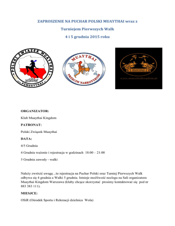 ZAPROSZENIE NA PUCHAR POLSKI MUAYTHAI wraz z Turniejem Pierwszych Walk 4 i 5 grudnia 2015 roku ORGANIZATOR: Klub Muaythai Kingdom PATRONAT: Polski Związek Muaythai DATA: 4/5 Grudnia 4 Grudnia ważenie i rejestracja w godzinach 18:00 – 21:00 5 Grudnia zawody - walki Należy zwrócić uwagę , że rejestracja na Puchar Polski oraz Turniej Pierwszych Walk odbywa się 4 grudnia a Walki 5 grudnia. Istnieje możliwość noclegu na Sali organizatora Muaythai Kingdom Warszawa (kluby chcące skorzystać prosimy kontaktować się pod nr 883 383 111). MIESJCE: OSiR (Ośrodek Sportu i Rekreacji dzielnica Wola) ul. Redutowa 37 01-106 Warszawa Zgłoszenia na Puchar Polski Juniorów i seniorów oraz Turniej Pierwszych Walk prosimy kierować na email [email protected] Termin zgłoszeń upływa z dniem 01.12.2015 roku. Kontakt do organizatora: Rafał Simonides +48 883 383 111 Email [email protected] Zgłoszenia: Zainteresowane startem kluby prosimy o zgłaszanie drogą mailową swoich zawodników, podając w mailu informacje według poniższego schematu: Puchar Polski Muaythai juniorów i seniorów lub Turniej Pierwszych Walk lub Turniej Wai Khru Imię i nazwisko - klub - kategoria wiekowa (oraz data urodzenia – KONIECZNIE!) kategoria wagowa UWAGA ! Podanie daty urodzenia jest obowiązkowe WAŻNE: 1. Sprzęt ochronny do walki zapewnia organizator. 2. Zawodnik musi posiadać - spodenki, koszulkę na ramiączkach (niebieską i czerwoną), ochraniacz krocza (metalowy), ochraniacz szczęki, bandaże bokserskie (bawełniane, zakaz używania plastrów!). Koszulki tylko na ramiączkach! ochraniacz krocza TYLKO METALOWE - wiązane (zgodnie z przepisami IFMA) obowiązkowy mongkom - WŁASNY (klubowy) Proszę pamiętać że warunkiem udziału w turnieju jest: - posiadanie książeczki sportowo-lekarskiej lub zaświadczenia od lekarza sportowego z aktualnymi badaniami z wpisem „zdolny do treningów i startów w zawodach w dyscyplinie muaythai”, - ubezpieczenie NNW z datą ważności pokrywającą się z datą turnieju, - w przypadku zawodników i zawodniczek niepełnoletnich podpisana zgoda rodziców do udziału w turnieju, - wypełniony formularz zgłoszeniowy (posiadany przy rejestracji), - w przypadku zawodników zrzeszonych posiadanie licencji na dany rok kalendarzowy (możliwość wykupienia na miejscu koszt 30zł/rok), - w przypadku zawodników niezrzeszonych wykupienie na miejscu licencji jednorazowej koszt 30 zł, - dokonana opłata startowa: 50 zł zrzeszeni/70 zł niezrzeszeni (Puchar Polski), 30 zł zrzeszeni/40 zł niezrzeszeni (Turniej Pierwszych Walk), - w przypadku braku sędziego powołanego na zawody klub uiszcza opłatę w wysokości 100 zł. Za dopilnowanie wysokości opłat, odpowiedzialny w każdym wypadku jest organizator. Opłata startowa zasila budżet organizatora, pomniejszona o różnicę dla członków niezrzeszonych, która zasila budżet PZMT. Turniej Tańca WAI KHRU: Rejestracja 5 grudnia od godziny 8:00 do godziny 10:00 Wymagania: - oświadczenie- formularz zgłoszeniowy wypełniany na miejscu - dokonanie opłaty wpisowego 30 zł (dla zawodników i zawodniczek zawodnicy biorący ch udział w walkach Pucharu Polski 15 zł), - strój (spodenki muaythai, t-shirt lub koszulka na ramiączkach), mongkom (mile widziane prajaty). Uwaga: Turniej tańca Wai Khru jest otwarty dla wszystkich kategorii wiekowo-wagowych nie tylko dla juniorów i seniorów.
