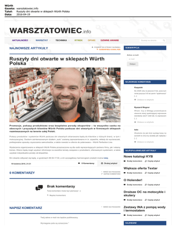 Würth Gazeta: warsztatowiec.info Tytuł: Ruszyły dni otwarte w sklepach Würth Polska Data: 2016-04-19 AKTUALNOŚCI WARSZTAT TECHNIKA RYNEK OPINIE DZIWNE AWARIE ⌂ POWRÓT DO STRONY GŁÓWNEJ SUBSKRYBUJ KANAŁ RSS NAJNOWSZE ARTYKUŁY Szukaj na stronie.. SUBSKRYPCJA Adres e-mail: Ruszyły dni otwarte w sklepach Würth Polska e-mail Dołącz NAJNOWSZE KOMENTARZE Kszysiek Do 2025 roku to jeszcze 9 lat, poza tym minie jeszcze 5-6 lat zanim "spalinowce" [...] Zobacz w artykule Ryszard Wegner Witam. Czy w Elblągu przewidujecie otwarcie stacji spełniającej najnowsze standardy sieci? Jeśli tak, to zapraszam [...] Zobacz w artykule Promocje, pokazy produktowe oraz bezpłatne porady ekspertów – to wszystko czeka na obecnych i przyszłych klientów Würth Polska podczas dni otwartych w firmowych sklepach rozmieszczonych na terenie całej Polski. kolo Wiadomo że jak ktoś wydaję kasę na Pokazy produktów i systemów Würth podczas dni otwartych skierowane będą do klientów z różnych branż, w tym i motoryzacyjnej. Osobom zainteresowanym działem „auto” zostaną zaprezentowane m.in. szpachle, wkłady do wycieraczek, profesjonalne sposoby czyszczenia samochodów, a także nowości w ofercie do polerowana – Würth Perfection Line. żarówki to chce by działały jak najlepiej i [...] Zobacz w artykule Wydarzenia organizowane w sklepach Würth Polska przeznaczone są dla osób reprezentujących zarówno firmy, jak i własny biznes. Klienci będą mogli uzyskać informacje na wszelkie tematy związane z produktami, oferowanymi systemami, a także NAJPOPULARNIEJSZE ARTYKUŁY uzyskać indywidualne porady od ekspertów. Dni otwarte odbywać się będą w godzinach 09:30-17:30, a ich szczegółowy harmonogram znaleźć można tutaj. Nowe katalogi KYB Dodaj komentarz 0 Komentarzy 19 kwietnia 2016, 21:21 Czytaj artykuł Drukuj artykuł Większa oferta Textar WRÓĆ NA POCZĄTEK ✎ NAPISZ KOMENTARZ 0 KOMENTARZY Dodaj komentarz Czytaj artykuł O Holender! Dodaj komentarz Brak komentarzy Twój komentarz może być pierwszy! :-) Droższe OC na motocykle i skutery Napisz komentarz Dodaj komentarz NAPISZ KOMENTARZ WRÓĆ NA POCZĄTEK Czytaj artykuł Zestawy INA z pompą wody i termostatem Dodaj komentarz Twój adres e-mail nie będzie publikowany. Wymagane pola są oznaczone * Czytaj artykuł KALENDARZ Czytaj artykuł Würth Gazeta: warsztatowiec.info Tytuł: Ruszyły dni otwarte w sklepach Würth Polska Data: 2016-04-19 Imię: * E-mail address: * WWW: Komentarz: Imię i nazwisko.. E-mail.. P Twój komentarz.. REKLAMA KONTAKT © 2013 Copyright Warsztatowiec.info. Wszystkie prawa zastrzeżone. KWIECIEŃ 2016 W Ś C Strona.. Wyślij komentarz ARCHIWUM NEWSLETTERA « mar P S N 1 2 3 4 5 6 7 8 9 10 11 12 13 14 15 16 17 18 19 20 21 22 23 24 25 26 27 28 29 30 ZNAJDŹ NAS: