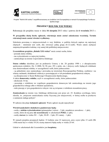 Projekt "Rolnik XXI wieku" współfinansowany ze środków Unii Europejskiej w ramach Europejskiego Funduszu Społecznego PROJEKT ROLNIK XXI WIEKU Rekrutacja do projektu rusza w dniu 16 sierpnia 2013 roku i potrwa do 6 września 2013 r. W przypadku dużej liczby zgłoszeń, rekrutacja może zostać zakończona wcześniej. Termin rekrutacji może zostać również wydłużony. Szkolenia powstaną w miejscowościach w woj. łódzkim, w pobliżu których zapisze się najwięcej chętnych - minimum tyle osób, aby otworzyć jedną grupę (8-12 osób). Warto zatem zachęcać znajomych/sąsiadów/rodzinę z tej samej lub pobliskiej miejscowości. Uczestnikiem projektu „Rolnik XXI wieku” może zostać osoba, która: - posiada status rolnika, - ma wykształcenie co najwyżej średnie, - zamieszkuje na terenie województwa łódzkiego. Status rolnika określony jest na podstawie Ustawy z dn. 20 grudnia 1990 r. o ubezpieczeniu społecznym rolników, Dz. U.2008, Nr 50, poz. 291 z późn. zm. i dotyczy osób, będących rolnikami oraz domownikami rolnika, w szczególności osób, które jednocześnie: - są pełnoletnie oraz zamieszkują i prowadzą na terytorium Rzeczpospolitej Polskiej, osobiście i na własny rachunek, działalność rolniczą w pozostającym w ich posiadaniu gospodarstwie rolnym, - są ubezpieczone w Kasie Rolniczego Ubezpieczenia Społecznego, A także domownicy rolnika, czyli w szczególności osoby, które jednocześnie: - ukończyły 16 lat, - pozostają z rolnikiem we wspólnym gospodarstwie domowym lub zamieszkują na terenie jego gospodarstwa rolnego albo w bliskim sąsiedztwie, - stale pracują w tym gospodarstwie rolnym i nie są związane z rolnikiem stosunkiem pracy. Zamieszkanie na terenie woj. łódzkiego definiowane jest przez art. 25. Kodeksu cywilnego, który określa, że „miejscem zamieszkania osoby fizycznej jest miejscowość, w której osoba ta przebywa z zamiarem stałego pobytu”. W naborze decyduje kolejność zgłoszeń. Warto zgłosić się jak najszybciej! Wśród kandydatów dodatkowo punktowane będą: - osoby z niskim wykształceniem (gimnazjalne i niższe – 2 pkt, zasadnicze zawodowe – 1 pkt), - osoby, które do tej pory nie uczestniczyły w szkoleniach POKL (1 pkt), - osoby starsze (w wieku 50+ - 3 pkt, 30-49 – 2 pkt, 29 i mniej – 1 pkt). W ramach projektu przyjętych będzie: 33 kobiety oraz 22 mężczyzn, przy czym tylko 15 osób (9K i 6M) może być w wieku 18-24; resztę stanowić będą osoby w wieku 25-64. Udział w szkoleniach dla Uczestników jest bezpłatny.