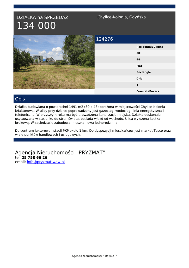 DZIAŁKA na SPRZEDAŻ Chylice-Kolonia, Gdyńska 134 000 124276 ResidentalBuilding 30 48 Flat Rectangle Grid 1 ConcretePavers Opis Działka budowlana o powierzchni 1491 m2 (30 x 48) położona w miejscowości Chylice-Kolonia k/Jaktorowa. W ulicy przy działce poprowadzony jest gazociąg, wodociąg, linia energetyczna i telefoniczna. W przyszłym roku ma być prowadzona kanalizacja miejska. Działka doskonale usytuowana w stosunku do stron świata, posiada wjazd od wschodu. Ulica wyłożona kostką brukową. W sąsiedztwie zabudowa mieszkaniowa jednorodzinna. Do centrum Jaktorowa i stacji PKP około 1 km. Do dyspozycji mieszkańców jest market Tesco oraz wiele punktów handlowych i usługowych. Agencja Nieruchomości "PRYZMAT" tel. 25 758 66 26 email: [email protected] Agencja Nieruchomości "PRYZMAT" Powered by TCPDF (www.tcpdf.org)