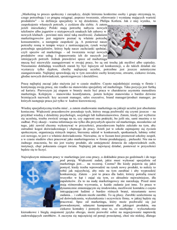 „Marketing to proces społeczny i zarządczy, dzięki któremu konkretne osoby i grupy otrzymują to, czego potrzebują i co pragną osiągnąć, poprzez tworzenie, oferowanie i wymianę mających wartość produktów" - to definicja specjalisty w tej dziedzinie, Philipa Kotlera. Jak z niej wynika, to zaspokojenie własnych potrzeb, z zyskiem dla siebie. A zatem jeżeli mieszkańcy Polski mają potrzebę nabycia nowych telefonów albo jogurtów o nietypowych smakach lub zabawy w nowych klubach - powinni móc mieć taką możliwość. Zadaniem marketingowców jest najpierw poznać tę właśnie potrzebę konsumentów, a następnie zaspokoić ją. A ponieważ nasze potrzeby rosną w tempie wręcz z zastraszającym, rynek wciąż potrzebuje specjalistów, którzy będę nasze zachcianki spełniać, czyli speców od marketingu - od tworzenia wciąż nowych produktów oraz usług i dopasowania ich do naszych już istniejących potrzeb. Jednak prawdziwi spece od marketingu muszą być niezwykle zaangażowani w swojej pracy, bo są oni trochę jak myśliwi albo szpiedzy. Nieustannie dokładają wszelkich starań by być lepszym od konkurencji, a do takich działań nie wystarczy tylko dyplom, choćby najlepszej uczelni, potrzebne jest jeszcze autentyczne zaangażowanie. Najlepiej sprawdzają się w tym zawodzie osoby kreatywne, otwarte, ciekawe świata, głodne nowych doświadczeń, spostrzegawcze i dociekliwe. Pracę najlepiej zacząć jako stażysta już w czasie studiów. Często najzdolniejsi zostają w firmie i kontynuują swoją pracę, nie rzadko na stanowisku specjalisty od marketingu. Taka pozycja jest furtką od kariery. Pierwszym jej etapem w branży może być praca w charakterze asystenta menedżera marketingu. Kolejnym - stanowisko koordynatora, potem kolejne stanowiska o bardzo dziwnie brzmiących nazwach: key account manager, sales executive, brand manager/product manager, po których następuje praca już tylko w kadrze kierowniczej. Wiedzę specjalistyczną trzeba mieć , a zatem studiowanie marketingu na jakiejś uczelni jest absolutnie konieczne. Większość pracodawców poszukuje tych, którzy mogą pochwalić się czymś jeszcze – na przykład wiedzą z dziedziny psychologii, socjologii lub kulturoznawstwa. Zatem, kiedy już wybierze się uczelnię, trzeba zwrócić uwagę na to, czy zapewni ona praktyki, bo jeśli nie, sami musimy o to zadbać. Przy okazji - ważna informacja nie tylko dla przyszłych speców od marketingu, niezależnie od tego, jaki zawód chcemy wykonywać w przyszłości, pracodawcom będzie zależało na tym, aby zatrudnić kogoś doświadczonego i chętnego do pracy. Jeżeli już w szkole zajmujemy się życiem społecznym, organizacją różnych imprez, bierzemy udział w konkursach, spotkaniach, lubimy robić coś nowego, to jest t o właśnie doświadczenie. Nieważne, że w liceum ktoś promował szkolny zespół, a w czasie studiów chce pracować jako marketingowiec w firmie produkującej... pieluszki. Nie ma to żadnego znaczenia, bo nie jest ważny produkt, ale umiejętność dotarcia do odpowiednich osób, instytucji, chęć pokazania czegoś światu. Najlepiej jak najwięcej działać, ponieważ w przyszłości będzie się to liczyć. Największym minusem pracy w marketingu jest czas pracy, a dokładnie praca po godzinach i do tego pod presją. Większość zadań, jakie musi wykonać specjalista od marketingu jest… na wczoraj. Czemu? Bo kiedy pojawia się jakiś pomysł, kiedy trzeba wprowadzić na rynek nowy produkt, to należy to robić jak najszybciej, aby móc na tym zarabiać i aby wyprzedzić konkurencję. Zatem - jest to praca dla ludzi, którzy potrafią rzucić wszystko w kąt i zająć się tym, co aktualnie najważniejsze, dla zapaleńców. Za to na nudę marketingowcy nie narzekają. Przed nimi stoją różnorodne wyzwania, a każde zadanie jest inne. To praca w dynamicznie zmieniającym się środowisku, możliwość kontaktu z często intrygującymi ludźmi z bardzo różnych branż, nieustannie nowe zadania… i całkiem niezłe zarobki. To są plusy. Zarobki uzależnione są od doświadczenia, wykształcenia i oczywiście firmy, w jakiej będzie się pracować. Spec od marketingu, który może pochwalić się już prowadzonymi, udanymi kampaniami dla jakiegoś produktu, ma ciekawe kontakty i pomysły oraz to, co niezbędne - wykształcenie kierunkowe i biegłą znajomość języka obcego, może pozwolić sobie na negocjowanie naprawdę zadowalających zarobków. A zaczyna się najczęściej od pensji przeciętnej, choć nie niskiej, dlatego naprawdę warto zacząć pracę zawodową, choćby w formie praktyk, już na studiach – choćby po to, aby mieć za sobą ten okres raczej przeciętnego zarabiania. Oprócz pensji pracownicy mogą liczyć na dodatkowe benefity, w tym oczywiście premie. Można się również spodziewać służbowych telefonów komórkowych czy laptopów, ponieważ są to niezbędne narzędzia pracy. Dodatkowo można liczyć na bezpłatną opiekę medyczną, a nawet - samochód służbowy. Od specjalistów marketingów wymaga się: - łatwości nawiązywania kontaktów interpersonalnych , - umiejętności pracy w zespole i dobrej organizacji pracy, - wytrwałości w dążeniu do wyznaczonego celu. - wyższego wykształcenia, ale nie tylko z dziedziny marketingu, - umiejętności obsługi programów komputerowych, - dobrej znajomości jednego języka obcego, - prawa jazdy.