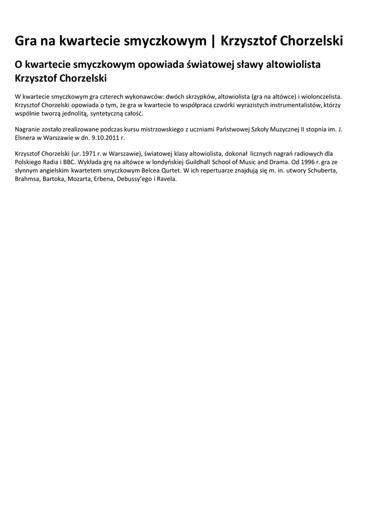 Gra na kwartecie smyczkowym | Krzysztof Chorzelski O kwartecie smyczkowym opowiada światowej sławy altowiolista Krzysztof Chorzelski W kwartecie smyczkowym gra czterech wykonawców: dwóch skrzypków, altowiolista (gra na altówce) i wiolonczelista. Krzysztof Chorzelski opowiada o tym, że gra w kwartecie to współpraca czwórki wyrazistych instrumentalistów, którzy wspólnie tworzą jednolitą, syntetyczną całość. Nagranie zostało zrealizowane podczas kursu mistrzowskiego z uczniami Państwowej Szkoły Muzycznej II stopnia im. J. Elsnera w Warszawie w dn. 9.10.2011 r. Krzysztof Chorzelski (ur. 1971 r. w Warszawie), światowej klasy altowiolista, dokonał licznych nagrań radiowych dla Polskiego Radia i BBC. Wykłada grę na altówce w londyńskiej Guildhall School of Music and Drama. Od 1996 r. gra ze słynnym angielskim kwartetem smyczkowym Belcea Qurtet. W ich repertuarze znajdują się m. in. utwory Schuberta, Brahmsa, Bartoka, Mozarta, Erbena, Debussy’ego i Ravela.