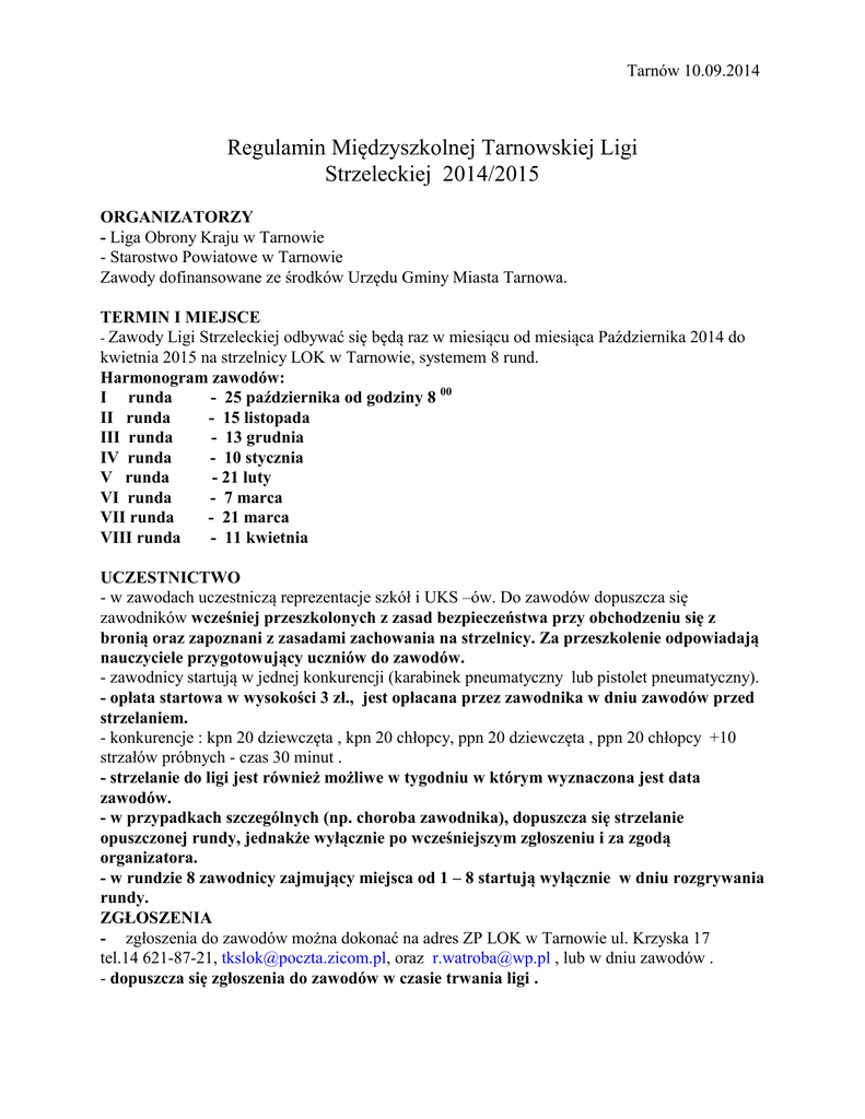 Tarnów 10.09.2014 Regulamin Międzyszkolnej Tarnowskiej Ligi Strzeleckiej 2014/2015 ORGANIZATORZY - Liga Obrony Kraju w Tarnowie - Starostwo Powiatowe w Tarnowie Zawody dofinansowane ze środków Urzędu Gminy Miasta Tarnowa. TERMIN I MIEJSCE - Zawody Ligi Strzeleckiej odbywać się będą raz w miesiącu od miesiąca Października 2014 do kwietnia 2015 na strzelnicy LOK w Tarnowie, systemem 8 rund. Harmonogram zawodów: I runda - 25 października od godziny 8 00 II runda - 15 listopada III runda - 13 grudnia IV runda - 10 stycznia V runda - 21 luty VI runda - 7 marca VII runda - 21 marca VIII runda - 11 kwietnia UCZESTNICTWO - w zawodach uczestniczą reprezentacje szkół i UKS –ów. Do zawodów dopuszcza się zawodników wcześniej przeszkolonych z zasad bezpieczeństwa przy obchodzeniu się z bronią oraz zapoznani z zasadami zachowania na strzelnicy. Za przeszkolenie odpowiadają nauczyciele przygotowujący uczniów do zawodów. - zawodnicy startują w jednej konkurencji (karabinek pneumatyczny lub pistolet pneumatyczny). - opłata startowa w wysokości 3 zł., jest opłacana przez zawodnika w dniu zawodów przed strzelaniem. - konkurencje : kpn 20 dziewczęta , kpn 20 chłopcy, ppn 20 dziewczęta , ppn 20 chłopcy +10 strzałów próbnych - czas 30 minut . - strzelanie do ligi jest również możliwe w tygodniu w którym wyznaczona jest data zawodów. - w przypadkach szczególnych (np. choroba zawodnika), dopuszcza się strzelanie opuszczonej rundy, jednakże wyłącznie po wcześniejszym zgłoszeniu i za zgodą organizatora. - w rundzie 8 zawodnicy zajmujący miejsca od 1 – 8 startują wyłącznie w dniu rozgrywania rundy. ZGŁOSZENIA - zgłoszenia do zawodów można dokonać na adres ZP LOK w Tarnowie ul. Krzyska 17 tel.14 621-87-21, [email protected], oraz [email protected] , lub w dniu zawodów . - dopuszcza się zgłoszenia do zawodów w czasie trwania ligi . BROŃ I AMUNICJA - karabin pneumatyczny z otwartymi przyrządami celowniczymi . - pistolet pneumatyczny LOV lub inny, nie wyczynowy. - można strzelać z własnej broni. - dla osób nie posiadających broni organizator zabezpiecza broń. - na zawodach amunicję zabezpiecza organizator. KLASYFIKACJA - indywidualna zgodnie z konkurencjami wymienionymi wcześniej- 8 wyników z rozegranych rund - zespołowa dziewcząt – szkoły ponadgimnazjalne :3 najlepsze wyniki kpn 20 i 1 ppn 20 - zespołowa chłopców – szkoły ponadgimnazjalne 3 najlepsze wyniki kpn 20 i 1 ppn 20 - zespołowa - gimnazja 3 najlepsze wyniki kpn 20 i 1 Ppn 20 – bez podziału na kategorie chłopców i dziewcząt . - Wyniki ze szkolnej ligi strzeleckiej zostaną zaliczone do współzawodnictwa sportowego szkół prowadzonego przez SZS na terenie Miasta Tarnowa i Powiatu Tarnowskiego. NAGRODY I WYRÓŻNIENIA - zespołowa dziewczęta , chłopcy ze szkół ponadgimnazjalnych oraz gimnazja bez podziału na płeć. Miejsca zespołowo: I - III puchary i dyplomy oraz IV - VI dyplomy Miejsca indywidualnie: I - III medale nagrody i dyplomy oraz IV - VI dyplomy SPRAWY ORGANIZACYJNE - organizator nie pokrywa kosztów dojazdu i posiłków. - podsumowanie wyników nastąpi w miesiącu maju 2015 r. Termin uroczystego zakończenia ligi zostanie podany po ostatniej rundzie, po konsultacjach z opiekunami zespołów. - interpretacja niniejszego regulaminu należy do organizatorów. - wyniki i bieżące informacje zamieszczane będą na stronie - tkslok.pl - dodatkowych informacji na temat ligi oraz możliwości przeszkolenia przed startem w lidze udziela Sekretarz Zarządu Powiatowego LOK Jerzy Madej tel – 604 45 88 19 lub 508 06 58 62 - Treningi z broni pneumatycznej do ligi można odbywać na strzelnicy – koszt treningu 6 złotych ( 30 śrutów , 2 tarcze ,broń , stanowisko ). - Przewodniczącym Komisji Klasyfikacyjnej jest pan Ryszard Wątroba , który przyjmuje uwagi do komunikatu na adres [email protected] lub tel. 698 055 714. Dla uniknięcia nieporozumień spowodowanych nieczytelnie wpisanymi nazwiskami i imionami przez zawodników na metryczkach strzelań, proszę opiekunów o przesłanie list startujących na podany wyżej adres Przewodniczącego Komisji Klasyfikacyjnej. Wyniki z nieczytelnie lub niekompletnie wypełnionych metryczek nie będą liczone i zamieszczane w komunikatach. Za prawidłowo wypełnioną metryczkę odpowiada zawodnik. Regulamin został przyjęty na Posiedzeniu Zarządu Powiatowego LOK Tarnów w dniu 10.09.2013.