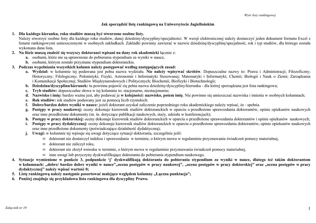 Wzór listy rankingowej Jak sporządzić listę rankingową na Uniwersytecie Jagiellońskim 1. Dla kaŜdego kierunku, roku studiów muszą być stworzone osobne listy. NaleŜy stworzyć osobne listy dla kaŜdego roku studiów, danej dziedziny/dyscypliny/specjalności. W wersji elektronicznej naleŜy dostarczyć jeden dokument formatu Excel z listami rankingowymi umieszczonymi w osobnych zakładkach. Zakładki powinny zawierać w nazwie dziedzinę/dyscyplinę/specjalność, rok i typ studiów, dla którego została wykonana dana lista. 2. Na liście muszą znaleźć się wszyscy doktoranci wpisani na dany rok akademicki łącznie z: a. osobami, które nie są uprawnione do pobierania stypendium za wyniki w nauce, b. osobami, którym zostało przyznane stypendium doktoranckie. 3. Podczas wypełniania wszystkich kolumn naleŜy postępować według następujących zasad: a. Wydział: w kolumnie tej podawana jest pełna nazwa wydziału. Nie naleŜy wpisywać skrótów. Dopuszczalne nazwy to: Prawa i Administracji; Filozoficzny; Historyczny; Filologiczny; Polonistyki; Fizyki, Astronomii i Informatyki Stosowanej; Matematyki i Informatyki; Chemii; Biologii i Nauk o Ziemi; Zarządzania i Komunikacji Społecznej; Studiów Międzynarodowych i Politycznych; Biochemii, Biofizyki i Biotechnologii; b. Dziedzina/dyscyplina/kierunek: tu powinna pojawić się pełna nazwa dziedziny/dyscypliny/kierunku - dla której sporządzana jest lista rankingowa; c. Tryb studiów: dopuszczalne słowa w tej kolumnie to: stacjonarne, niestacjonarne; d. Nazwisko i imię: bardzo waŜne jest, aby podawać je w kolejności: nazwisko, potem imię. Nie powinno się umieszczać nazwiska i imienia w osobnych kolumnach; e. Rok studiów: rok studiów podawany jest za pomocą liczb rzymskich. f. Dobre/bardzo dobre wyniki w nauce: jeŜeli doktorant uzyskał zaliczenie poprzedniego roku akademickiego naleŜy wpisać, Ŝe - spełnia. g. Postępy w pracy naukowej: oceny dokonuje kierownik studiów doktoranckich w oparciu o przedłoŜone sprawozdania doktorantów, opinie opiekunów naukowych oraz inne przedłoŜone dokumenty (m. in. dotyczące publikacji naukowych, staŜy, udziału w konferencjach); h. Postępy w pracy doktorskiej: oceny dokonuje kierownik studiów doktoranckich w oparciu o przedłoŜone sprawozdania doktorantów i opinie opiekunów naukowych; i. Postępy w pracy dydaktycznej: oceny dokonuje kierownik studiów doktoranckich w oparciu o przedłoŜone sprawozdania doktorantów, opinie opiekunów naukowych oraz inne przedłoŜone dokumenty (poświadczające działalność dydaktyczną); j. Uwagi: w kolumnie tej wpisuje się uwagi dotyczące sytuacji doktoranta, szczególnie jeśli: • doktorant nie dostarczył indeksu i sprawozdania w terminie, o którym mowa w regulaminie przyznawania świadczeń pomocy materialnej, • doktorant nie zaliczył roku, • doktorant nie złoŜył wniosku w terminie, o którym mowa w regulaminie przyznawania świadczeń pomocy materialnej, • inne uwagi lub przyczyny dyskwalifikujące doktoranta do pobierania stypendium naukowego. 4. Sytuacje wymienione w punkcie 3, podpunkcie ‘j’ dyskwalifikują doktoranta do pobierania stypendium za wyniki w nauce, dlatego teŜ takim doktorantom w kolumnach: „dobre/ bardzo dobre wyniki w nauce”„ocena postępów w pracy naukowej”, „ocena postępów w pracy doktorskiej” oraz „ocena postępów w pracy dydaktycznej” naleŜy wpisać wartość 0; 5. Listę rankingową naleŜy następnie posortować malejąco względem kolumny „Łączna punktacja”; 6. PoniŜej znajduje się przykładowa lista rankingowa dla dyscypliny Prawo. Załącznik nr 10 1 Wzór listy rankingowej Wydział Dziedzina/ Dyscyplina Prawa i Administracji Prawa i Administracji Prawa i Administracji Prawa i Administracji Prawa i Administracji Prawa i Administracji Prawa i Administracji Prawa i Administracji Prawa i Administracji Prawa i Administracji Prawa i Administracji Prawa i Administracji Prawa i Administracji Prawa i Administracji Prawa i Administracji Prawa i Administracji Nauki prawne/ Prawo Nauki prawne/ Prawo Nauki prawne/ Prawo Nauki prawne/ Prawo Nauki prawne/ Prawo Nauki prawne/ Prawo Nauki prawne/ Prawo Nauki prawne/ Prawo Nauki prawne/ Prawo Nauki prawne/ Prawo Nauki prawne/ Prawo Nauki prawne/ Prawo Nauki prawne/ Prawo Nauki prawne/ Prawo Nauki prawne/ Prawo Nauki prawne/ Prawo Załącznik nr 10 Dobre/ Ocena Ocena Ocena bardzo postępów postępów postępów Tryb Nazwisko Rok dobre w pracy w pracy w pracy studiów i Imię studiów wyniki w doktor- dydaktynaukowej nauce skiej cznej stacjonarne stacjonarne stacjonarne stacjonarne stacjonarne stacjonarne stacjonarne stacjonarne stacjonarne stacjonarne stacjonarne stacjonarne stacjonarne stacjonarne XX1 III spełnia XX2 III spełnia XX3 III spełnia XX4 III spełnia XX24 III spełnia XX25 III spełnia XX26 III 0 XX27 III 0 XX28 III 0 XX29 III 0 XX30 III 0 XX31 III 0 XX32 III 0 XX33 III 0 XX34 III 0 XX35 III 0 Kryteria dodatkowe (wg punktacji ustalonej przez Radę Wydziału) Łączna punktacja Uwagi Indeks po terminie Indeks po terminie Nie zaliczony rok Brak sprawozdania Nie zaliczony rok Brak sprawozdania Nie zaliczył roku Indeks po terminie Indeks po terminie Indeks po terminie 2
