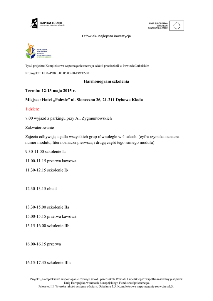 Człowiek- najlepsza inwestycja Tytuł projektu: Kompleksowe wspomaganie rozwoju szkół i przedszkoli w Powiecie Lubelskim Nr projektu: UDA-POKL.03.05.00-00-199/12-00 Harmonogram szkolenia Termin: 12-13 maja 2015 r. Miejsce: Hotel „Polesie” ul. Słoneczna 36, 21-211 Dębowa Kłoda 1 dzień: 7.00 wyjazd z parkingu przy Al. Zygmuntowskich Zakwaterowanie Zajęcia odbywają się dla wszystkich grup równolegle w 4 salach. (cyfra rzymska oznacza numer modułu, litera oznacza pierwszą i drugą część tego samego modułu) 9.30-11.00 szkolenie Ia 11.00-11.15 przerwa kawowa 11.30-12.15 szkolenie Ib 12.30-13.15 obiad 13.30-15.00 szkolenie IIa 15.00-15.15 przerwa kawowa 15.15-16.00 szkolenie IIb 16.00-16.15 przerwa 16.15-17.45 szkolenie IIIa Projekt „Kompleksowe wspomaganie rozwoju szkół i przedszkoli Powiatu Lubelskiego” współfinansowany jest przez Unię Europejską w ramach Europejskiego Funduszu Społecznego. Priorytet III. Wysoka jakość systemu oświaty. Działanie 3.5. Kompleksowe wspomaganie rozwoju szkół. Człowiek- najlepsza inwestycja 18.00-19.30 przejazd bryczkami 20.00 uroczysta kolacja II dzień 8.00-9.00 śniadanie 9.15-10.00 szkolenie IIIb 10.00-10.15 przerwa kawowa 10.15-11.45 szkolenie IVa 11.45-12.00 przerwa kawowa 12.00-12.45 szkolenie IVb 13.00 obiad 15.00 wyjazd do Lublina I dzień 9.30-11.00 (a) 11.30-12.15 (b) 13.30-15.00 (a) 15.15-16.00 (b) 16.15-17.45 (a) II dzień 9.15-10.00 (b) 10.15-11.45 (a) 12.00-12.45 (b) Moduł I Moduł II Moduł III Moduł IV Grupa 1 Grupa 2 Grupa 3 Grupa 4 Grupa 1 Grupa 2 Grupa 3 Grupa 4 Grupa 2 Grupa 1 Grupa 4 Grupa 3 Grupa 2 Grupa 1 Grupa 4 Grupa 3 Grupa 3 Grupa 4 Grupa 1 Grupa 2 Grupa 3 Grupa 4 Grupa 1 Grupa 2 Grupa 4 Grupa 3 Grupa 2 Grupa 1 Grupa 4 Grupa 3 Grupa 2 Grupa 1 Projekt „Kompleksowe wspomaganie rozwoju szkół i przedszkoli Powiatu Lubelskiego” współfinansowany jest przez Unię Europejską w ramach Europejskiego Funduszu Społecznego. Priorytet III. Wysoka jakość systemu oświaty. Działanie 3.5. Kompleksowe wspomaganie rozwoju szkół.