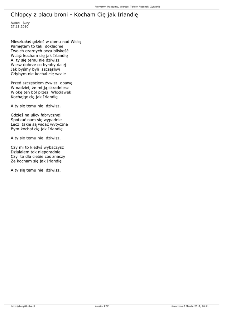 Aforyzmy, Maksymy, Wiersze, Teksty Piosenek, Życzenia Chłopcy z placu broni - Kocham Cię jak Irlandię Autor: Bury 27.11.2010. Mieszkałaś gdzieś w domu nad Wisłą Pamiętam to tak dokładnie Twoich czarnych oczu bliskość Wciąż kocham cię jak Irlandię A ty się temu nie dziwisz Wiesz dobrze co byłoby dalej Jak byśmy byli szczęśliwi Gdybym nie kochał cię wcale Przed szczęściem żywisz obawę W nadziei, że mi ją skradniesz Wlokę ten ból przez Włocławek Kochając cię jak Irlandię A ty się temu nie dziwisz. Gdzieś na ulicy fabrycznej Spotkać nam się wypadnie Lecz takie są widać wytyczne Bym kochał cię jak Irlandię A ty się temu nie dziwisz. Czy mi to kiedyś wybaczysz Działałem tak nieporadnie Czy to dla ciebie coś znaczy Że kocham się jak Irlandię A ty się temu nie dziwisz. http://bury81.cba.pl Kreator PDF Utworzono 8 March, 2017, 10:41