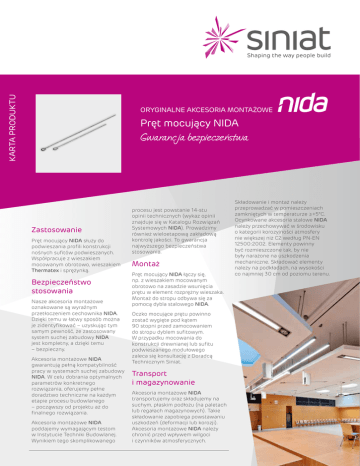 KARTA PRODUKTU ORYGINALNE AKCESORIA MONTAŻOWE Pręt mocujący NIDA Gwarancja bezpieczenstwa Zastosowanie Pręt mocujący NIDA służy do podwieszania profili konstrukcji nośnych sufitów podwieszanych. Współpracuje z wieszakiem mocowanym obrotowo, wieszakiem Thermatex i sprężynką. Bezpieczeństwo stosowania Nasze akcesoria montażowe oznakowane są wyraźnym przetłoczeniem cechownika NIDA. Dzięki temu w łatwy sposób można je zidentyfikować – uzyskując tym samym pewność, że zastosowany system suchej zabudowy NIDA jest kompletny, a dzięki temu – bezpieczny. Akcesoria montażowe NIDA gwarantują pełną kompatybilność pracy w systemach suchej zabudowy NIDA. W celu dobrania optymalnych parametrów konkretnego rozwiązania, oferujemy pełne doradztwo techniczne na każdym etapie procesu budowlanego – począwszy od projektu aż do finalnego rozwiązania. Akcesoria montażowe NIDA poddajemy wymagającym testom w Instytucie Techniki Budowlanej. Wynikiem tego skomplikowanego procesu jest powstanie 14-stu opinii technicznych (wykaz opinii znajduje się w Katalogu Rozwiązań Systemowych NIDA). Prowadzimy również wieloetapową zakładową kontrolę jakości. To gwarancja najwyższego bezpieczeństwa stosowania. Montaż Pręt mocujący NIDA łączy się, np. z wieszakiem mocowanym obrotowo na zasadzie wsunięcia prętu w element rozprężny wieszaka. Montaż do stropu odbywa się za pomocą dybla stalowego NIDA. Oczko mocujące prętu powinno zostać wygięte pod kątem 90 stopni przed zamocowaniem do stropu dyblem sufitowym. W przypadku mocowania do konstrukcji drewnianej lub sufitu podwieszanego modułowego zaleca się konsultację z Doradcą Technicznym Siniat. Transport i magazynowanie Akcesoria montażowe NIDA transportujemy oraz składujemy na suchym, płaskim podłożu (na paletach lub regałach magazynowych). Takie składowanie zapobiega powstawaniu uszkodzeń (deformacji lub korozji). Akcesoria montażowe NIDA należy chronić przed wpływem wilgoci i czynników atmosferycznych. Składowanie i montaż należy przeprowadzać w pomieszczeniach zamkniętych w temperaturze ≥+5°C. Ocynkowane akcesoria stalowe NIDA należy przechowywać w środowisku o kategorii korozyjności atmosfery nie większej niż C2 według PN-EN 12500:2002. Elementy powinny być rozmieszczone tak, by nie były narażone na uszkodzenia mechaniczne. Składować elementy należy na podkładach, na wysokości co najmniej 30 cm od poziomu terenu. Oryginalne akcesoria montażowe NIDA – pręt mocujący NIDA Dane techniczne ф6 ф6 A1 8,5 r5 R7 13,5 Klasa reakcji na ogień 0° ~4 DX51D+Z 0° ~4 Rodzaj blachy 8,5 ф6 ф6 PN-EN 14195:2015 ~2 5° ~2 5° 13,5 Norma R7 r5 4 mm Ocynk w g/m wg PN-EN 10346 Z100 = 7μm (± 2μm) 2 Kategoria korozyjności wg PN EN 12944 C1, C2 Średnie obciążenie niszczące Fu [kN] 0,780-1,082 Obciążenie dopuszczalne (obliczeniowe) F 5% u [kN] 0,25-0,36 Atesty i certyfikaty Dokumentacja związana PN-EN 14195:2015 Deklaracja właściwości użytkowych (DoP) Karta techniczna Markowanie produktu CE Blacha DX51D w I gatunku ф4 ф4 Siniat Sp. z o.o. gwarantuje bezpieczeństwo użytkowania systemowych prętów mocujących NIDA pod warunkiem zastosowania zgodnie z odpowiednimi dokumentami ITB, w szczególności w zakresie rozstawów elementów konstrukcyjnych. Producent nie ponosi odpowiedzialności za skutki powstałe w wyniku użycia wyrobu niezgodnie z powyższymi zaleceniami oraz zasadami sztuki budowlanej. SINIAT Sp. z o.o. ul. Przecławska 8 03-879 Warszawa www.siniat.pl Data wydania: listopad 2016 250 lub 500 lub 1000 lub 1500 Grubość nominalna blachy w mm ф4 ф4 250 lub 500 lub 1000 lub 1500 patrz rysunek techniczny obok Długość Szerokość 250 lub 500 lub 1000 lub 1500 250 lub 500 lub 1000 lub 1500 Wymiary: