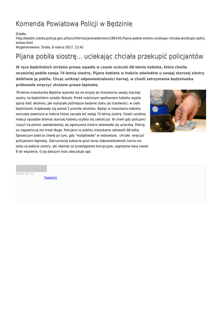 Komenda Powiatowa Policji w Będzinie Źródło: http://bedzin.slaska.policja.gov.pl/ka1/informacje/wiadomosci/189145,Pijana-pobila-siostre-uciekajac-chciala-przekupic-policj antow.html Wygenerowano: Środa, 8 marca 2017, 12:41 Pijana pobiła siostrę... uciekając chciała przekupić policjantów W ręce będzińskich stróżów prawa wpadła w czasie ucieczki 68-letnia kobieta, która chwilę wcześniej pobiła swoją 74-letnią siostrę. Pijana kobieta w trakcie odwiedzin u swojej starszej siostry dotkliwie ją pobiła. Chcąc uniknąć odpowiedzialności karnej, w chwili zatrzymania będzinianka próbowała wręczyć stróżom prawa łapówkę. 76-letnia mieszkanka Będzina wybrała się na wizytę do mieszkania swojej starszej siostry na będzińskim osiedlu Warpie. Przed rodzinnym spotkaniem kobieta wypiła sporą ilość alkoholu. Jak wykazało późniejsze badanie stanu jej trzeźwości, w ciele będzinianki znajdowały się ponad 2 promile alkoholu. Będąc w mieszkaniu kobieta wszczęła awanturę w trakcie której zaczęła bić swoją 74-letnią siostrę. Dzięki szybkiej reakcji sąsiadów dramat starszej kobiety szybko się zakończył. W chwili gdy policjanci ruszyli na pomoc zaatakowanej, jej agresywna siostra salwowała się ucieczką. Pościg za napastniczą nie trwał długo. Policjanci w pobliżu mieszkania odnaleźli 68-latkę. Sprawczyni pobicia chwilę po tym, gdy "wylądowała" w radiowozie, chciała wręczyć policjantom łapówkę. Zatrzymanej kobiecie grozi teraz odpowiedzialność karna nie tylko za pobicie siostry, ale również za przestępstwo korupcyjne, zagrożone karą nawet 8 lat więzienia. O jej dalszym losie zdecyduje sąd. Ocena: 0/5 (0) Tweetnij