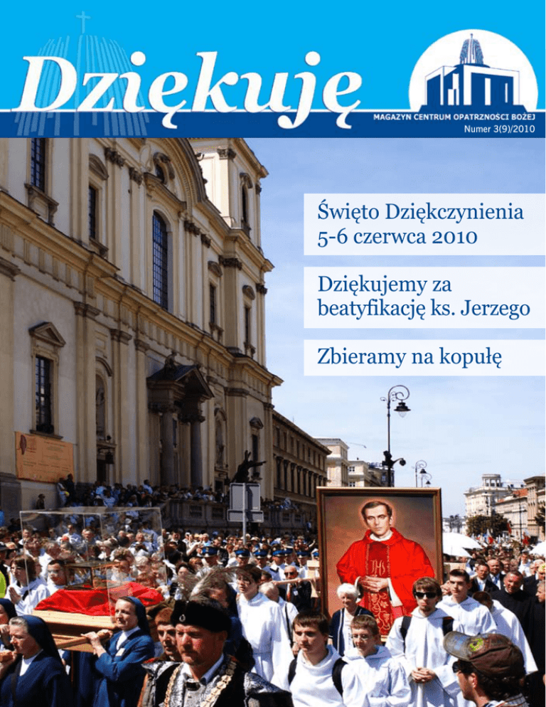 Numer 3(9)/2010 Święto Dziękczynienia 5-6 czerwca 2010 Dziękujemy za beatyfikację ks. Jerzego Zbieramy na kopułę 9 Dziękowali za ks. Jerzego Popiełuszkę Burzą braw i owacją na stojąco wierni zgromadzeni przed Świątynią Opatrzności Bożej przywitali procesję z relikwiami ks. Jerzego Popiełuszki. Doczesne szczątki błogosławionego kapłana spoczęły w Panteonie Wielkich Polaków S zóstego czerwca już od wczesnych godzin przedpołudniowych plac przed Świątynią Opatrzności Bożej zapełnił się wiernymi, którzy przybyli, aby wziąć udział w obchodach Święta Dziękczynienia. Tegoroczne uroczystości zostały połączone z wyniesieniem na ołtarze ks. Jerzego Popiełuszki. Wierni zgromadzeni przed Świątynią obejrzeli najpierw na telebimach Mszę beatyfikacyjną. A kiedy po Eucharystii z placu Piłsudskiego wyruszyła ponad 100 tys. procesja z relikwiami, w Wilanowie zaczął się Festiwal Muzyki Chrześcijańskiej. W koncercie wystąpili m.in.: Magda Anioł, Viola Brzezińska czy Maleo Reggae Rockers. Dla najmłodszych uczestników organizatorzy przygotowali miasteczko zabaw. Przez cały dzień można też było zwiedzać Panteon Wielkich Polaków, który część wiernych już dzisiaj nazywa „Wawelem III Tysiąclecia”. 2 Procesję z relikwiami na Pola Wilanowskie wprowadził abp Kazimierz Nycz. – Błogosławiony ks. Jerzy-męczennik chwycił nas za serca – powiedział metropolita warszawski i poprosił wiernych, aby przywiązali się do nowego błogosławionego i Świątyni Opatrzności Bożej, będącej wotum narodu. – Proszę Was, aby ta Świątynia była Świątynią wszystkich Polaków – zaapelował abp Nycz. Po nabożeństwie relikwie błogosławionego ks. Jerzego zostały przeniesione do Panteonu Wielkich Polaków. Spoczęły tuż obok symbolicznego grobu Jana Pawła II. Informacja: Relikwie bł. Ks. Jerzego Popiełuszki są wystawiane w każdą pierwszą niedzielą miesiąca podczas nabożeństwa adoracyjnego o godz. 16:00 w kaplicy przy Świątyni Opatrzności Bożej. Zwiedzanie Panteonu Wielkich Polaków będzie utrudnione do końca września br. z powodu prac przygotowujących wnętrze do użytkowania. Wielki koncert ku czci ks. Popiełuszki Niezwykły koncert, rekonstrukcje historyczne, miasteczko radiowotelewizyjne i zwiedzanie Panteonu Wielkich Polaków – podczas dwudniowych obchodów Święta Dziękczynienia każdy mógł znaleźć dla siebie coś ciekawego T egoroczne uroczystości Święta Dziękczynienia trwały 5 i 6 czerwca. Już pierwszego dnia plac przed Świątynią Opatrzności Bożej odwiedziło kilka tysięcy osób. Większość do Wilanowa przyjechała z Warszawy i okolic. Dzieci i młodzież chętnie odwiedzali miasteczko radiowo-telewizyjne. W namiotach powstały studia, w których uczestnicy mogli nagrać osobiste podziękowania wyświetlane potem na telebimach. Najmłodsi najczęściej dziękowali Bogu za rodziców i słońce, jakie tego dnia pojawiło się nad Mazowszem. Młodzież dziękowała za dar życia i ks. Popiełuszkę. – Żeby naśladować ks. Jerzego, trzeba go najpierw poznać – mówił abp Kazimierz Nycz, który wręczył nagrody laureatom konkursu o kapłanie-męczenniku. W miejscu, w którym już niedługo będzie główne wejście do Świątyni Opatrzności Bożej, zbudowano scenę muzyczną. Widzami transmitowanego koncertu byli m.in. członkowie Konferencji Episkopatu Polski oraz przedstawiciele parlamentu i władz samorządowych. Widzowie TVP mogli też obejrzeć rekonstrukcję manifestacji patriotycznej z lat 80. W finale koncertu kilkudziesięciu artystów zaśpiewało hymn Święta Dziękczynienia pt. „Dziękuję Ci” autorstwa Roberta Friedricha. A pierwszy dzień Święta Dziękczynienia zakończył wieczorny koncert dla młodzieży w wykonaniu zespołu Deus Meus pt. „Godzina uwielbienia i dziękczynienia.” Święci przez wieki: Bł. ks. Jerzy Popiełuszko Po beatyfikacji jeszcze większe tłumy pielgrzymów z Polski i świata nawiedzają zarówno grób ks. Jerzego, jak też modlą się przy jego relikwiach w kaplicy obok Świątyni Opatrzności Bożej. Ks. Jerzy stał się teraz nie tylko stróżem granicy między dobrem i złem, ale też patronem od spraw beznadziejnych, pośrednikiem na drodze do Boga. Kolejnym etapem na drodze kapłana męczennika do świętości będzie kanonizacja. Aby jednak mogła nastąpić, potrzebny jest cud. Przypomnijmy, że hasło życia ks. Popiełuszki brzmiało: „Zło dobrem zwyciężaj”. Był to kapłan z charyzmą, otwarty na ludzi i Boga. 3 WYNIESIENIE NA OŁTARZE KS. JERZEGO Wielki dar dla wielkiego narodu Ponad 150 tys. wiernych z całego świata przyjechało do Warszawy, aby wziąć udział w uroczystościach wyniesienia na ołtarze ks. Jerzego G aude Mater Polonia! Ciesz się Matko Polsko! Ciesz się Warszawo! – powiedział abp Kazimierz Nycz na rozpoczęcie Mszy beatyfikacyjnej na placu Piłsudskiego, 6 czerwca. Metropolita warszawski podkreślił, że beatyfikacja ks. Jerzego wpisuje się w Dzień Dziękczynienia. – W ten sposób dziękujemy Bożej Opatrzności za odzyskaną wolność, za Konstytucję 3 Maja, za Jana Pawła II i kardynała Wyszyńskiego. Dla tego narodowego dziękczynienia wznosimy w Wilanowie Świątynię Opatrzności Bożej. Dzisiaj w sposób szczególny dziękujemy za wyniesienie na ołtarze ks. Jerzego Popiełuszki – podkreślił abp Nycz i poprosił papieskiego delegata abp. Angelo Amato o przewodniczenie obrzędom beatyfikacyjnym. W Eucharystii na placu udział wzięli przedstawiciele Episkopatu Polski, rządu, parlamentu oraz wielu gości z zagranicy. Wśród wiernych była także rodzina zamordowanego kapłana. Matkę ks. Jerzego, 90-letnią 4 Mariannę Popiełuszko, zgromadzeni na Mszy powitali długą owacją na stojąco. Gdy został odsłonięty obraz beatyfikacyjny ks. Jerzego, do prezbiterium wniesiono relikwie nowego błogosławionego. W homilii abp Amato powiedział, że beatyfikacja ks. Popie