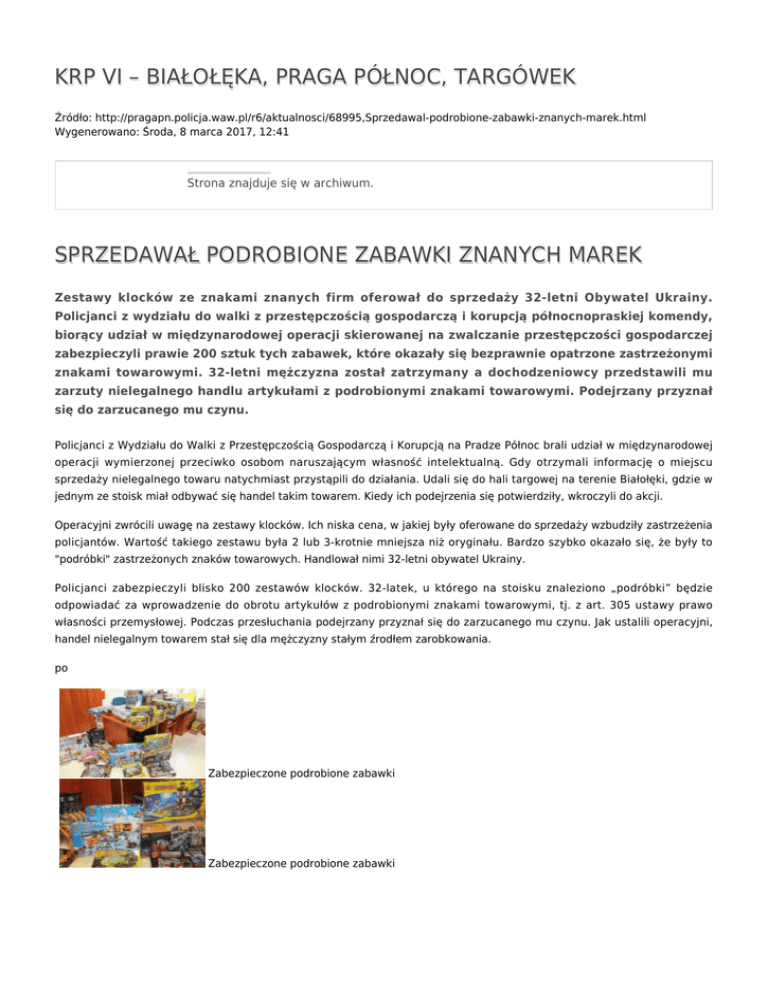 KRP VI – BIAŁOŁĘKA, PRAGA PÓŁNOC, TARGÓWEK Źródło: http://pragapn.policja.waw.pl/r6/aktualnosci/68995,Sprzedawal-podrobione-zabawki-znanych-marek.html Wygenerowano: Środa, 8 marca 2017, 12:41 Strona znajduje się w archiwum. SPRZEDAWAŁ PODROBIONE ZABAWKI ZNANYCH MAREK Zestawy klocków ze znakami znanych firm oferował do sprzedaży 32-letni Obywatel Ukrainy. Policjanci z wydziału do walki z przestępczością gospodarczą i korupcją północnopraskiej komendy, biorący udział w międzynarodowej operacji skierowanej na zwalczanie przestępczości gospodarczej zabezpieczyli prawie 200 sztuk tych zabawek, które okazały się bezprawnie opatrzone zastrzeżonymi znakami towarowymi. 32-letni mężczyzna został zatrzymany a dochodzeniowcy przedstawili mu zarzuty nielegalnego handlu artykułami z podrobionymi znakami towarowymi. Podejrzany przyznał się do zarzucanego mu czynu. Policjanci z Wydziału do Walki z Przestępczością Gospodarczą i Korupcją na Pradze Północ brali udział w międzynarodowej operacji wymierzonej przeciwko osobom naruszającym własność intelektualną. Gdy otrzymali informację o miejscu sprzedaży nielegalnego towaru natychmiast przystąpili do działania. Udali się do hali targowej na terenie Białołęki, gdzie w jednym ze stoisk miał odbywać się handel takim towarem. Kiedy ich podejrzenia się potwierdziły, wkroczyli do akcji. Operacyjni zwrócili uwagę na zestawy klocków. Ich niska cena, w jakiej były oferowane do sprzedaży wzbudziły zastrzeżenia policjantów. Wartość takiego zestawu była 2 lub 3-krotnie mniejsza niż oryginału. Bardzo szybko okazało się, że były to "podróbki" zastrzeżonych znaków towarowych. Handlował nimi 32-letni obywatel Ukrainy. Policjanci zabezpieczyli blisko 200 zestawów klocków. 32-latek, u którego na stoisku znaleziono „podróbki” będzie odpowiadać za wprowadzenie do obrotu artykułów z podrobionymi znakami towarowymi, tj. z art. 305 ustawy prawo własności przemysłowej. Podczas przesłuchania podejrzany przyznał się do zarzucanego mu czynu. Jak ustalili operacyjni, handel nielegalnym towarem stał się dla mężczyzny stałym źrodłem zarobkowania. po Zabezpieczone podrobione zabawki Zabezpieczone podrobione zabawki Zabezpieczone podrobione zabawki Zabezpieczone podrobione zabawki Zabezpieczone podrobione zabawki Ocena: 0/5 (0) Tweetnij