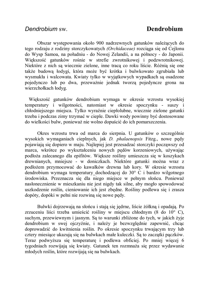Dendrobium sw. Dendrobium Obszar występowania około 900 nadrzewnych gatunków należących do tego rodzaju z rodziny storczykowatych (Orchidaceae) rozciąga się od Cejlonu do Wysp Samoa, na południu - do Nowej Zelandii, a na północy - do Japonii. Większość gatunków rośnie w strefie zwrotnikowej i podzwrotnikowej. Niektóre z nich są wiecznie zielone, inne tracą co roku liście. Różnią się one także budową łodygi, która może być krótka i bulwkowato zgrubiała lub wysmukła i walcowata. Kwiaty tylko w wyjątkowych wypadkach są osadzone pojedynczo lub po dwa, przeważnie jednak tworzą pojedyncze grona na wierzchołkach łodyg. Większość gatunków dendrobium wymaga w okresie wzrostu wysokiej temperatury i wilgotności, natomiast w okresie spoczynku - suszy i chłodniejszego miejsca. Tylko wyraźnie ciepłolubne, wiecznie zielone gatunki trzeba i podczas zimy trzymać w cieple. Dawki wody powinny być dostosowane do wielkości bulw, ponieważ nie wolno dopuścić do ich pomarszczenia. Okres wzrostu trwa od marca do sierpnia. U gatunków o szczególnie wysokich wymaganiach cieplnych, jak D. phalaenopsis Fitzg., nowe pędy pojawiają się dopiero w maju. Najlepiej jest przesadzać storczyki począwszy od marca, wkrótce po wykształceniu nowych pędów korzeniowych, używając podłoża zalecanego dla epifitów. Większe rośliny umieszcza się w koszykach drewnianych, mniejsze - w doniczkach. Niektóre gatunki można wraz z podłożem przymocować do kawałków drewna lub kory. W okresie wzrostu dendrobium wymaga temperatury_dochodzącej do 30° C i bardzo wilgotnego środowiska. Przeznacza się dla niego miejsce w pełnym słońcu. Ponieważ nasłonecznienie w mieszkaniu nie jest nigdy tak silne, aby mogło spowodować uszkodzenie roślin, cieniowanie ich jest zbędne. Rośliny podlewa się i zrasza dopóty, dopóki w pełni nie rozwiną się nowe pędy. Bulwki dojrzewają na słońcu i stają się jędrne, liście żółkną i opadają. Po zrzuceniu liści trzeba umieścić rośliny w miejscu chłodnym (8 do 10° C), suchym, przewiewnym i jasnym. Są to warunki zbliżone do tych, w jakich żyje dendrobium w swej ojczyźnie, i należy je bezwzględnie zapewnić, chcąc doprowadzić do kwitnienia roślin. Po okresie spoczynku trwającym trzy lub cztery miesiące ukazują się na bulwkach małe kuleczki. Są to zaczątki pączków. Teraz podwyższa się temperaturę i podlewa obficiej. Po mniej więcej 6 tygodniach rozwijają się kwiaty. Gatunek ten rozmnaża się przez wydawanie młodych roślin, które rozwijają się na bulwkach.