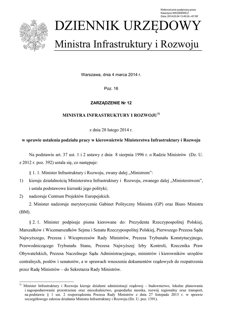 Elektronicznie podpisany przez Katarzyna WASZKIEWICZ Data: 2014.03.04 15:49:26 +01'00' DZIENNIK URZĘDOWY Ministra Infrastruktury i Rozwoju Warszawa, dnia 4 marca 2014 r. Poz. 16 ZARZĄDZENIE Nr 12 MINISTRA INFRASTRUKTURY I ROZWOJU1) z dnia 28 lutego 2014 r. w sprawie ustalenia podziału pracy w kierownictwie Ministerstwa Infrastruktury i Rozwoju Na podstawie art. 37 ust. 1 i 2 ustawy z dnia 8 sierpnia 1996 r. o Radzie Ministrów (Dz. U. z 2012 r. poz. 392) ustala się, co następuje: § 1. 1. Minister Infrastruktury i Rozwoju, zwany dalej „Ministrem”: 1) kieruje działalnością Ministerstwa Infrastruktury i Rozwoju, zwanego dalej „Ministerstwem”, i ustala podstawowe kierunki jego polityki; 2) nadzoruje Centrum Projektów Europejskich. 2. Minister nadzoruje merytorycznie Gabinet Polityczny Ministra (GP) oraz Biuro Ministra (BM). § 2. 1. Minister podpisuje pisma kierowane do: Prezydenta Rzeczypospolitej Polskiej, Marszałków i Wicemarszałków Sejmu i Senatu Rzeczypospolitej Polskiej, Pierwszego Prezesa Sądu Najwyższego, Prezesa i Wiceprezesów Rady Ministrów, Prezesa Trybunału Konstytucyjnego, Przewodniczącego Trybunału Stanu, Prezesa Najwyższej Izby Kontroli, Rzecznika Praw Obywatelskich, Prezesa Naczelnego Sądu Administracyjnego, ministrów i kierowników urzędów centralnych, posłów i senatorów, a w sprawach wnoszenia dokumentów rządowych do rozpatrzenia przez Radę Ministrów – do Sekretarza Rady Ministrów. 1) Minister Infrastruktury i Rozwoju kieruje działami administracji rządowej - budownictwo, lokalne planowanie i zagospodarowanie przestrzenne oraz mieszkalnictwo, gospodarka morska, rozwój regionalny oraz transport, na podstawie § 1 ust. 2 rozporządzenia Prezesa Rady Ministrów z dnia 27 listopada 2013 r. w sprawie szczegółowego zakresu działania Ministra Infrastruktury i Rozwoju (Dz. U. poz. 1391). Dziennik Urzędowy Ministra Infrastruktury i Rozwoju –2– Poz. 16 2. Do wyłącznej kompetencji Ministra zastrzegam: 1) akceptowanie projektów: założeń do projektów ustaw, ustaw, rozporządzeń i uchwał Rady Ministrów oraz strategii, programów i polityk, kierowanych przez Ministra do uzgodnień, konsultacji publicznych i opiniowania; 2) występowanie do Prezesa Rady Ministrów o powołanie lub odwołanie z określonych stanowisk lub funkcji; 3) powoływanie i wyznaczanie, a także odwoływanie i cofanie wyznaczenia na określone stanowiska lub funkcje, w ramach właściwości wynikającej z obowiązujących przepisów. 3. Sekretarze i Podsekretarze Stanu, każdy w zakresie określonym zarządzeniem, są upoważnieni, z zastrzeżeniem ust. 11 i 12, do załatwiania spraw w imieniu Ministra, w tym do przyjmowania interesantów w sprawach skarg i wniosków. 4. Sekretarz Stanu Adam Zdziebło podpisuje pisma kierowane do Sekretarza Stałego Komitetu Rady Ministrów w sprawach dokumentów rządowych wnoszonych na posiedzenia Komitetu oraz rozpatrywanych przez Komitet, a także w sprawach zastrzeżeń do treści protokołów z posiedzeń Komitetu wraz z wnioskami o ich sprostowanie. 5. Sekretarz Stanu Adam Zdziebło podpisuje w zastępstwie Ministra akty wykonawcze do ustaw, komunikaty oraz obwieszczenia. 6. Podsekretarz Stanu Paweł Orłowski podpisuje korespondencję w zakresie związanym z wykonywaniem funkcji koordynatora prac Zespołu do spraw Oceny Skutków Regulacji. 7. Podsekretarz Stanu Iwona Wendel, a w razie jej nieobecności osoba zastępująca, podpisuje pisma kierowane do Sekretarza Komitetu Rady Ministrów do spraw Cyfryzacji w sprawach dokumentów rządowych wnoszonych na posiedzenia Komitetu oraz rozpatrywanych przez Komitet, a także w sprawach zastrzeżeń do treści protokołów z posiedzeń Komitetu wraz z wnioskami o ich sprostowanie. 8. Podsekretarz Stanu Marcin Kubiak, a w razie jego nieobecności osoba zastępująca, podpisuje pisma kierowane do Sekretarza Komitetu do Spraw Europejskich w sprawach dokumentów rządowych wnoszonych na posiedzenia Komitetu oraz rozpatrywanych przez Komitet, a także w sprawach zastrzeżeń do treści protokołów z posiedzeń Komitetu wraz z wnioskami o ich sprostowanie. 9. Sekretarze Stanu, Podsekretarze Stanu i Dyrektor Generalny podpisują, z upoważnienia Ministra, pisma w zakresie nadzorowanej problematyki, a w szczególności: 1) do Szefa Kancelarii Prezesa Rady Ministrów, przesyłające opracowane w Ministerstwie stanowiska Rządu do poselskich projektów ustaw, po ich rozpatrzeniu przez Radę Ministrów; Dziennik Urzędowy Ministra Infrastruktury i Rozwoju 2) –3– Poz. 16 przesyłające opracowane w Ministerstwie projekty dokumentów rządowych, kierowane do uzgodnień, konsultacji publicznych i opiniowania; 3) zawierające uwagi do projektów zgłaszanych w toku uzgodnień międzyresortowych; 4) odpowiedzi na interpelacje, interwencje, zapytania i wystąpienia poselskie oraz na oświadczenia i wystąpienia senatorskie skierowane do Ministra; 5) do posłów i senatorów, w sprawach zgłaszanych skarg i interwencji. 10. Pisma, o których mowa w ust. 1 i 9, powinny być przygotowane na blankiecie Ministra i parafowane przez właściwego merytorycznie kierownika komórki organizacyjnej, a przedkładane do podpisu Ministra – zaaprobowane również przez członka kierownictwa Ministerstwa nadzorującego właściwą merytorycznie komórkę organizacyjną. 11. Wydawanie decyzji administracyjnych, postanowień i zaświadczeń, udzielanie odpowiedzi na skargi przewidziane w ustawie Prawo o postępowaniu przed sądami administracyjnymi, wnoszenie środków odwoławczych oraz innych pism procesowych w postępowaniach przed sądami administracyjnymi, powszechnymi oraz Sądem Najwyższym, a także pism przedsądowych w sprawach cywilnych i pism w postępowaniu egzekucyjnym wymaga odrębnego upoważnienia. 12. Złożenie przez Sekretarzy Stanu lub Podsekretarzy Stanu oświadczenia woli w imieniu Ministra wymaga uprzedniego uzyskania pełnomocnictwa w formie prawem przewidzianej. § 3. 1. Se
