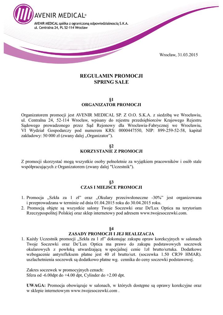 Wrocław, 31.03.2015 REGULAMIN PROMOCJI SPRING SALE §1 ORGANIZATOR PROMOCJI Organizatorem promocji jest AVENIR MEDICAL SP. Z O.O. S.K.A. z siedzibą we Wrocławiu, ul. Centralna 24, 52-114 Wrocław, wpisany do rejestru przedsiębiorców Krajowego Rejestru Sądowego prowadzonego przez Sąd Rejonowy dla Wrocławia-Fabrycznej we Wrocławiu, VI Wydział Gospodarczy pod numerem KRS: 0000447550, NIP: 899-259-52-58, kapitał zakładowy: 50 000 zł (zwany dalej „Organizator”). §2 KORZYSTANIE Z PROMOCJI Z promocji skorzystać mogą wszystkie osoby pełnoletnie za wyjątkiem pracowników i osób stale współpracujących z Organizatorem (zwany dalej "Uczestnik"). §3 CZAS I MIEJSCE PROMOCJI 1. Promocja „Szkła za 1 zł” oraz „Okulary przeciwsłoneczne -30%” jest organizowana i przeprowadzana w terminie od dnia 01.04.2015 roku do 30.04.2015 roku. 2. Promocją objęte są wszystkie salony Twoje Soczewki oraz De'Lux Optica na terytorium Rzeczypospolitej Polskiej oraz sklep internetowy pod adresem www.twojesoczewki.com. §4 ZASADY PROMOCJI I JEJ REALIZACJA 1. Każdy Uczestnik promocji „Szkła za 1 zł” dokonując zakupu opraw korekcyjnych w salonach Twoje Soczewki oraz De’Lux Optica ma prawo do zakupu podstawowych soczewek okularowych z powłoką utwardzającą w specjalnej cenie 1zł brutto/sztuka. Dodatkowe wzbogacenie antyrefleksem płatne jest 40 zł brutto/szt. (soczewka 1.50 CR39 HMAR). uszlachetnienia soczewek są dodatkowo płatne wg. cennika do ceny soczewki podstawowej. Zakres soczewek w promocyjnych cenach: Sfera od -6.00dpt do +4.00 dpt, Cylinder do +2.00 dpt. UWAGA: Promocja obowiązuje w salonach, w których dostępne są oprawy korekcyjne oraz w sklepie internetowym www.twojesoczewki.com . 2. Każdy Uczestnik promocji „Okulary przeciwsłoneczne -30%” dokonujący zakupu okularów przeciwsłonecznych w salonach Twoje Soczewki, De’Lux Optica oraz w sklepie internetowym www.twojesoczewki.com ma prawo do skorzystania ze specjalnego 30% rabatu. 3. Promocje wymienione powyżej nie łączą się z pozostałymi rabatami, innymi akcjami promocyjnymi oraz Kartą Stałego Klienta. §5 REALIZACJA PROMOCJI W SKLEPIE INTERNETOWYM 1. Po wyborze oprawy i usługi montażu Klient chcąc skorzystać z promocji „Szkła za 1 zł” powinien dołożyć do koszyka produkt soczewki okularowe PROMOCJA - 1.50 CR39 HC lub wybrać produkt PROMOCJA - 1.50 CR39 HMAR, jeśli chce kupić soczewki z powłoką antyrefleksyjną z dopłatą. 2. Po wyborze okularów przeciwsłonecznych Klient chcąc skorzystać z rabatu powinien dołożyć do koszyka wybrany model okularów w atrakcyjnej cenie, obniżonej o 30%. §6 POSTANOWIENIA KOŃCOWE 1. Udział Uczestnika w promocji oznacza jego akceptację zasad promocji zawartych w niniejszym Regulaminie. 2. Regulamin promocji dostępny jest na stronie internetowej www.twojesoczewki.com . 3. Organizatorzy zastrzegają sobie prawo dokonywania zmian w niniejszym Regulaminie.