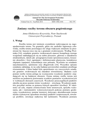 MIDDLE POMERANIAN SCIENTIFIC SOCIETY OF THE ENVIRONMENT PROTECTION ŚRODKOWO-POMORSKIE TOWARZYSTWO NAUKOWE OCHRONY ŚRODOWISKA Annual Set The Environment Protection Rocznik Ochrona Środowiska Volume/Tom 16. Year/Rok 2014 ISSN 1506-218X 562–579 Zmiany rzeźby terenu obszaru pogórniczego Anna Oliskiewicz-Krzywicka, Piotr Stachowski Uniwersytet Przyrodniczy, Poznań 1. Wstęp Rzeźba terenu jest istotnym czynnikiem wpływającym na zagospodarowanie terenu. Na gruntach, gdzie nie zachodzi ingerencja człowieka, rzeźba terenu pozostająca nie ulega większym zmianom na przestrzeni lat. Inaczej rzecz ma się z gruntami zwałowanymi. Według Woźniaka [16], osiadanie gruntów zwałowanych stanowi kompilację szeregu wzajemnie nakładających się na siebie procesów, głównie o charakterze strukturalnym, takich jak: przegrupowywanie (przemieszczanie), kruszenie okruchów i brył, zgniatanie i deformowanie plastyczne, kontaktowe zlepianie (spajanie), konsolidacja oraz pełzanie. Wyróżnia on osiadanie natychmiastowe, opóźnione oraz długotrwałe [16]. Wszystkie opisane osiadania zakładają, że na całej badanej powierzchni osiadanie przebiega równomiernie. Celem badań było sprawdzenie czy rzeczywiście osiadanie gruntów zwałowanych ma charakter równomierny. Badania czyli pomiar rzeźby terenu polega na wyznaczeniu wysokości punktów znajdujących się na badanym obszarze. Ocena zmiany rzeźby terenu jest możliwa na podstawie porównania wyników pomiarów wysokościowych w wybranych okresach czasowych. Wysokości poszczególnych punktów określa się przez pomiar różnic wysokości – niwelację. Wysokości punktów pozyskać można za pomocą różnych sposobów niwelacji. W zależności od celu, stopnia zróżnicowania form terenowych, sposobu wykonania, jak i instrumentów wykorzystywanych podczas pomiaru geodezyjny wysokościowy pomiar terenowy dotyczący ukształtowania terenu można wykonywać sposobem niwelacji punktów rozproszonych, niwelacji profilów, niwelacji siatkowej lub tachimetrii. Wynikiem pomiaru Zmiany rzeźby terenu obszaru pogórniczego 563 rzeźby terenu jest zilustrowanie jej na mapie w postaci warstwic lub utworzenie numerycznego modelu terenu, zdefiniowanego przez Gaździckiego [2], jako „numeryczną reprezentację powierzchni terenowej, utworzonej poprzez zbiór odpowiednio wybranych punktów leżących na tej powierzchni oraz algorytmów interpolacyjnych umożliwiających jej odtworzenie w określonym obszarze” W literaturze przedmiotu dotyczącej antropogenicznych zmian rzeźby terenu [8,9] brak pozycji dotyczących zmiany rzeźby terenu gruntów pogórniczych, co skłoniło autorów do podjęcia takich badań. Zarys historii tworzenia i charakterystyka złóż antropogenicznych KWB Konin przedstawiona jest w pracy Widery i Szczurka [15]. Grunty pogórnicze poddawane są rekultywacji technicznej i w zależności od przeznaczenia często również rekultywacji rolniczej oraz zagospodarowaniu rolniczemu. Zagadnienie dotyczące sposobu ustalenia użytkowania gruntów pogórniczych przy zastosowaniu różnych kryteriów i atrybutów przedstawione jest w pracy Bangian i in. [1]. Z publikacji dotyczących rekultywacji gruntów pogórniczych wymienić można m.in.: na terenach KWB w Koninie – Gilewską i Otrembę [3,4,11] a na terenie województwa lubuskiego – Kołodziejczyk [7]. 2. Cel, zakres i metody badań Celem pracy było badanie zmiany rzeźby terenu na wybranym fragmencie gruntu pogórniczego. W pracy przyjęto założenie, że na gruntach zwałowych, które zostały poddane rekultywacji technicznej a następnie rolniczej osiadanie ma charakter równomierny. Założono zgodnie z Polską Normą PrPN-G-07800 [10], że optymalne spadki w mikrorzeźbie zwałowiska powinny wynosić do 3%, przy rolniczym kierunku zagospodarowania. Teren badań stanowił fragment zwałowiska wewnętrznego odkrywki Kazimierz Północ” Kopalni Węgla Brunatnego w Koninie, położonego na Pojezierzu Kujawskim. Zgodnie z poz. 2.12.1.a ww. Normy [10], z uwagi na lokalizację względem wyrobiska eksploatacyjnego i położenia wysokościowego jego wierzchowiny teren zalicza się do II typu zwałowisk wewnętrznych o wierzchowinie leżącej na poziomie terenów przyległych. Po zakończonej w 1998 roku rekultywacji technicznej, przeprowadzonej przez KWB ”Konin” na badanym zwałowisku rol- 564 Anna Oliskiewicz-Krzywicka, Piotr Stachowski nicy indywidualni rozpoczęli rekultywację rolniczą. W 2000 roku na potrzeby Instytutu Melioracji, Kształtowania Środowiska i Geodezji, wytyczono na tym obszarze 8 powierzchni doświadczalnych. Powierzchnie te wydzielono z istniejących pól, zlokalizowanych prostopadle do przebiegającej drogi. Wytyczone powierzchnie doświadczalne stanowiły przylegające do siebie cztery pola o wymiarach 32 x 100 m i cztery pola o szerokości 24 x 100 m. Właściciel gruntów rolnik, który nabył i uprawiał te grunty od 1998 roku informował, że od momentu prowadzenia rekultywacji rolniczej miał problemy z nierównomiernym osiadaniem gruntu na uprawianych polach i tworzeniu się zastoisk wodnych (fot. 1). Pomiary terenowe przeprowadzono na 8 powierzchniach doświadczalnych i przylegającym do nich rowie odwadniającym. Fot. 1. Fragment zwałowiska z występującymi zastoiskami wodnymi Photo 1. Dump section with isolated still water pools Badania terenowe obejmujące pomiary rzeźby terenu polegały na wyznaczeniu wysokości punktów za pomocą niwelacji powierzchniowej. Niwelację przeprowadzono w trzech okresach czasowych w 2000, 2005 i 2010 roku. Dla zachowania dokładności pomiarów i eliminacji ewentualnych błędów związanych techniką pomiaru jak i instrumentów wykorzystywanych podczas pomiaru we wszystkich okresach zastosowano ten sam sposób niwelacji. Do dokładnego pomiaru rzeźby na terenach otwartych i poziomych takich jak tereny sztucznie wyrównane, posłużyła niwelacja siatkowa. Polegała na określeniu wysokości 